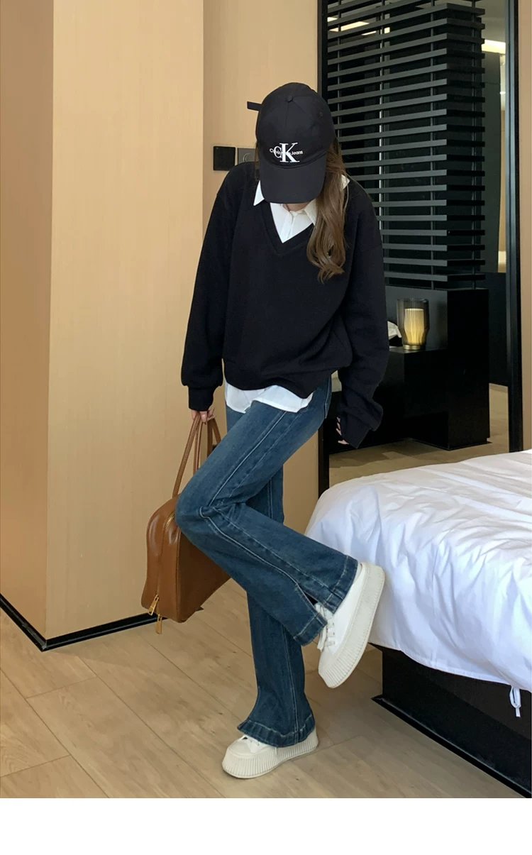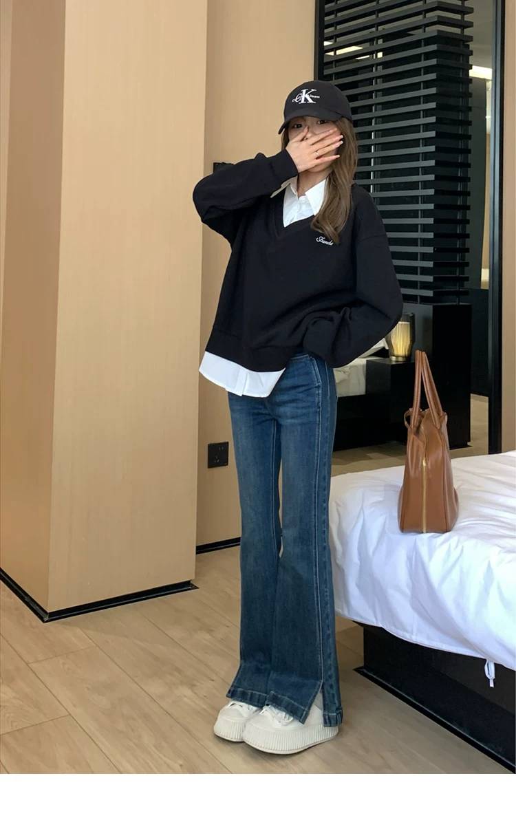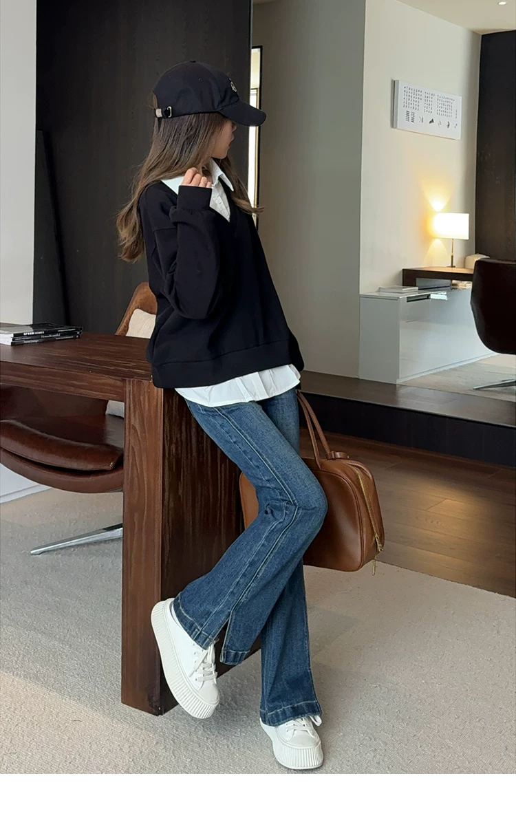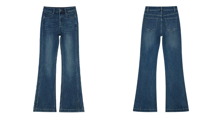 - Quần ống loe dành cho nữ, kiểu dáng thu đông mới, cỡ lớn, lót lông cừu, dày dặn, cạp cao, che hông, co giãn, tôn dáng, quần denim ống loe.