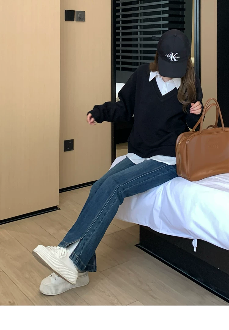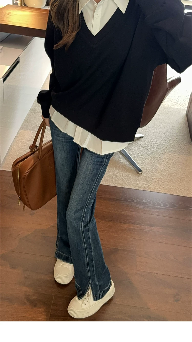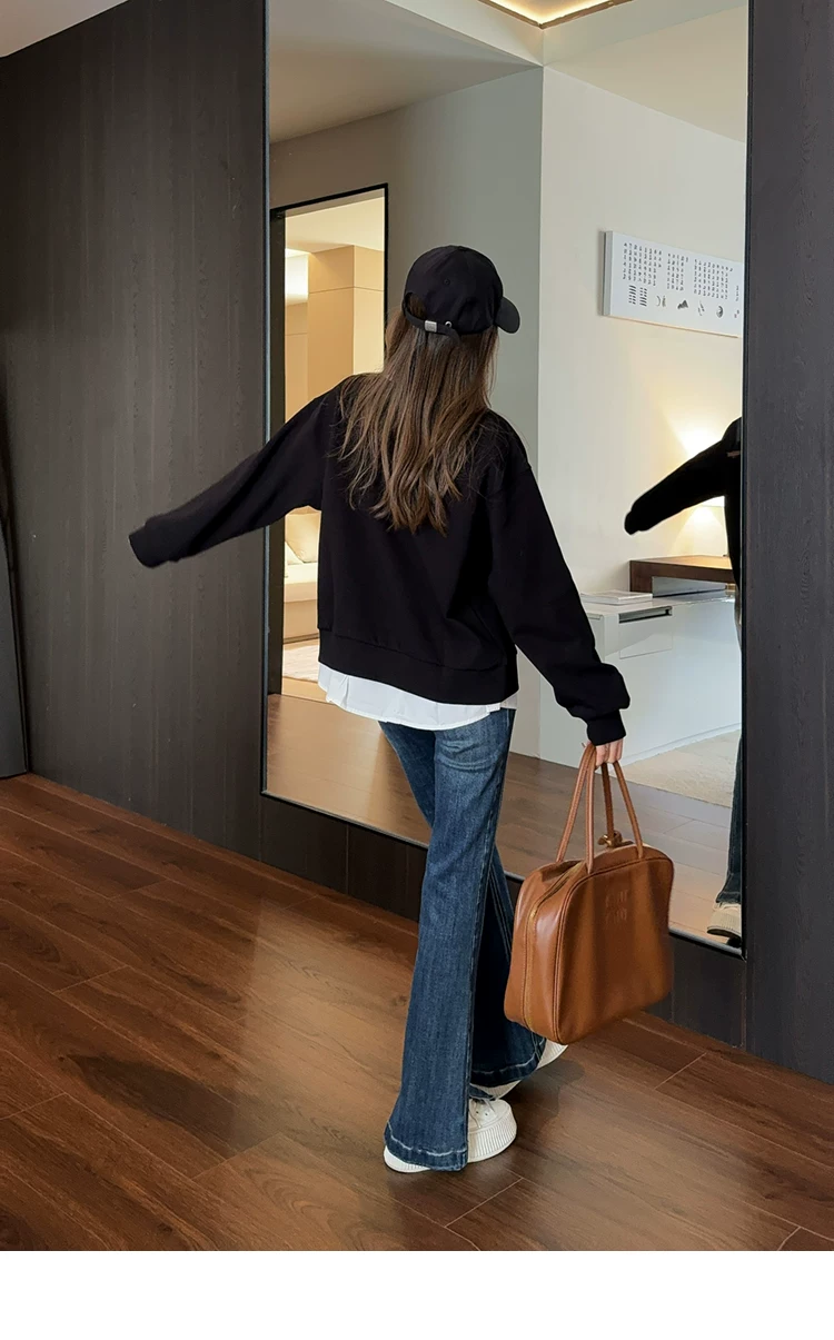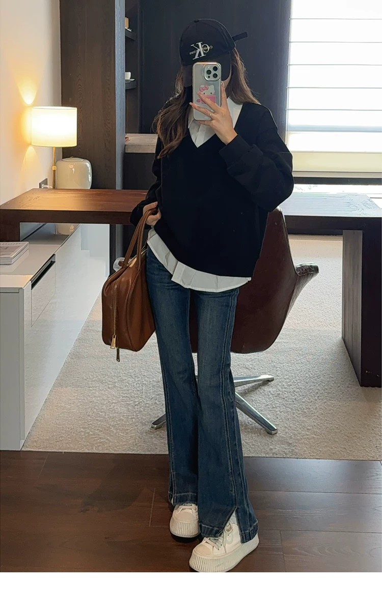 - Quần ống loe dành cho nữ, kiểu dáng thu đông mới, cỡ lớn, lót lông cừu, dày dặn, cạp cao, che hông, co giãn, tôn dáng, quần denim ống loe.
