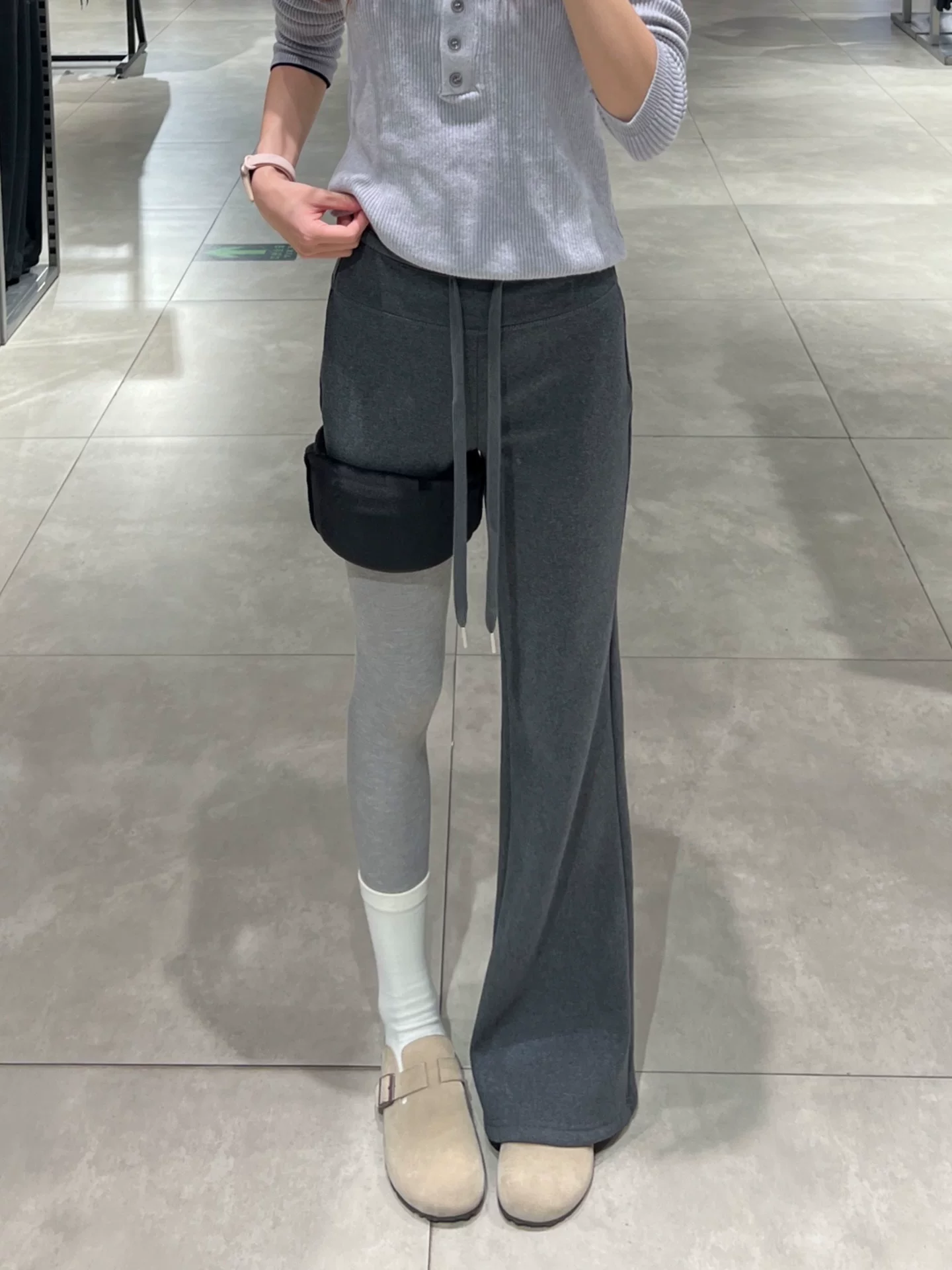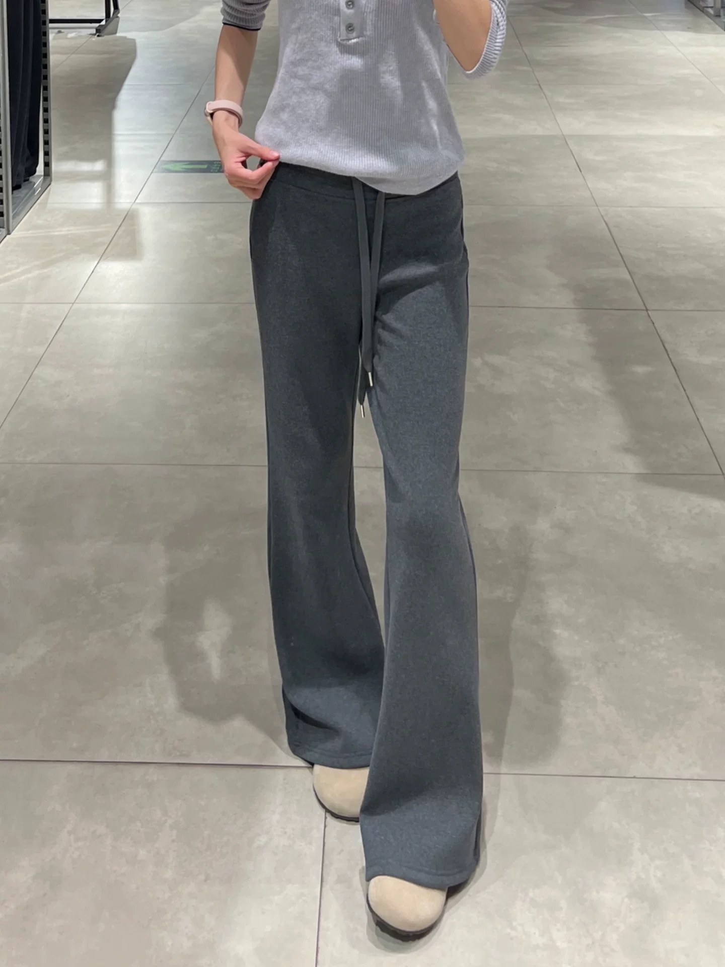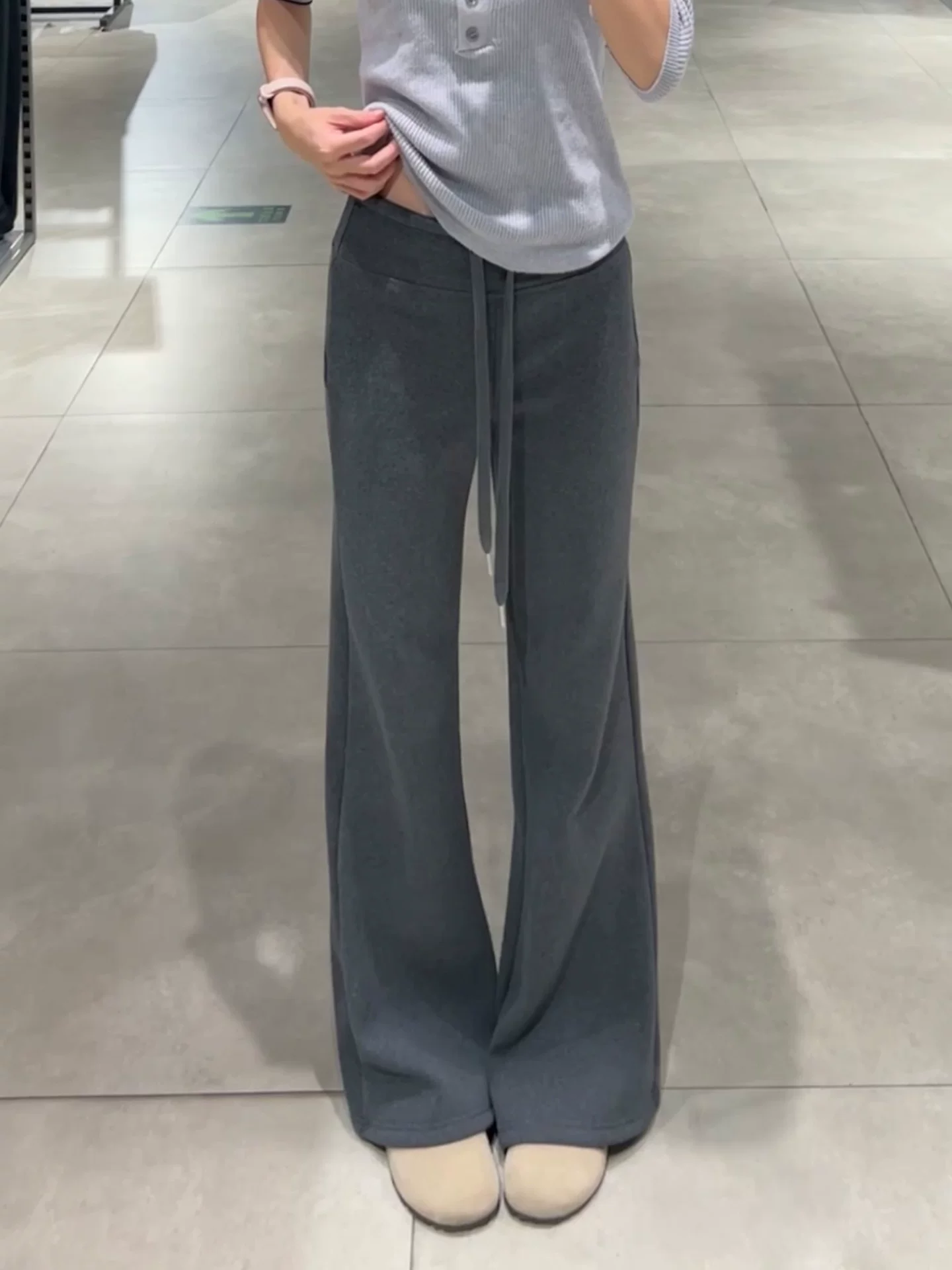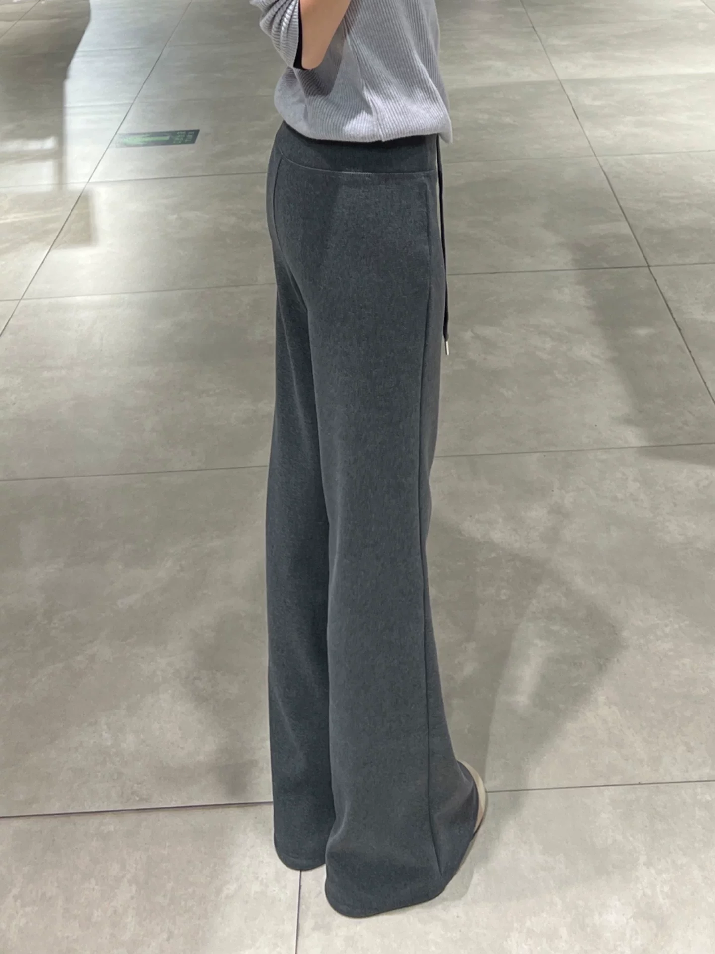 Quần ống loe màu xám đậm dành cho nữ, mùa thu đông, cỡ lớn, lót lông cừu, dày dặn, cạp cao, dáng suôn, tôn dáng, quần ống rộng.