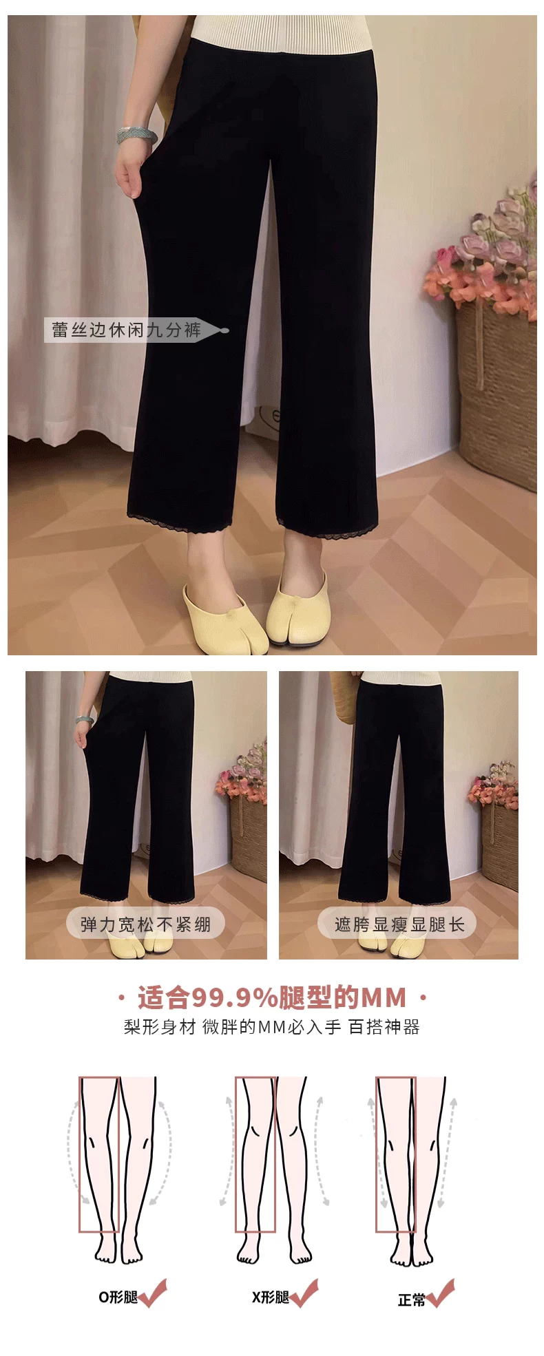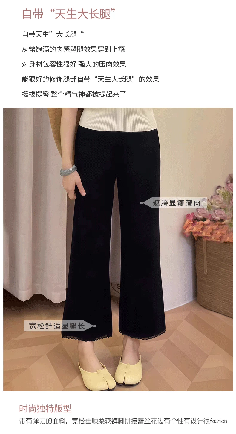 Quần ống loe viền ren dành cho nữ, kiểu dáng mỏng mùa hè, cỡ lớn, lưng cao, dáng suôn, tôn dáng, dài chín phần, quần ống chuông bằng vải lụa băng.
