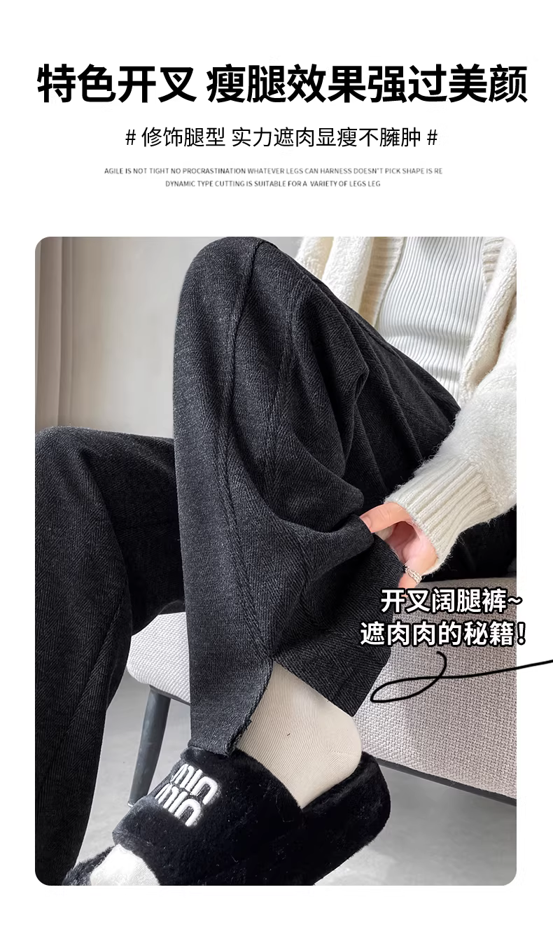 Quần ống rộng bằng len cho nữ, mùa thu đông, cực dài, có xẻ tà, lót lông cừu, dày dặn, giả len, ống thẳng, ôm vừa vặn, quần elm.