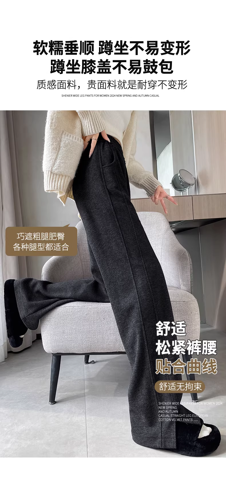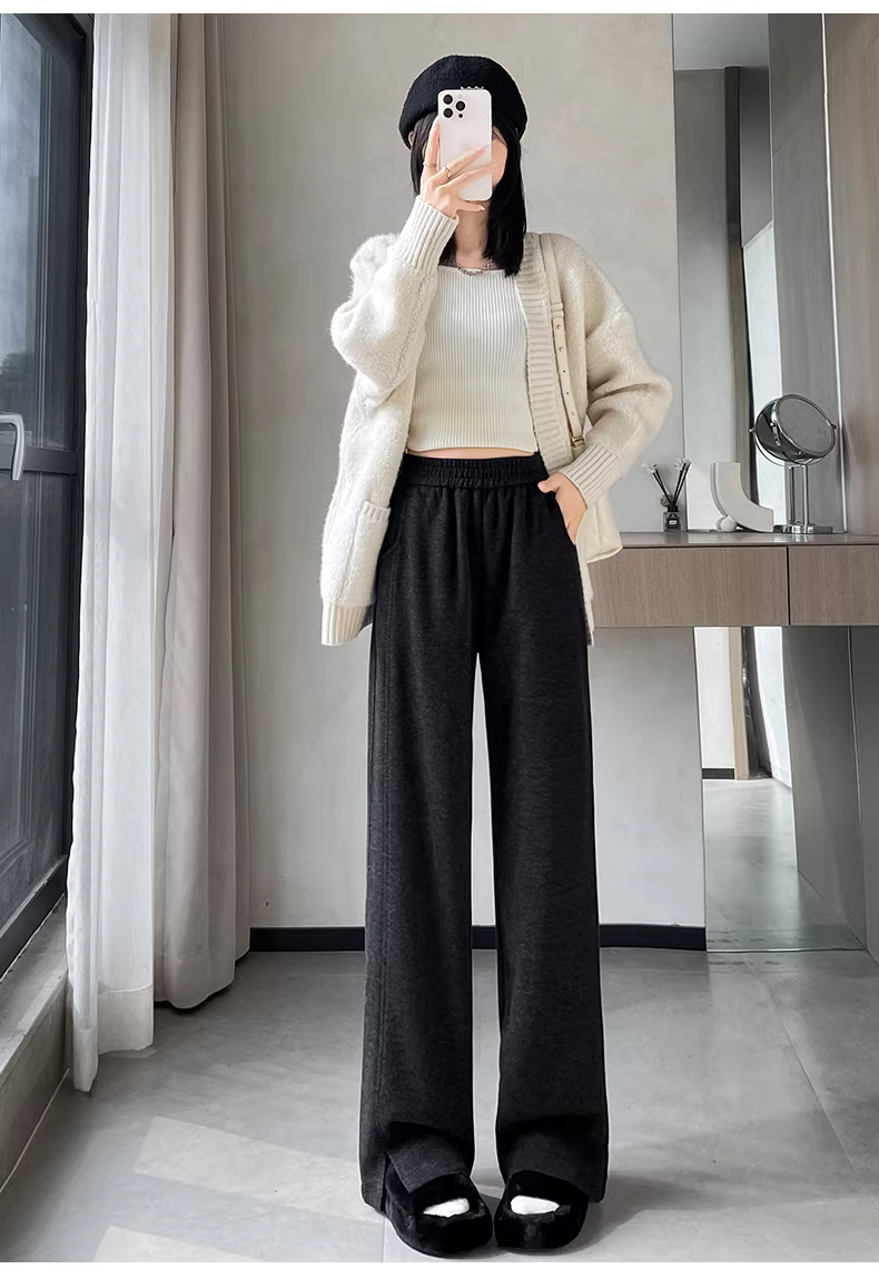 - Quần ống rộng bằng len cho nữ, mùa thu đông, cực dài, có xẻ tà, lót lông cừu, dày dặn, giả len, ống thẳng, ôm vừa vặn, quần elm.