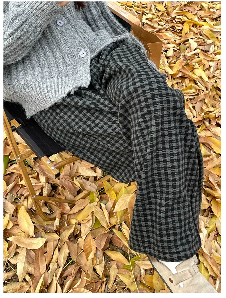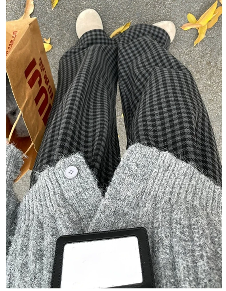 - Quần ống rộng bằng len dày có lót lông cừu kẻ sọc màu đen và xám cổ điển dành cho nữ, cỡ lớn mùa đông, cạp cao, dáng suôn, quần thường ngày giúp thon gọn.