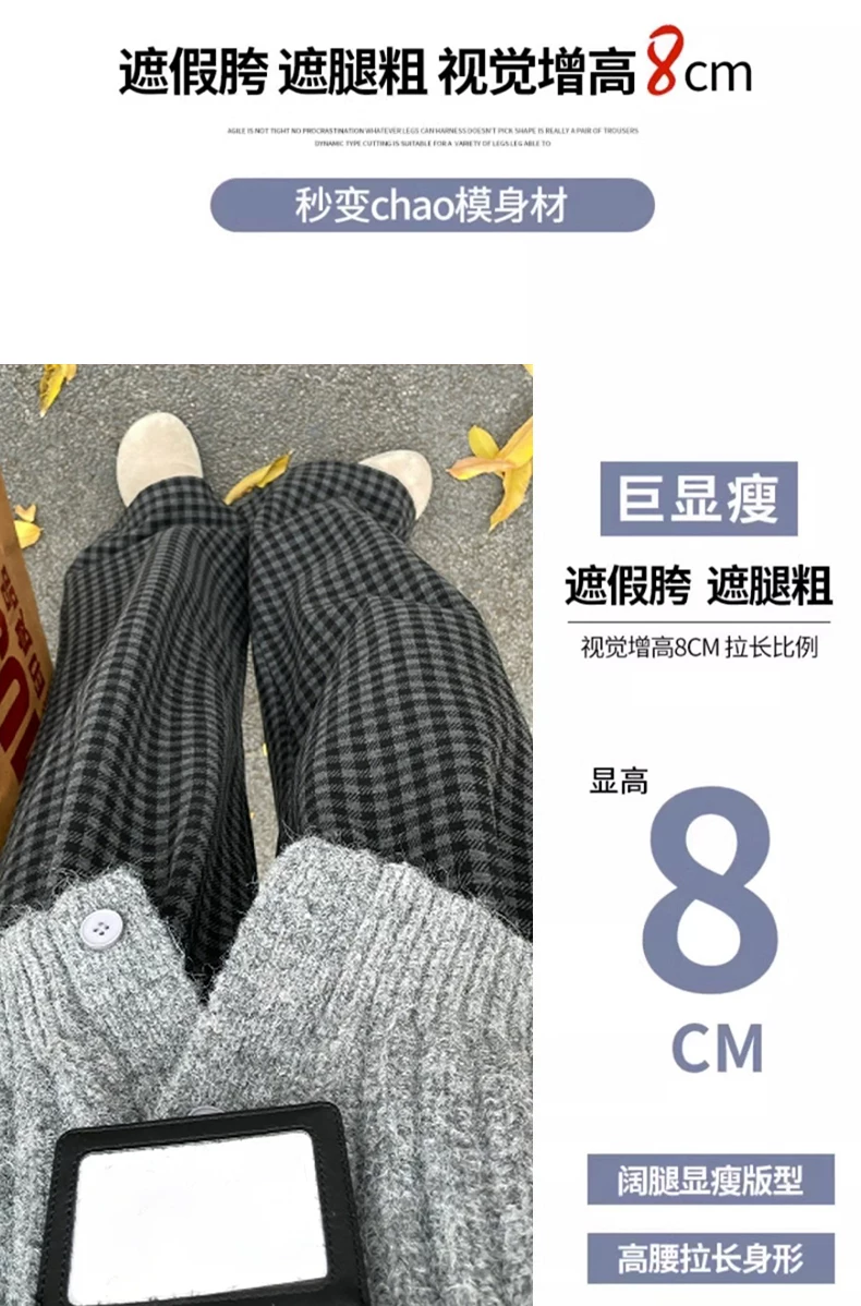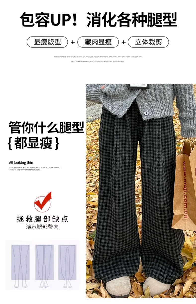 Quần ống rộng bằng len dày có lót lông cừu kẻ sọc màu đen và xám cổ điển dành cho nữ, cỡ lớn mùa đông, cạp cao, dáng suôn, quần thường ngày giúp thon gọn.