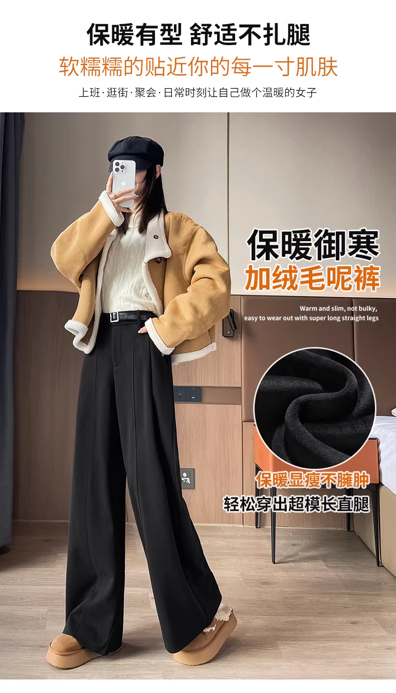 Quần ống rộng bằng len màu xám dành cho nữ, mùa thu đông, lót lông cừu và dày dặn, quần dài cực dài dành cho nữ cao, quần đi bộ, quần dài ngang sàn.