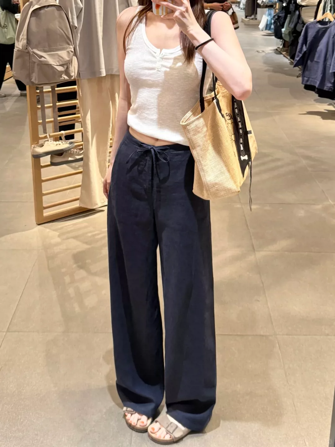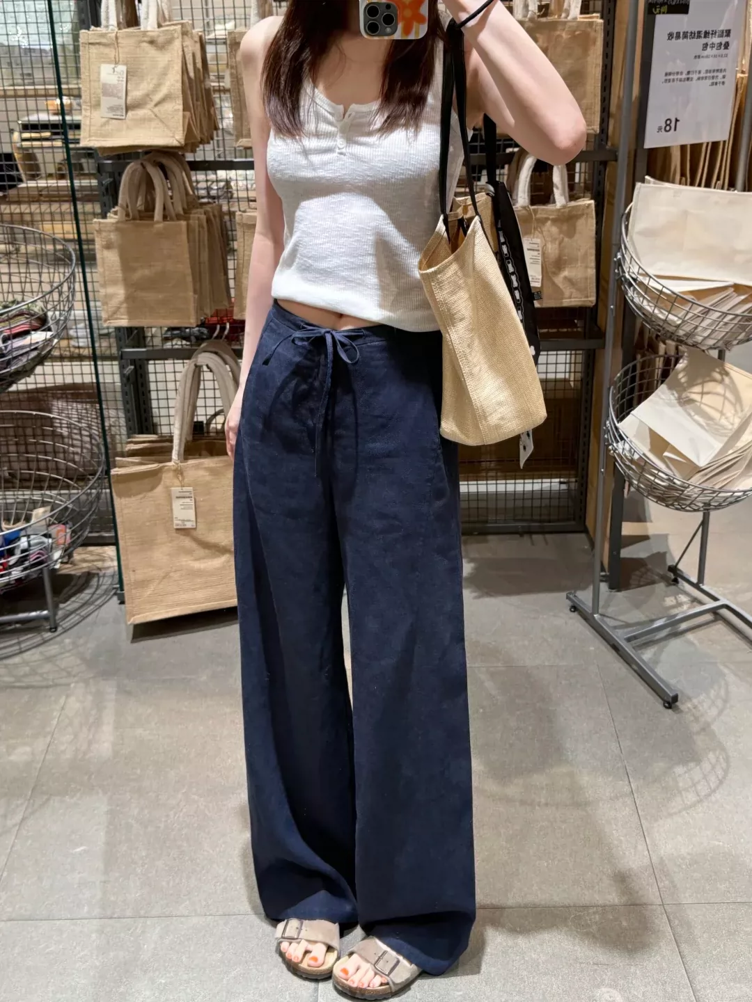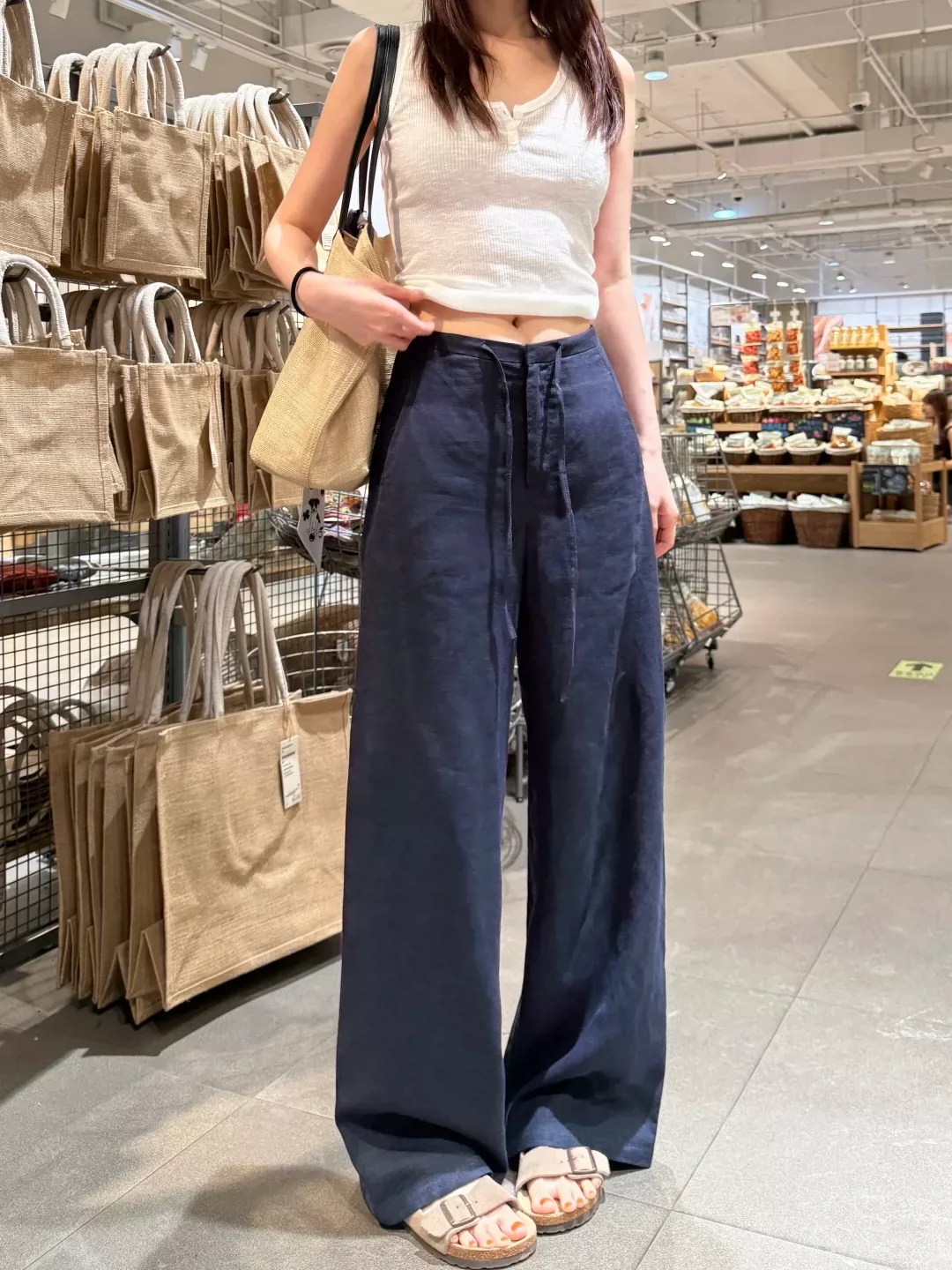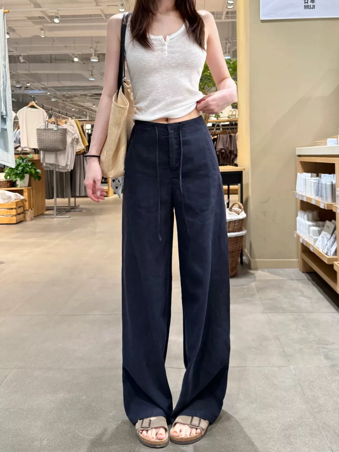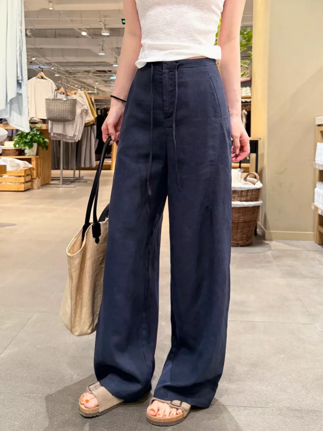 - Quần ống rộng bằng vải cotton-linen màu xanh hải quân dành cho nữ, kiểu dáng mỏng mùa hè, cỡ lớn, lưng cao, vải lụa băng, dáng suôn, quần ống thẳng thông thường.