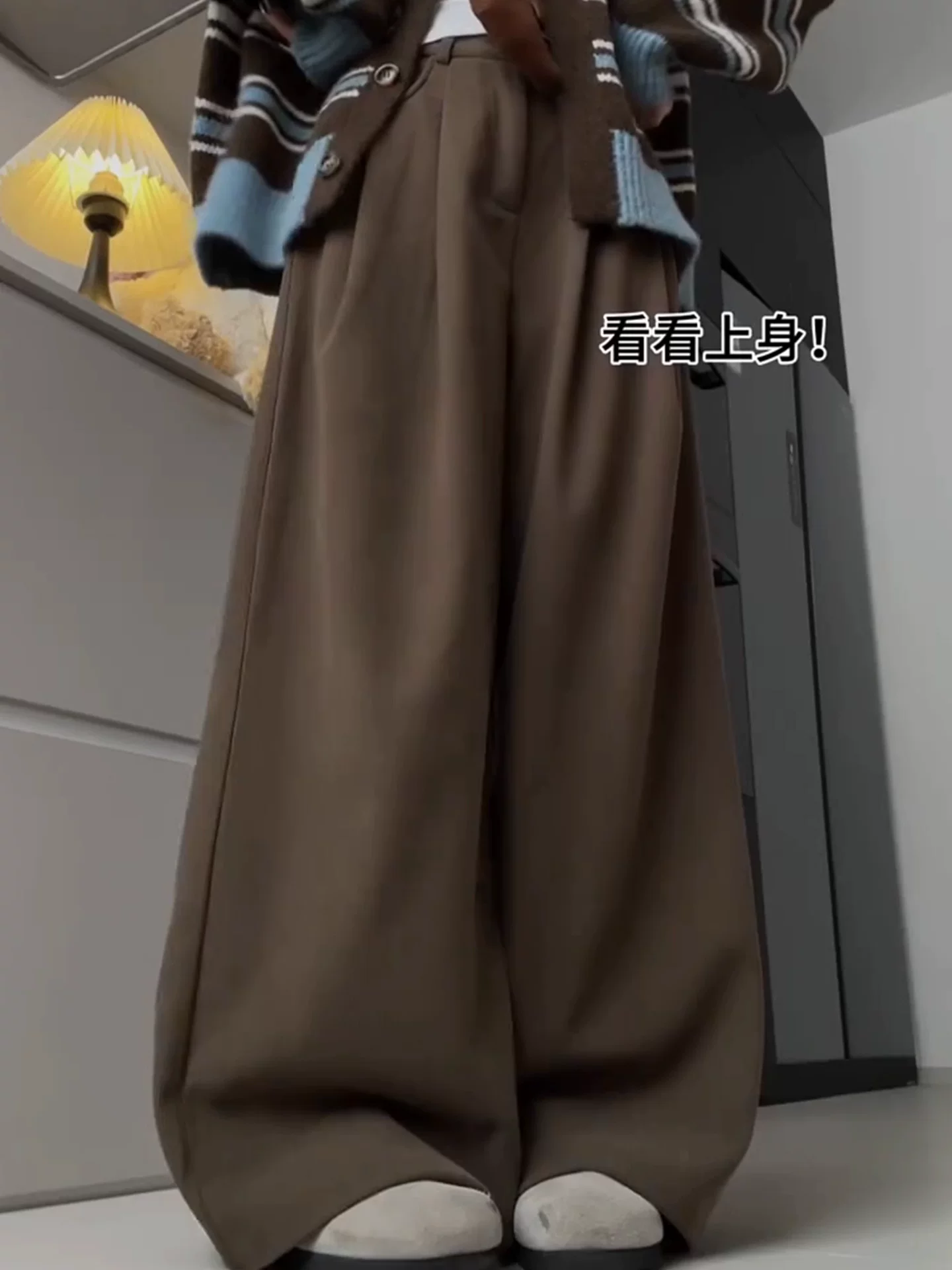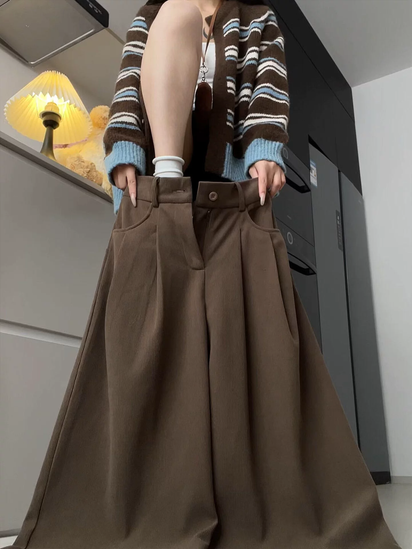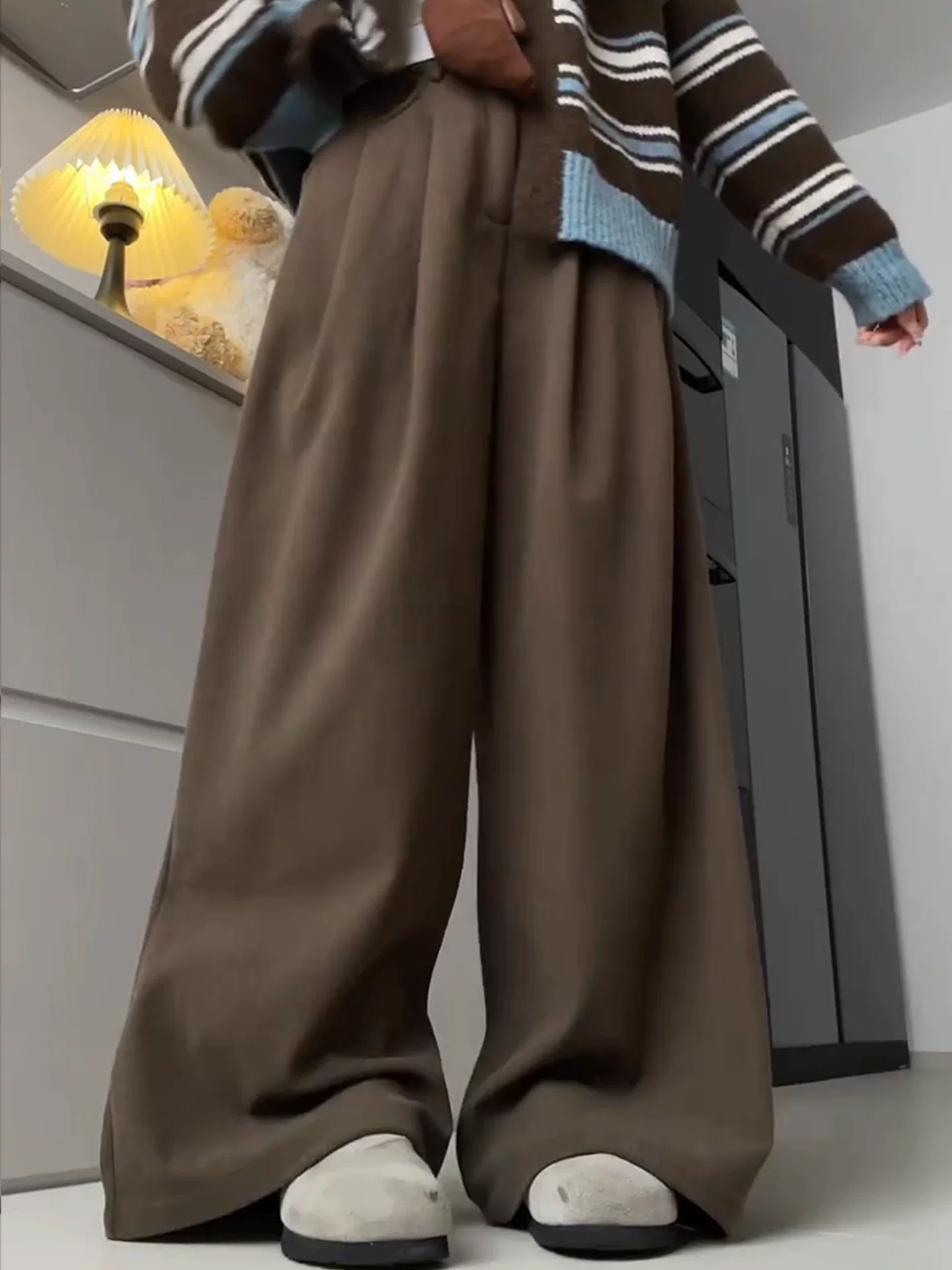Quần ống rộng bằng vải nhung màu cà phê Melard dành cho nữ, lót lông cừu mùa đông, dày dặn, cỡ lớn, lưng cao, dáng rộng, giảm béo, quần thường ngày.