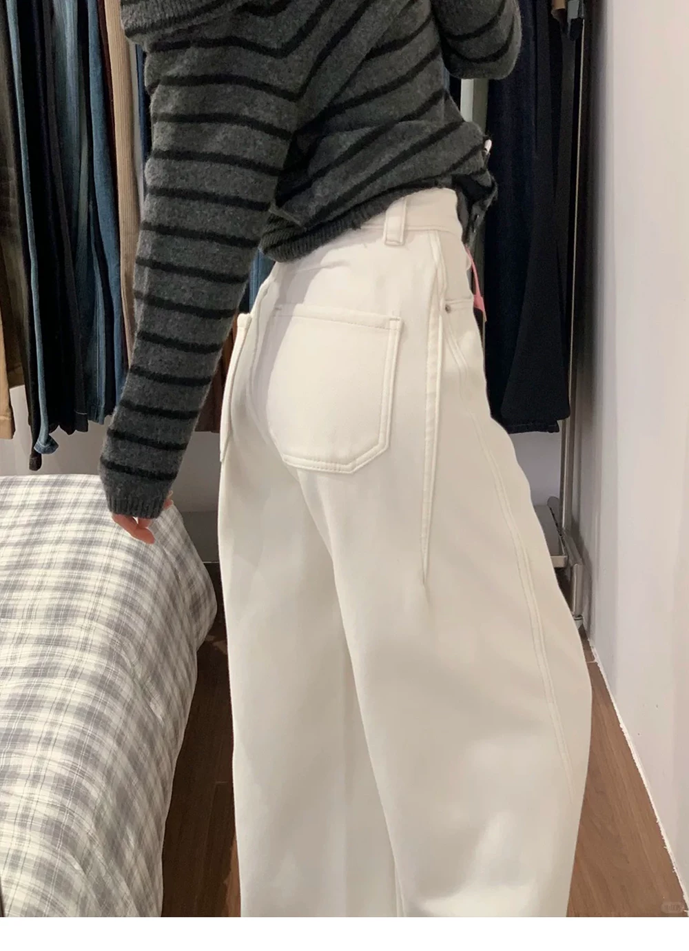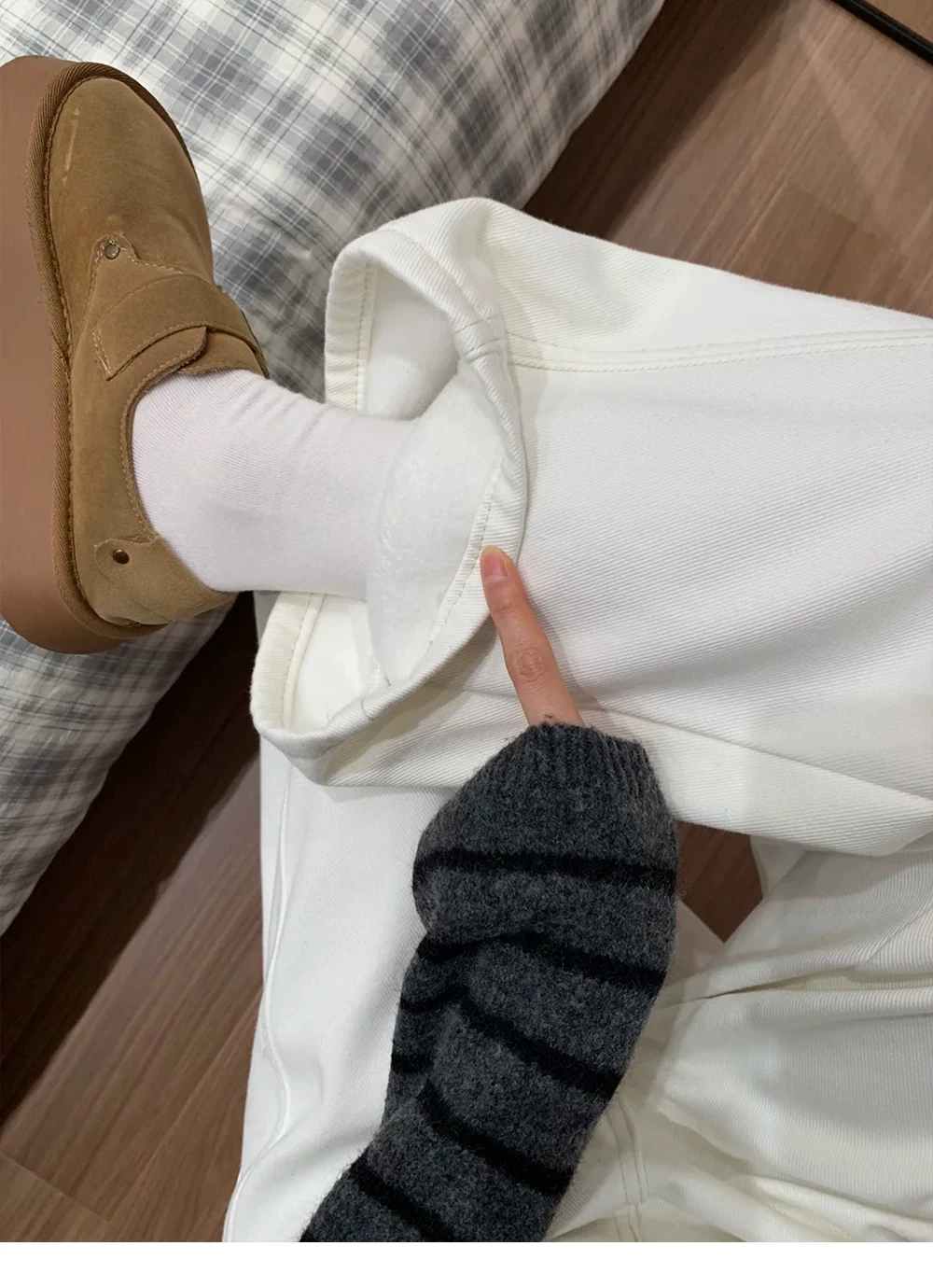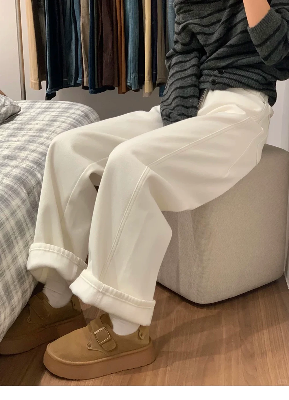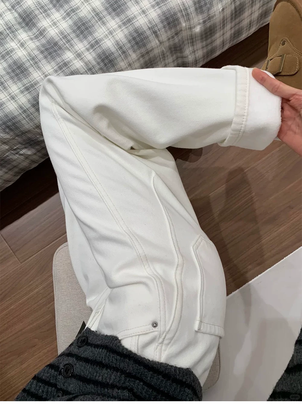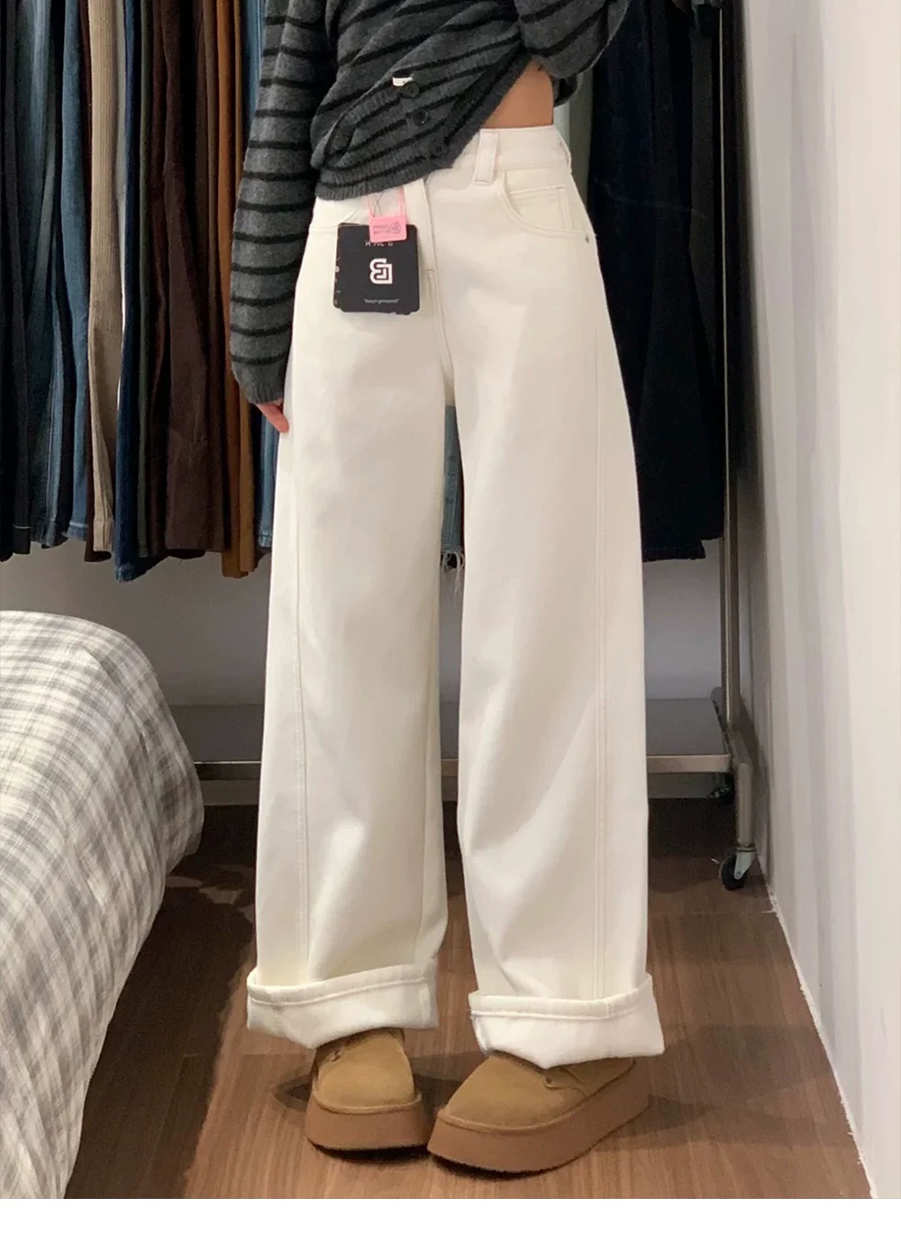 - Quần ống rộng dày lót lông cừu màu trắng dành cho nữ, cỡ lớn mùa đông, lưng cao, dáng rộng, giảm béo, quần jean dáng quả lê.