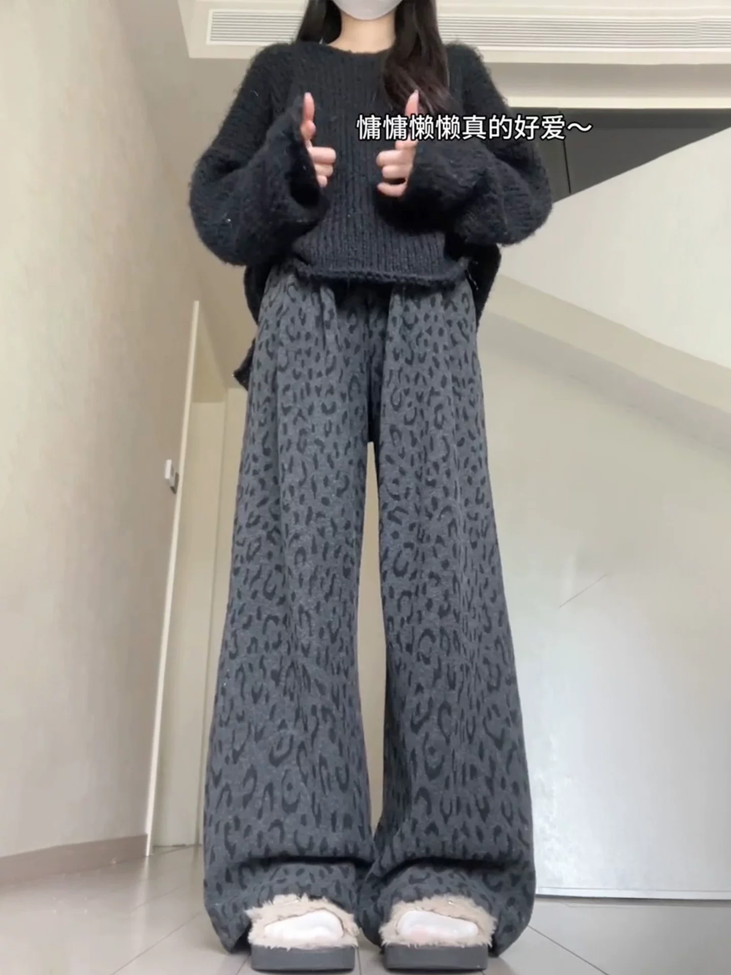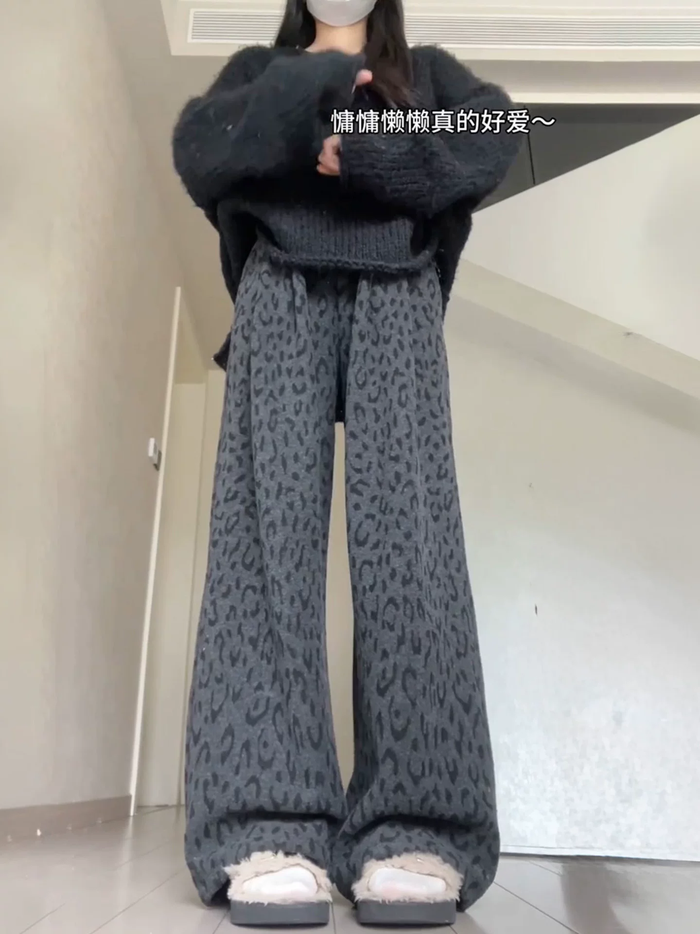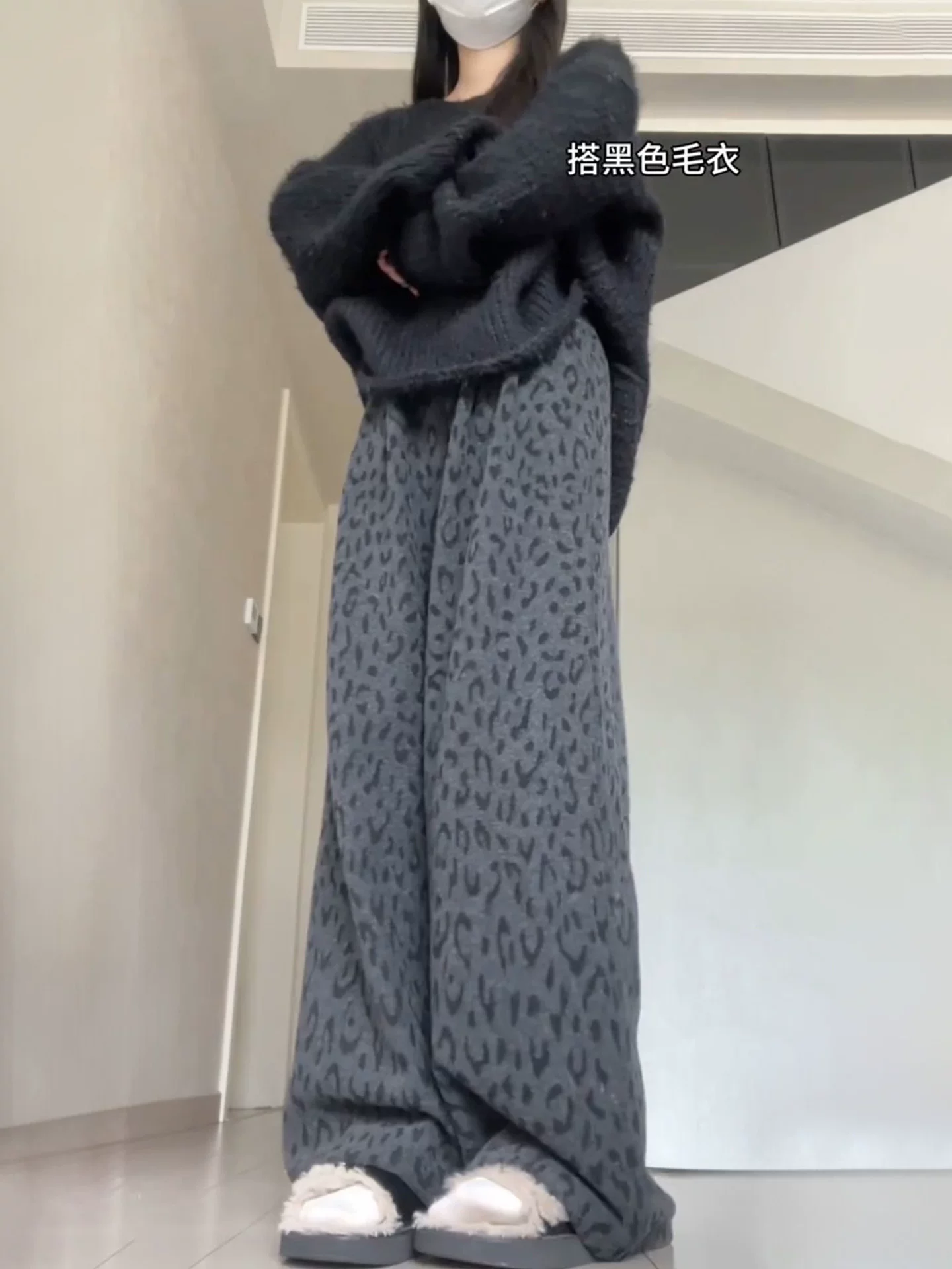 Quần ống rộng họa tiết da báo cổ điển dành cho nữ, mùa thu đông, cỡ lớn, lưng cao, dáng rộng, thon gọn, mềm mại, lót lông cừu, dày dặn, quần dài thường ngày.