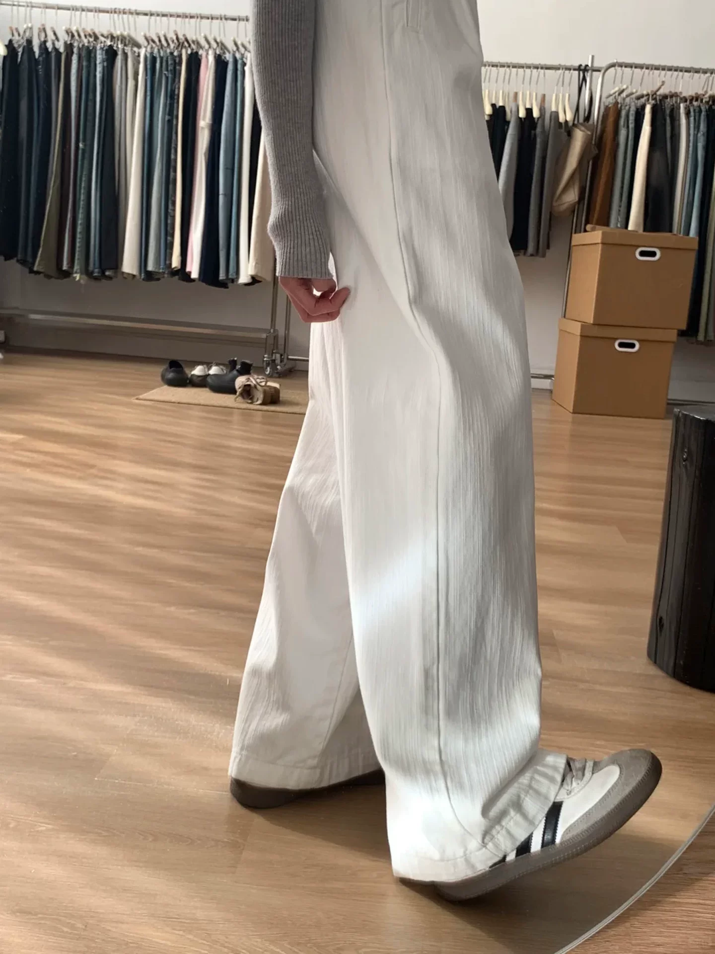 - Quần ống rộng họa tiết trắng dành cho nữ, phong cách đầu thu, cỡ lớn, lưng cao, che hông, giảm béo, dáng quả lê, quần dài thường ngày