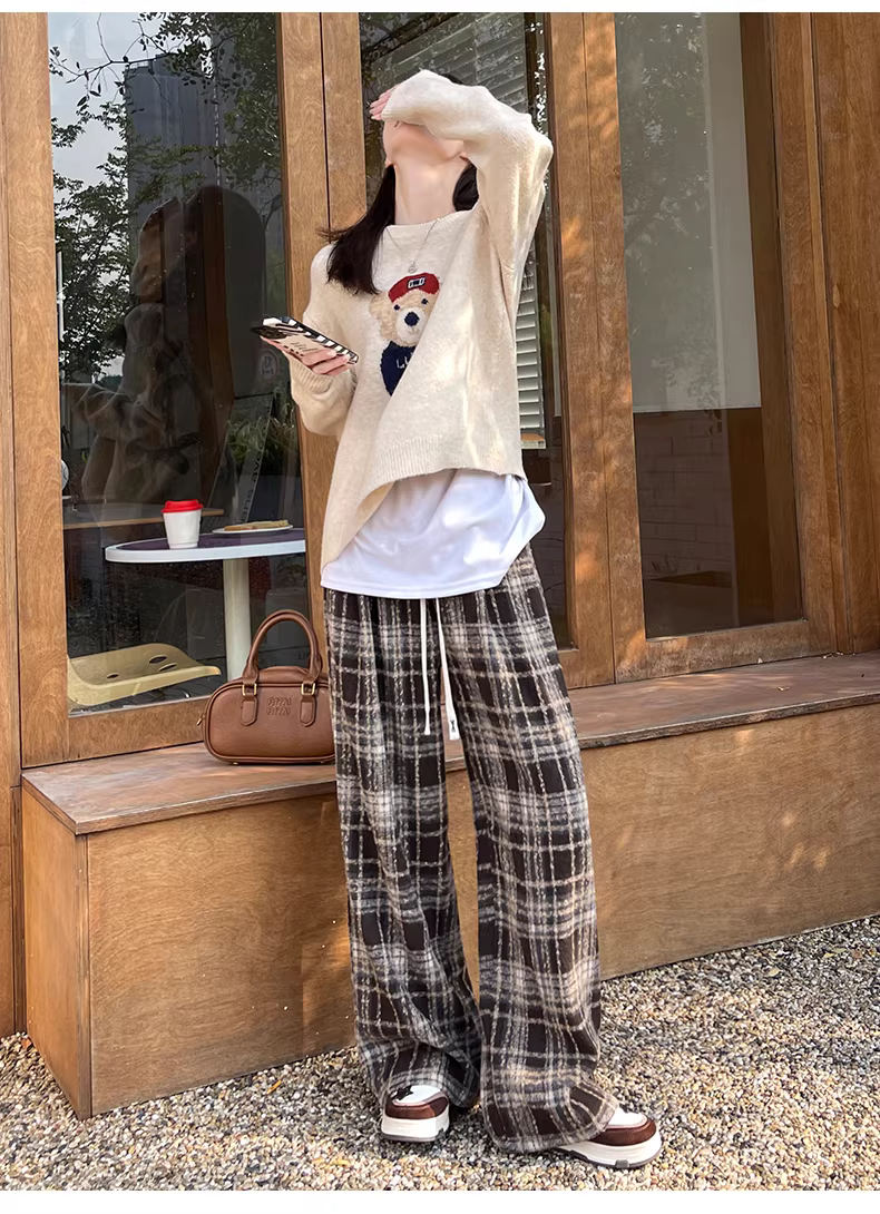 - Quần ống rộng kẻ sọc xanh La Chapelle dành cho nữ 2025 mới mùa thu đông quần ống rộng ống rộng lót lông cừu
