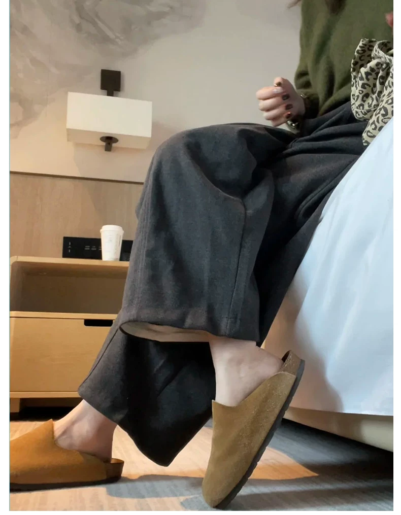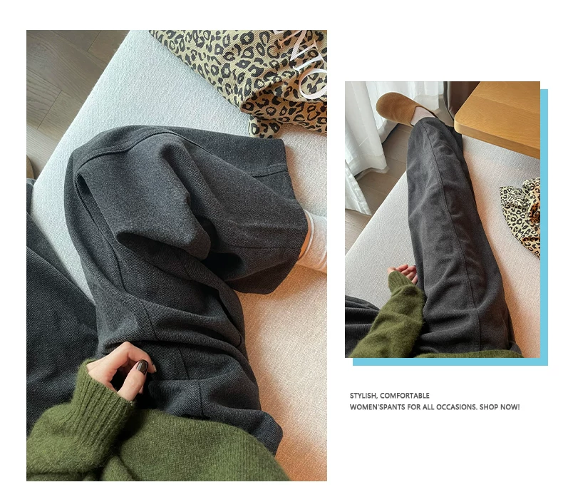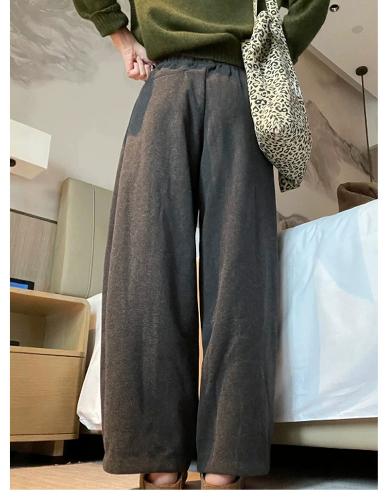 Quần ống rộng len lưng cao lười biếng dành cho nữ, mùa thu đông, cỡ lớn, màu xám đậm, lưng cao, giảm béo, che hông, quần thường ngày lót lông cừu