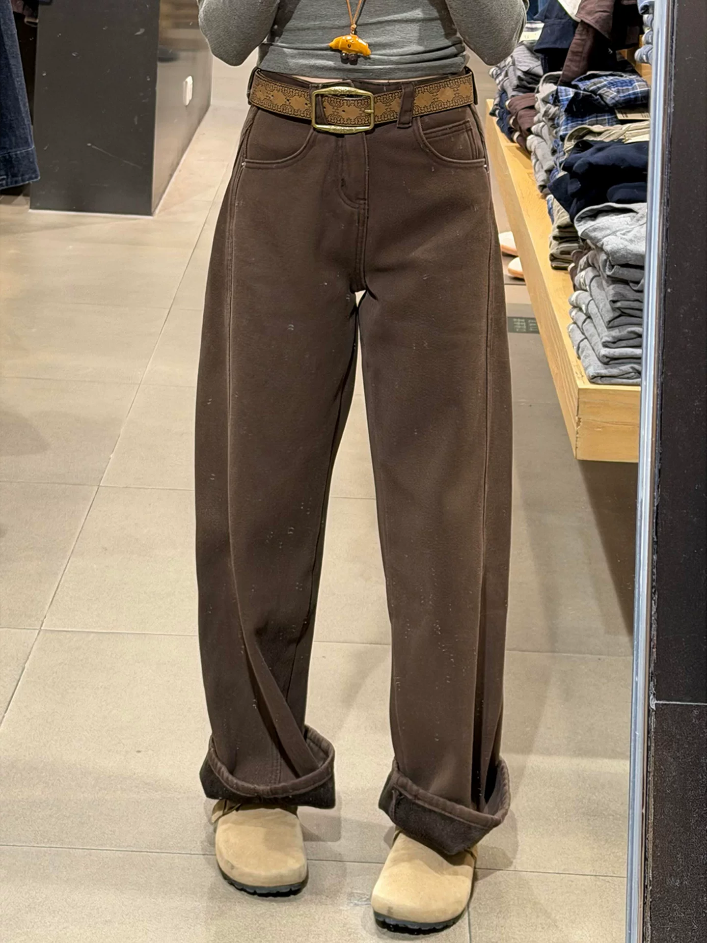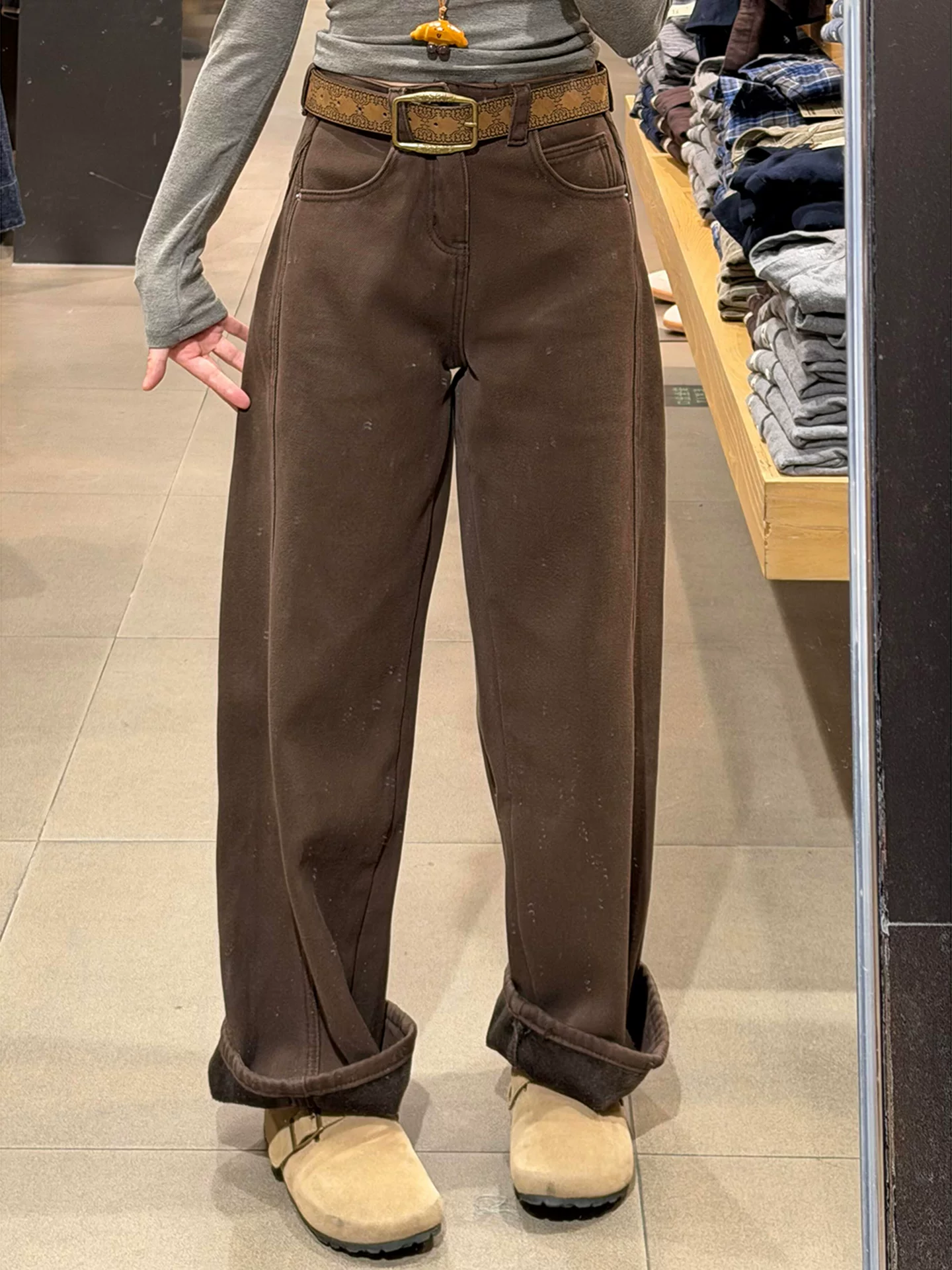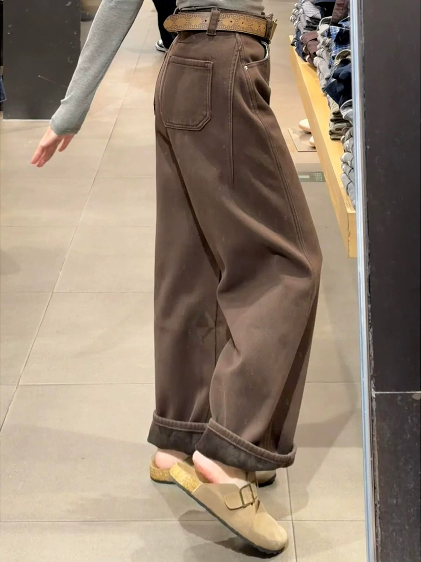 - Quần ống rộng lót lông cừu dày màu nâu dành cho nữ, cỡ lớn mùa đông, lưng cao, dáng rộng, che hông, dáng quả lê, quần jean ống rộng.
