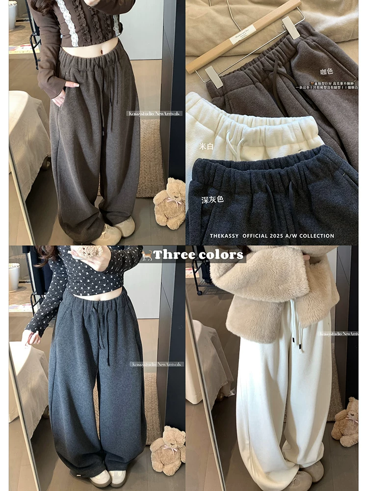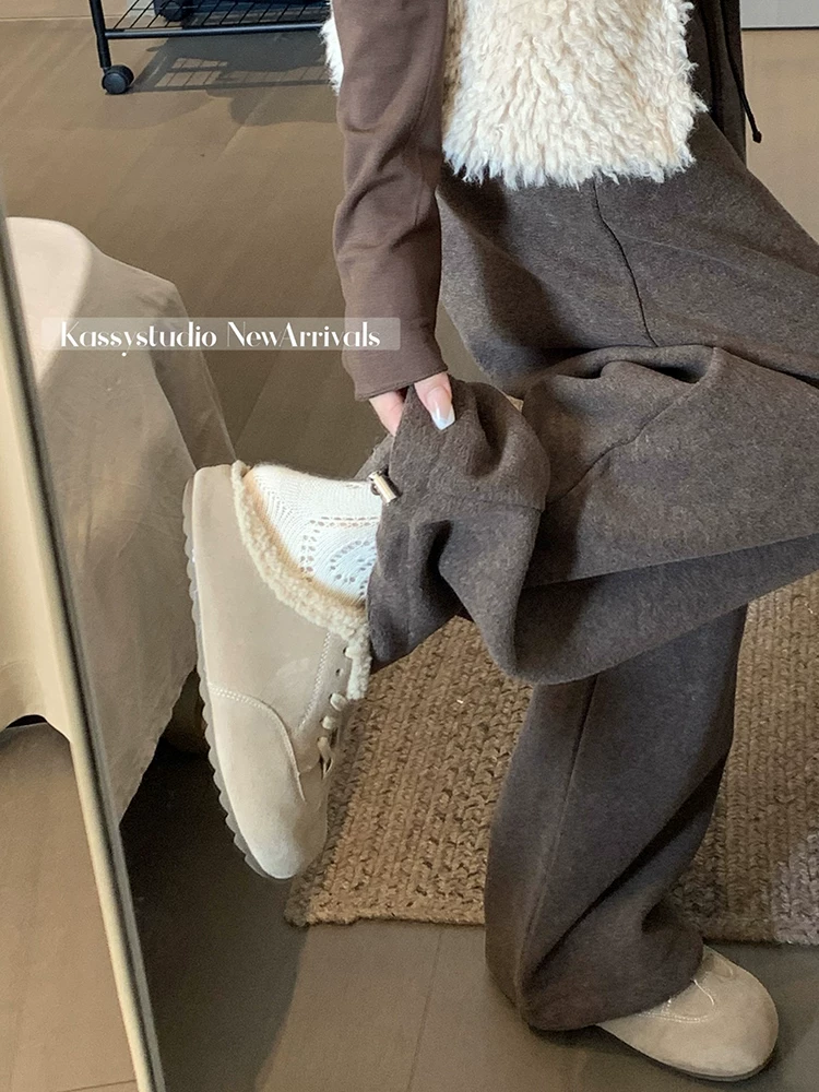 Quần ống rộng màu cà phê dành cho nữ, mùa thu đông, lót lông cừu, dày dặn, cỡ lớn, lưng cao, rộng rãi, mềm mại, tôn dáng, quần ống rộng.