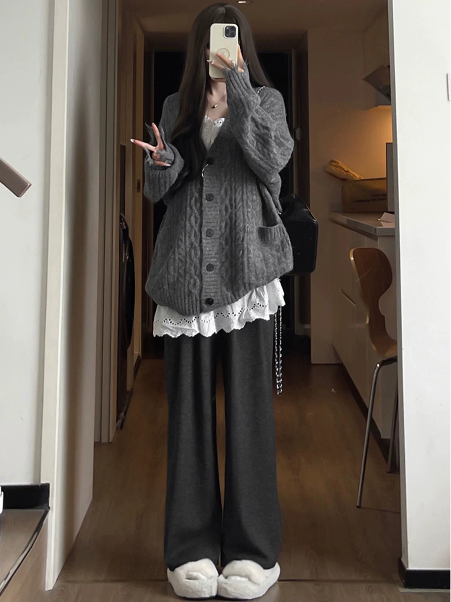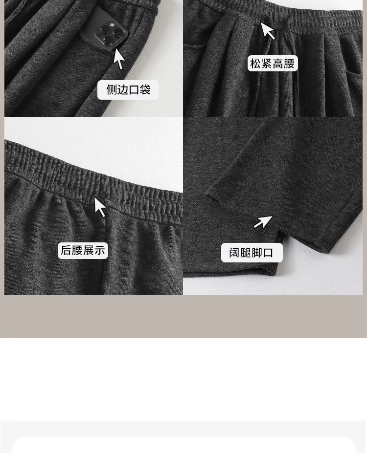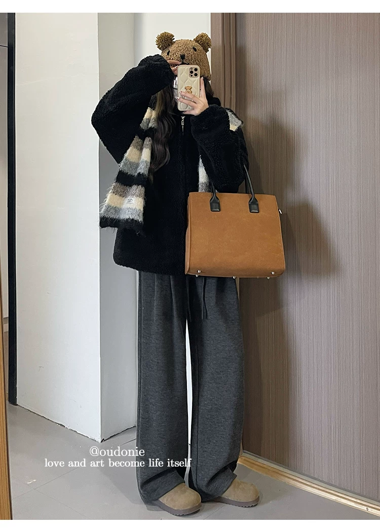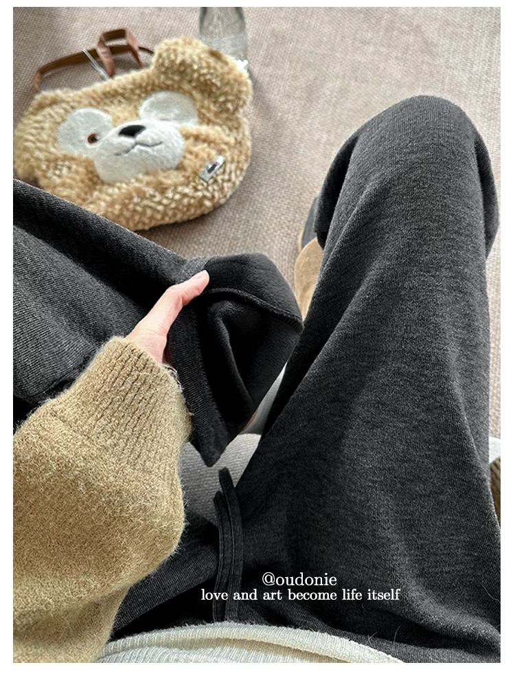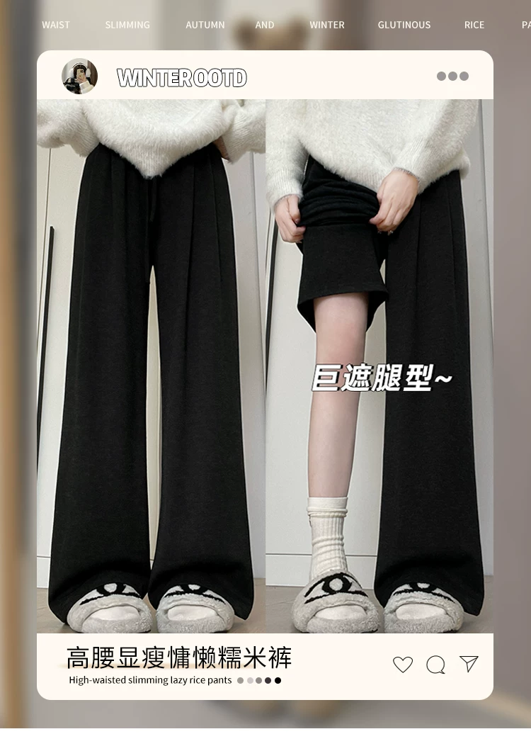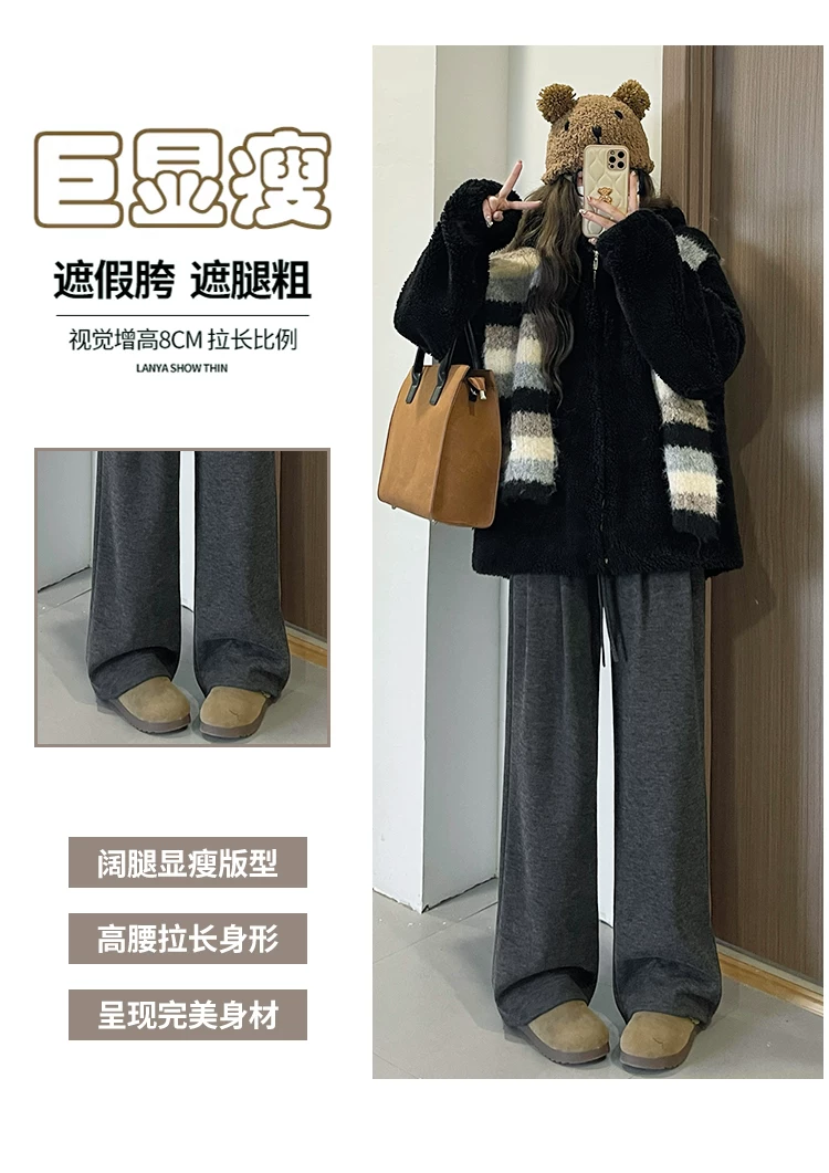 Quần ống rộng màu đen dành cho nữ, mùa thu đông, cỡ lớn, dáng rộng, mềm mại, thoải mái, lót lông cừu, quần thường ngày dày dặn.