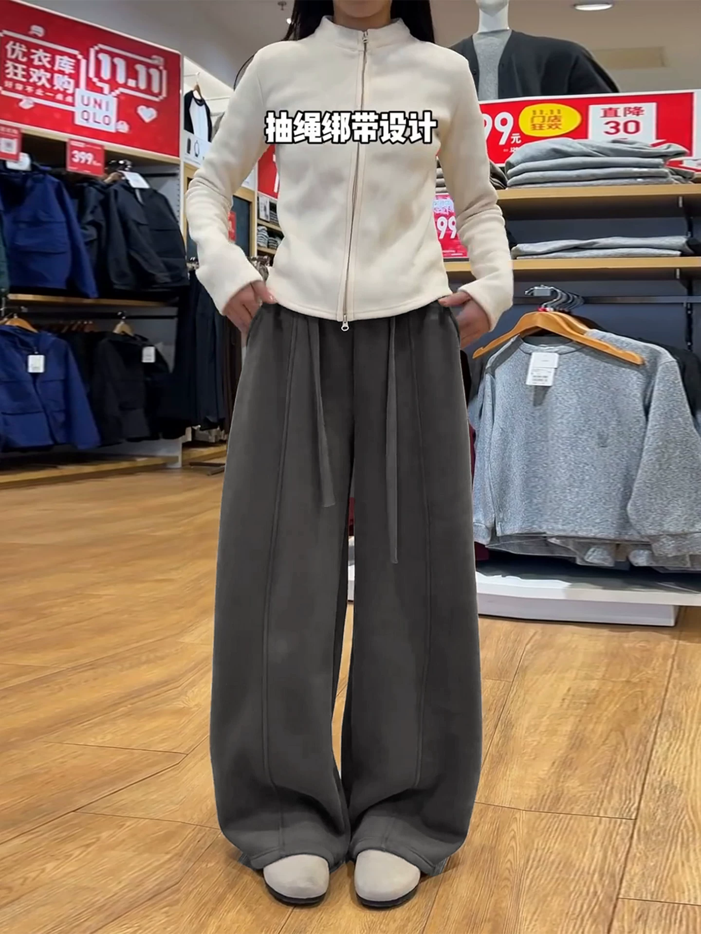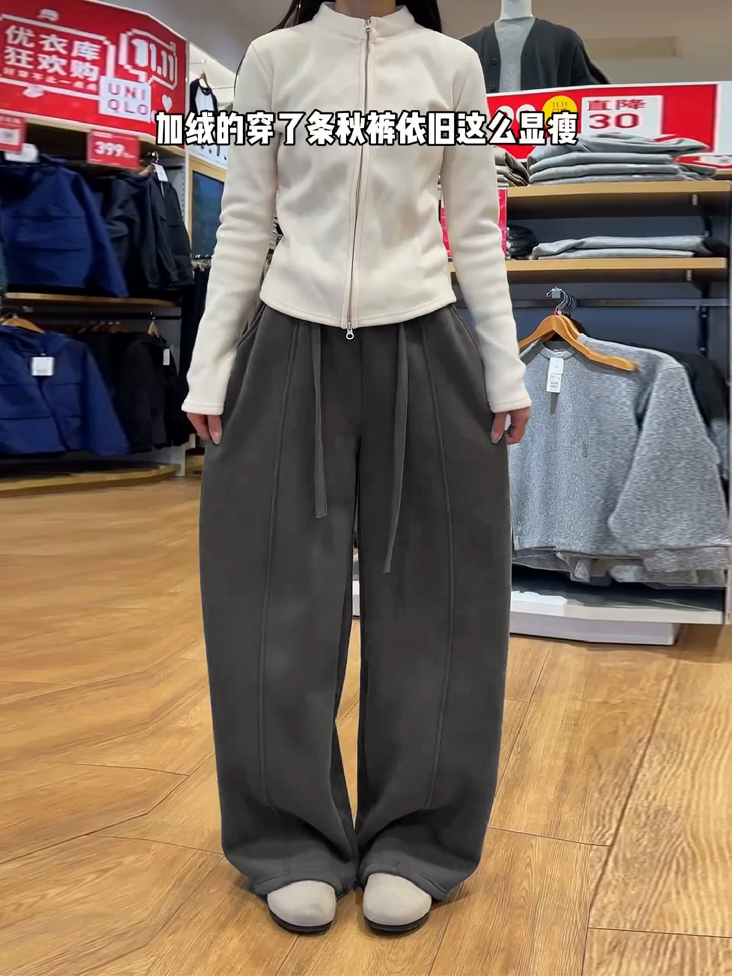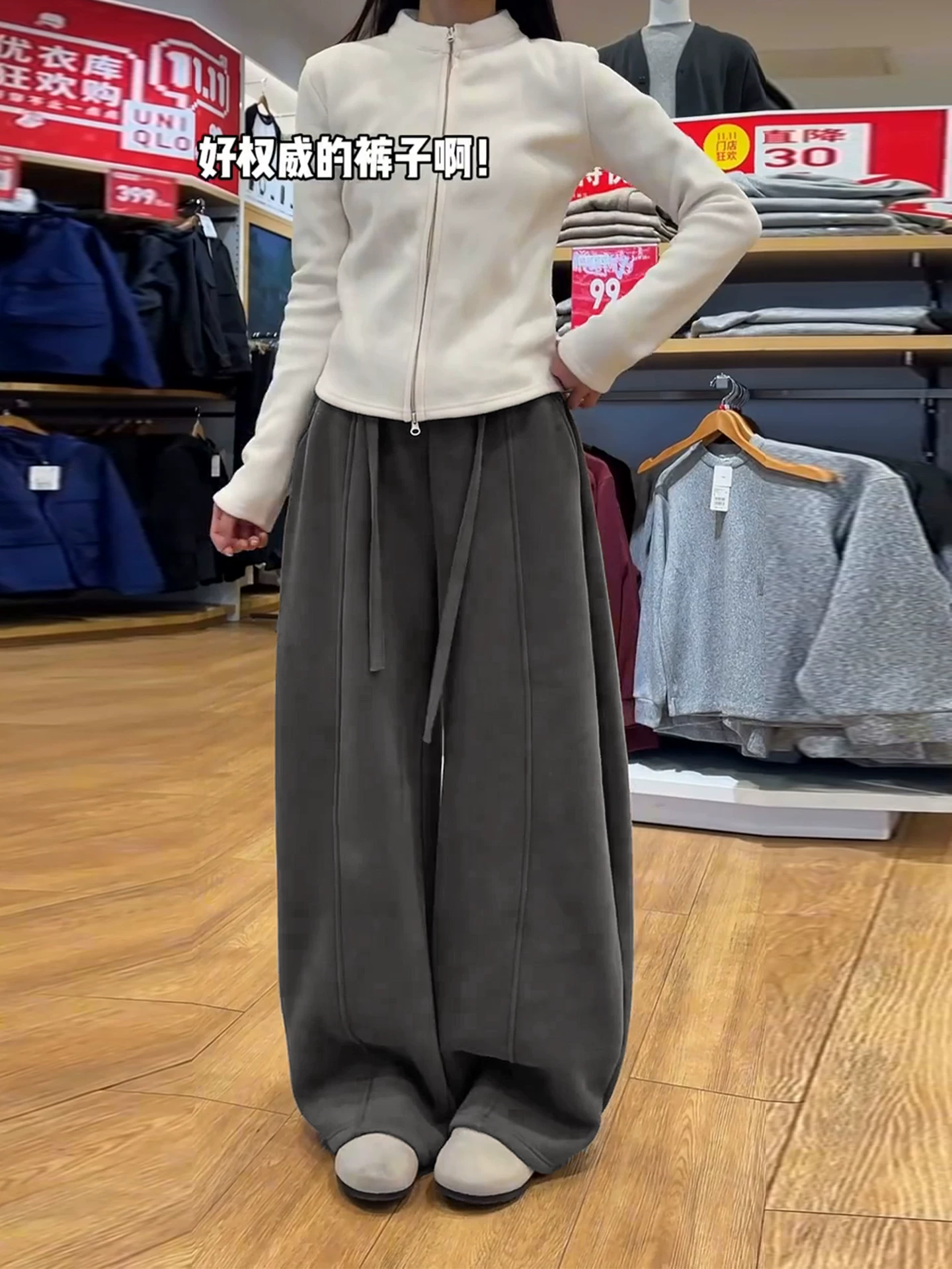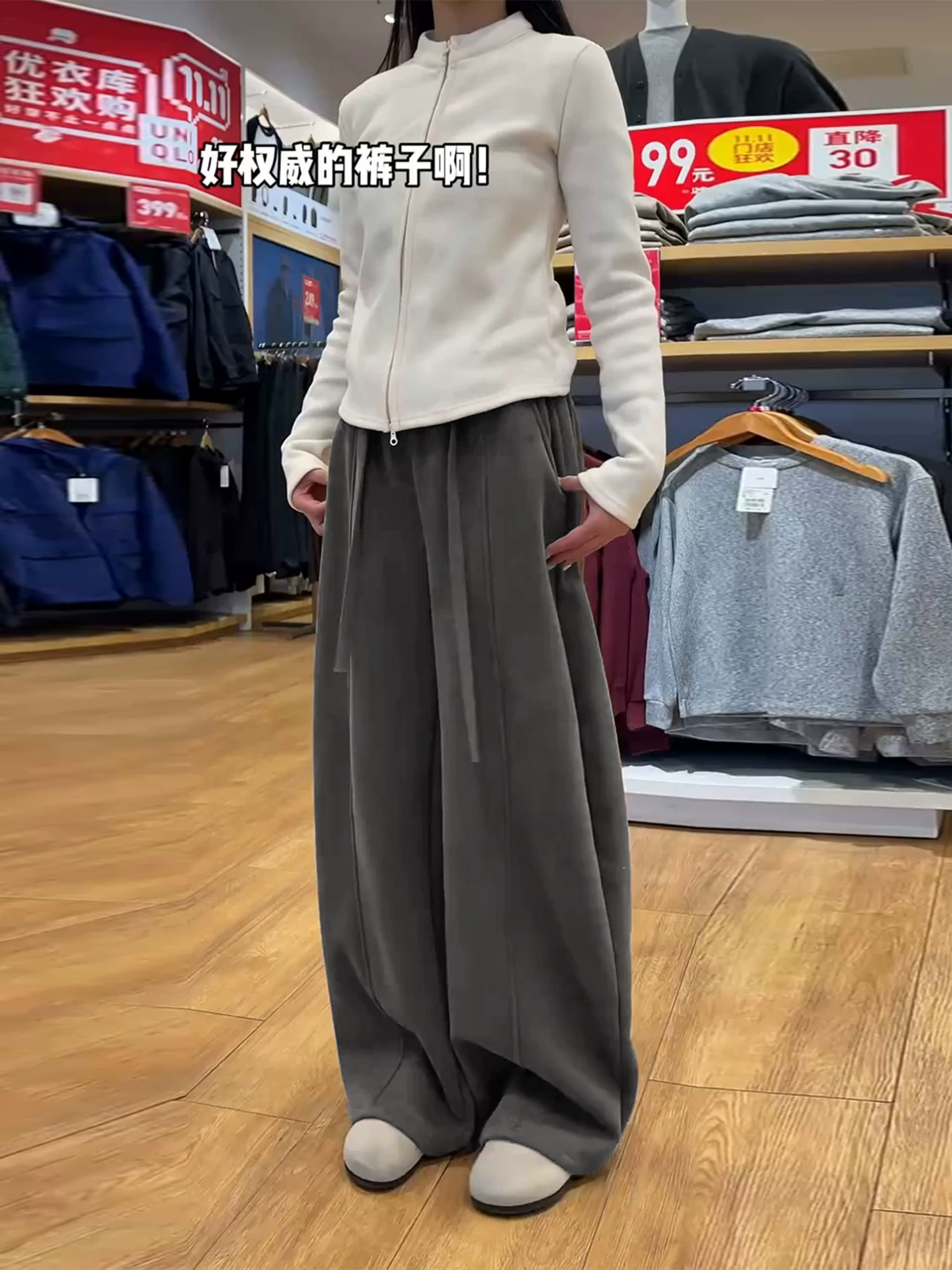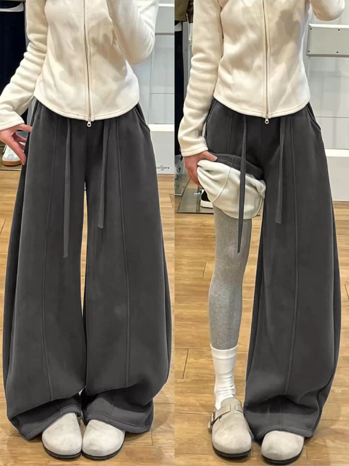 Quần ống rộng màu đen và xám dành cho nữ, mùa thu đông, cỡ lớn, lưng cao, dáng rộng, tôn dáng, lót lông cừu, dày, quần ống rộng mềm mại.