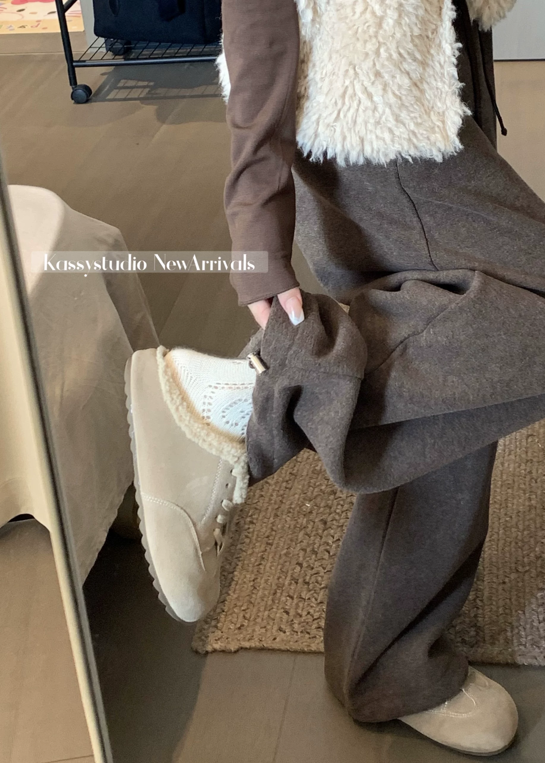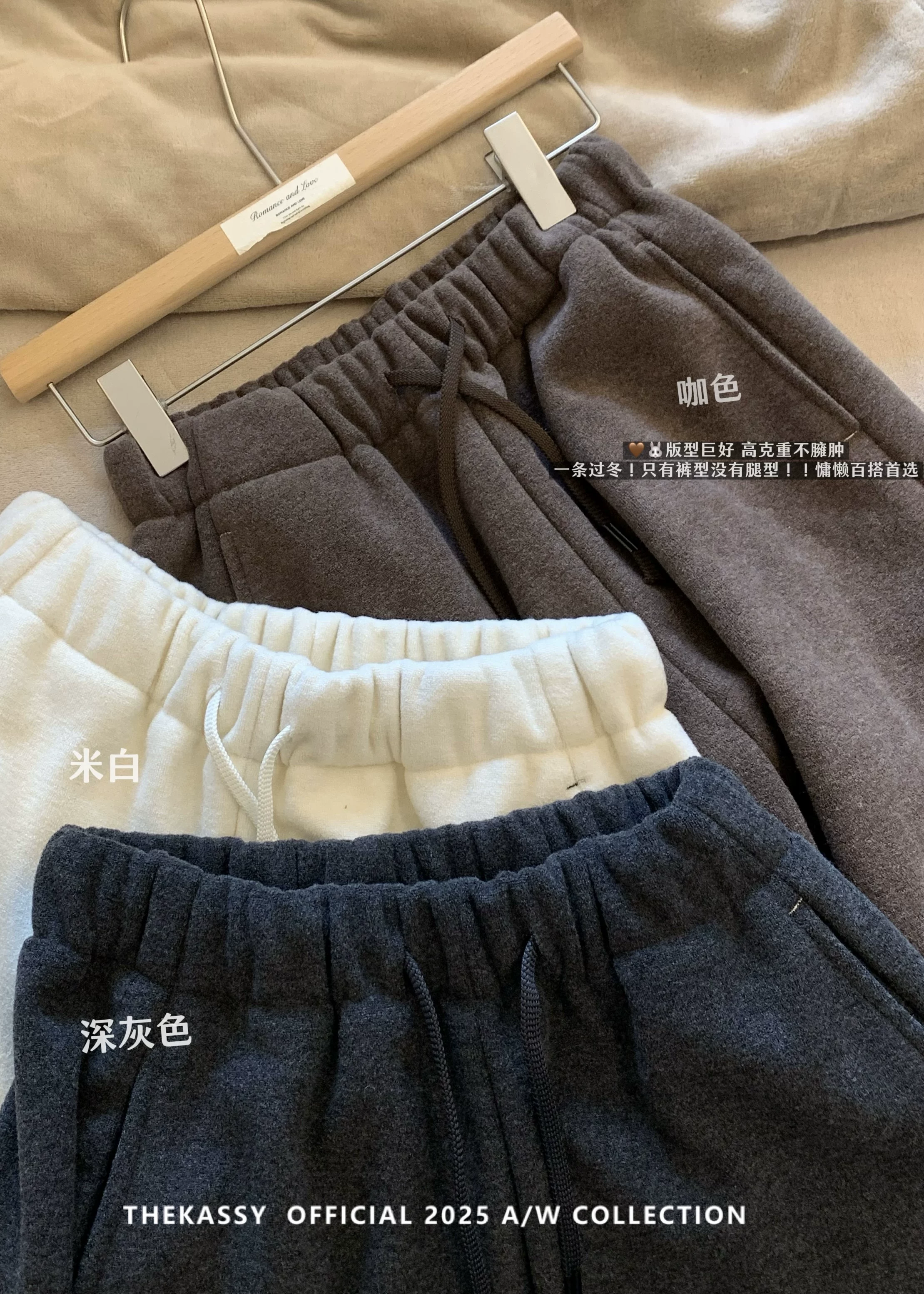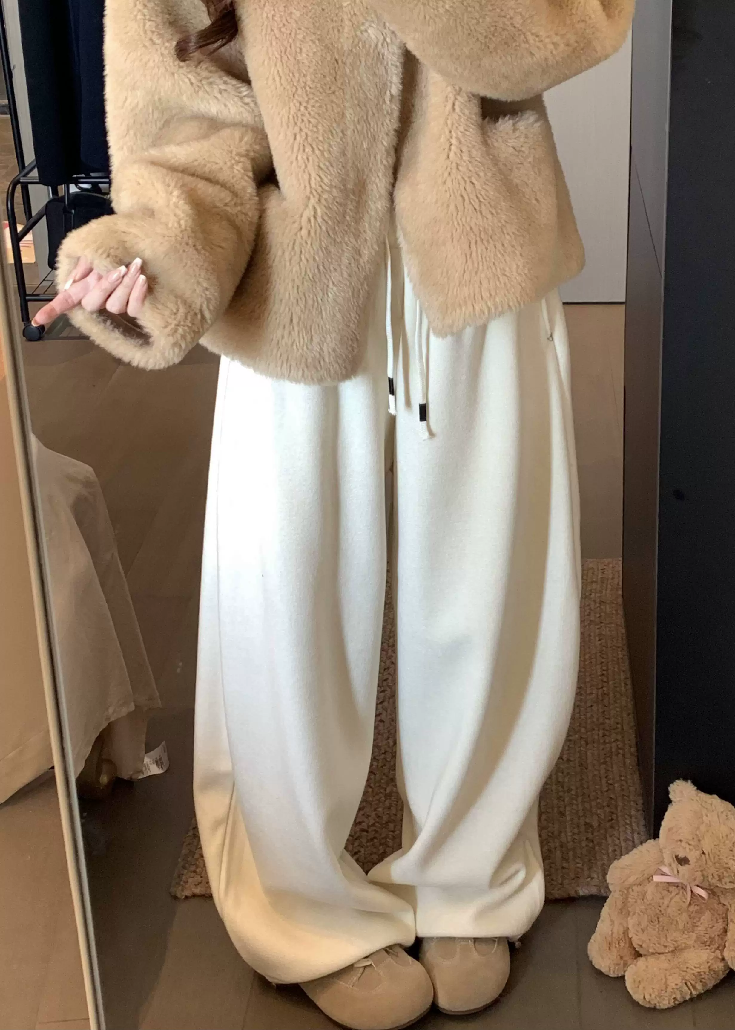Quần ống rộng màu trắng nhạt dành cho nữ, lót lông cừu mùa đông, cỡ lớn, lưng cao, mềm mại, tôn dáng, dáng quả lê, quần ống rộng