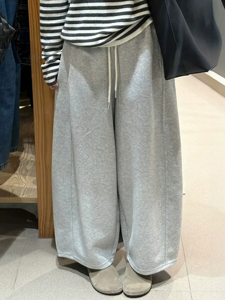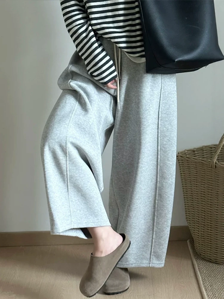Quần ống rộng màu xám cho nữ, mùa thu, cỡ lớn, lưng cao, quần rộng rãi, quần lửng dáng nhỏ, quần thể thao cây dương