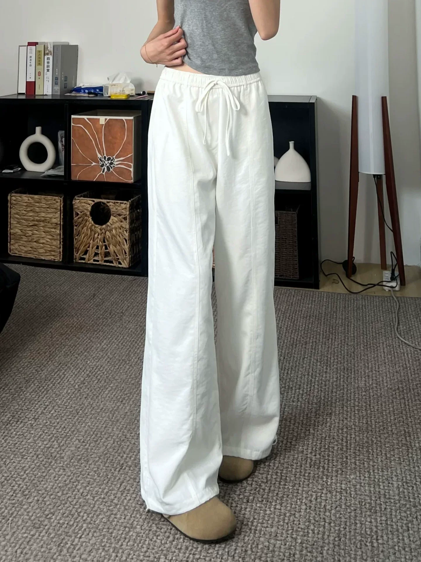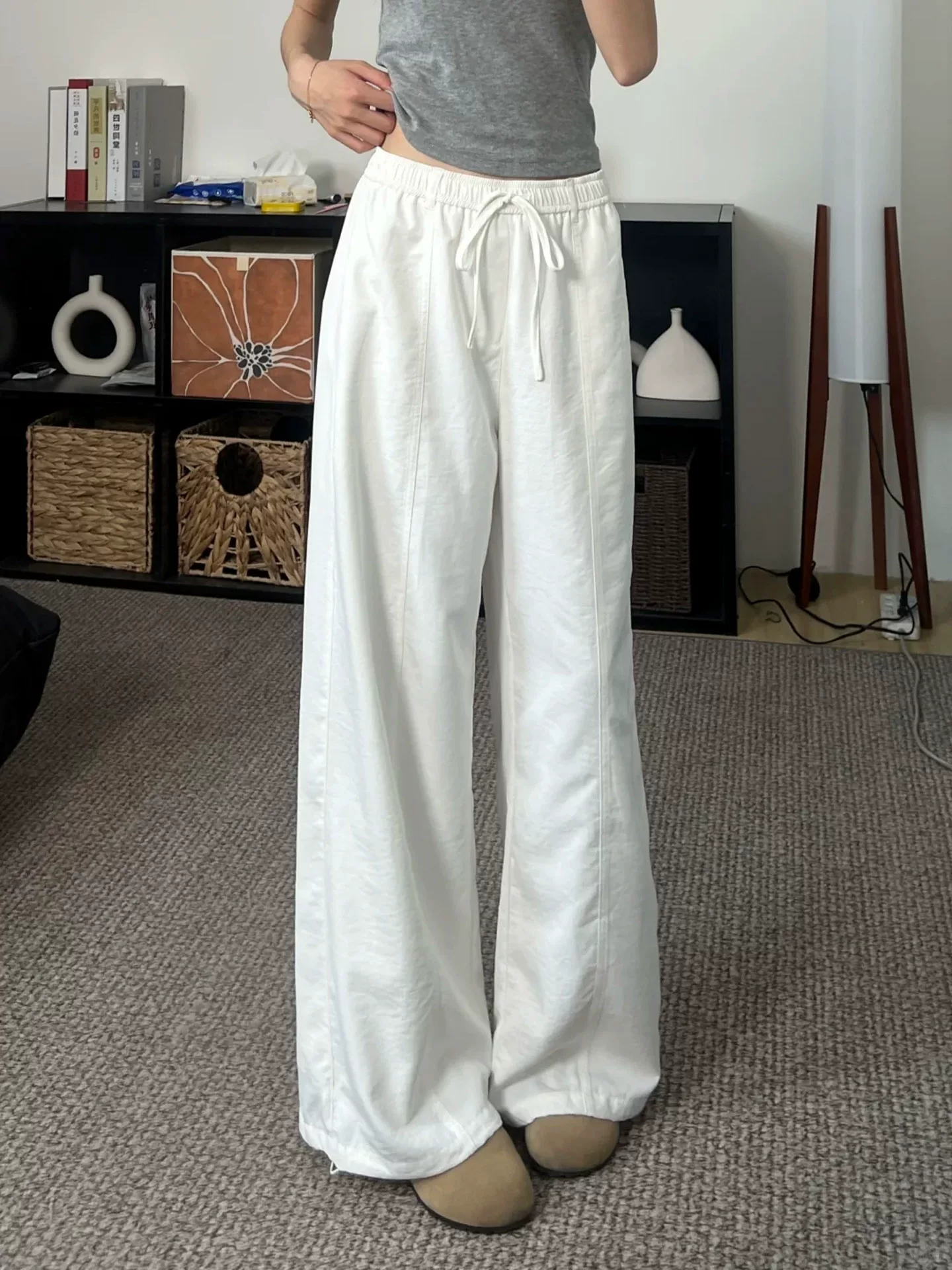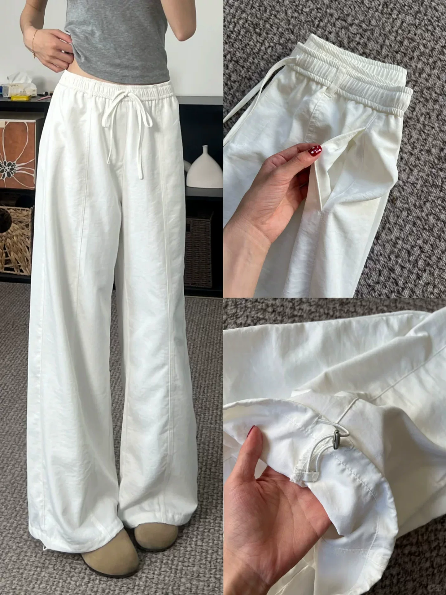 - Quần ống rộng vải lụa trắng dành cho nữ, kiểu dáng mỏng mùa hè 2025, size lớn, cạp cao, dáng thẳng, chất liệu mềm mại, quần nhanh khô.