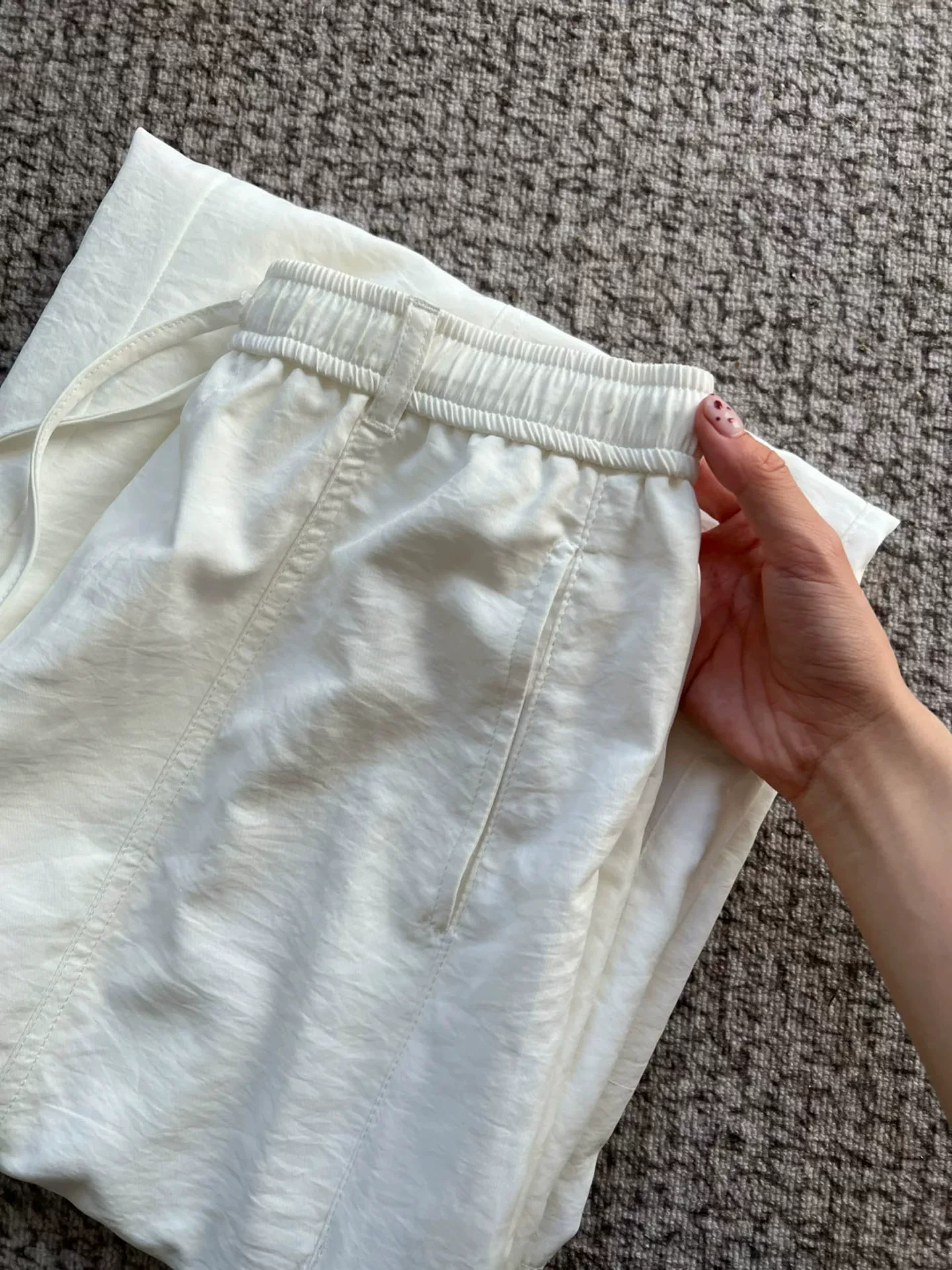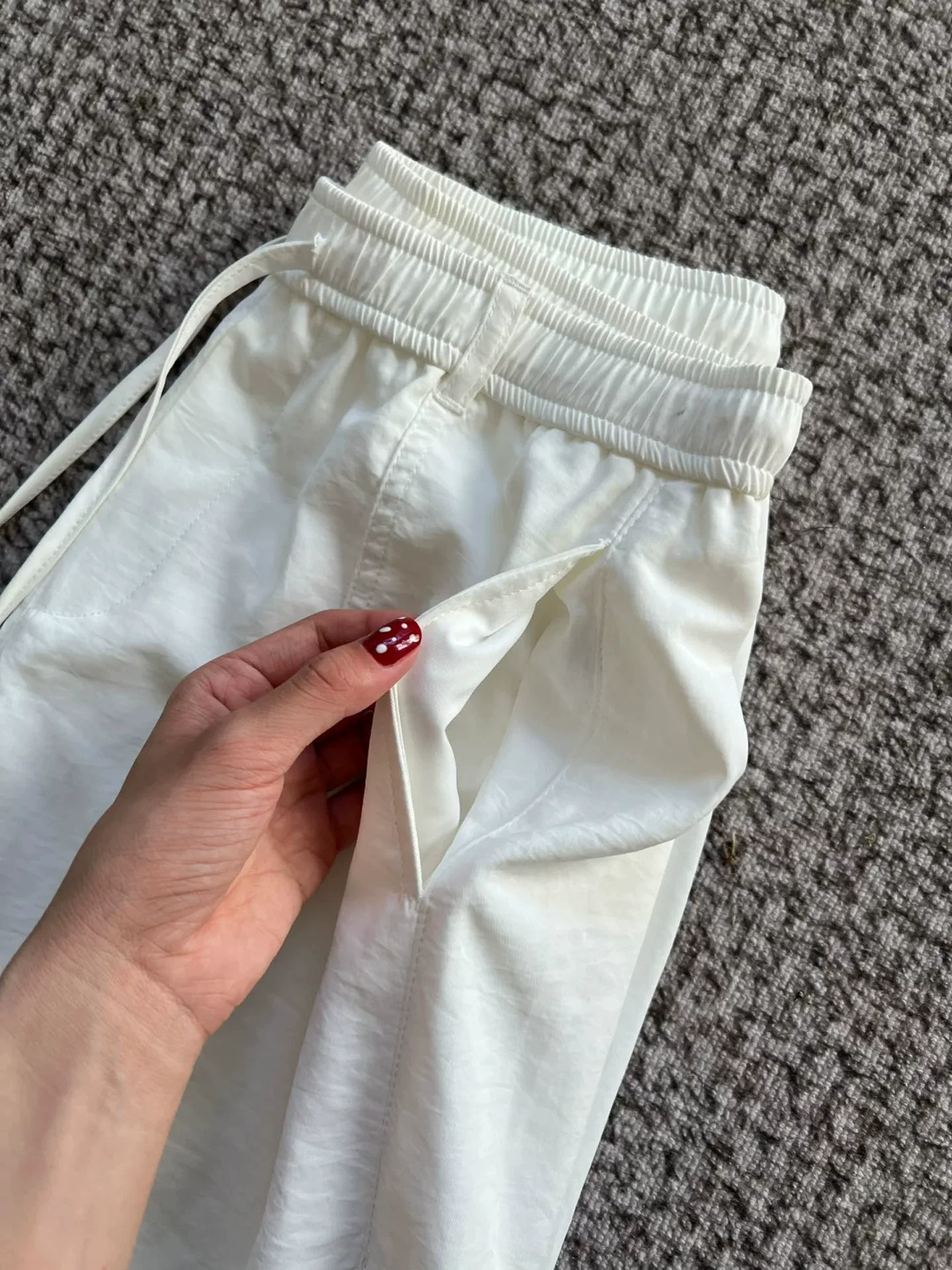 Quần ống rộng vải lụa trắng dành cho nữ, kiểu dáng mỏng mùa hè 2025, size lớn, cạp cao, dáng thẳng, chất liệu mềm mại, quần nhanh khô.