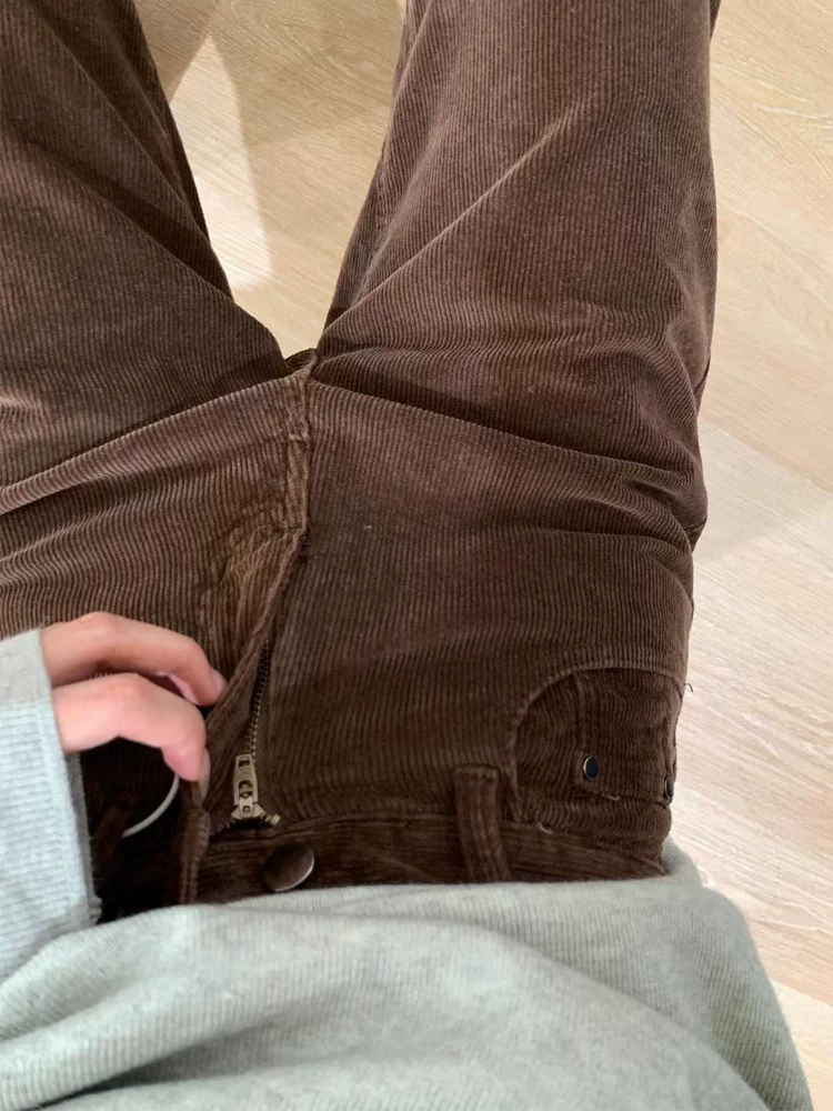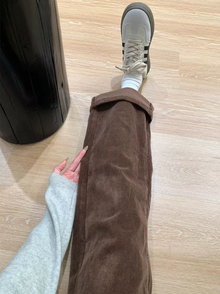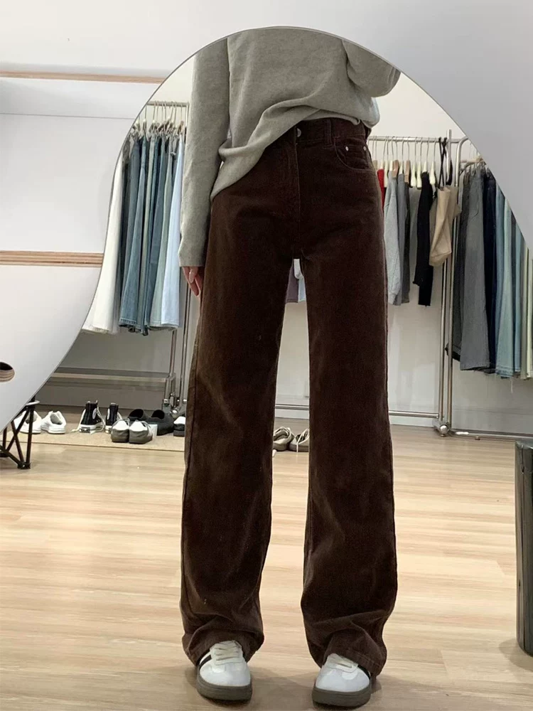 - Quần ống rộng vải nhung dày lót lông cừu dành cho nữ, mùa thu đông, cỡ lớn, lưng cao, che hông, giảm béo, quần ống thẳng hẹp.