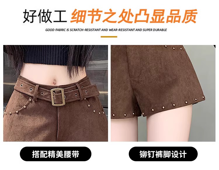 Quần short da lộn nữ, kiểu mới thu đông 2025, quần nữ lưng thấp, quần rất thời trang, quần da, quần ống loe.