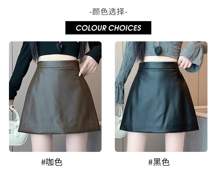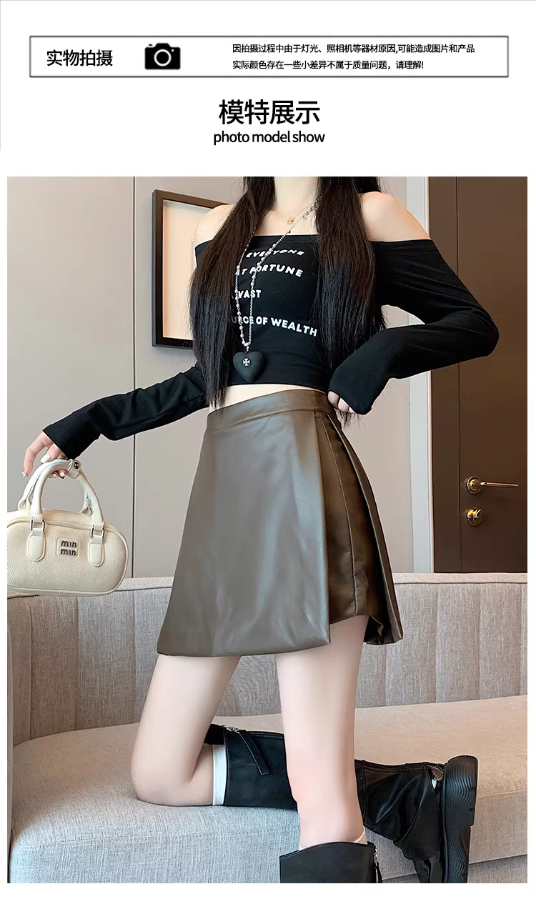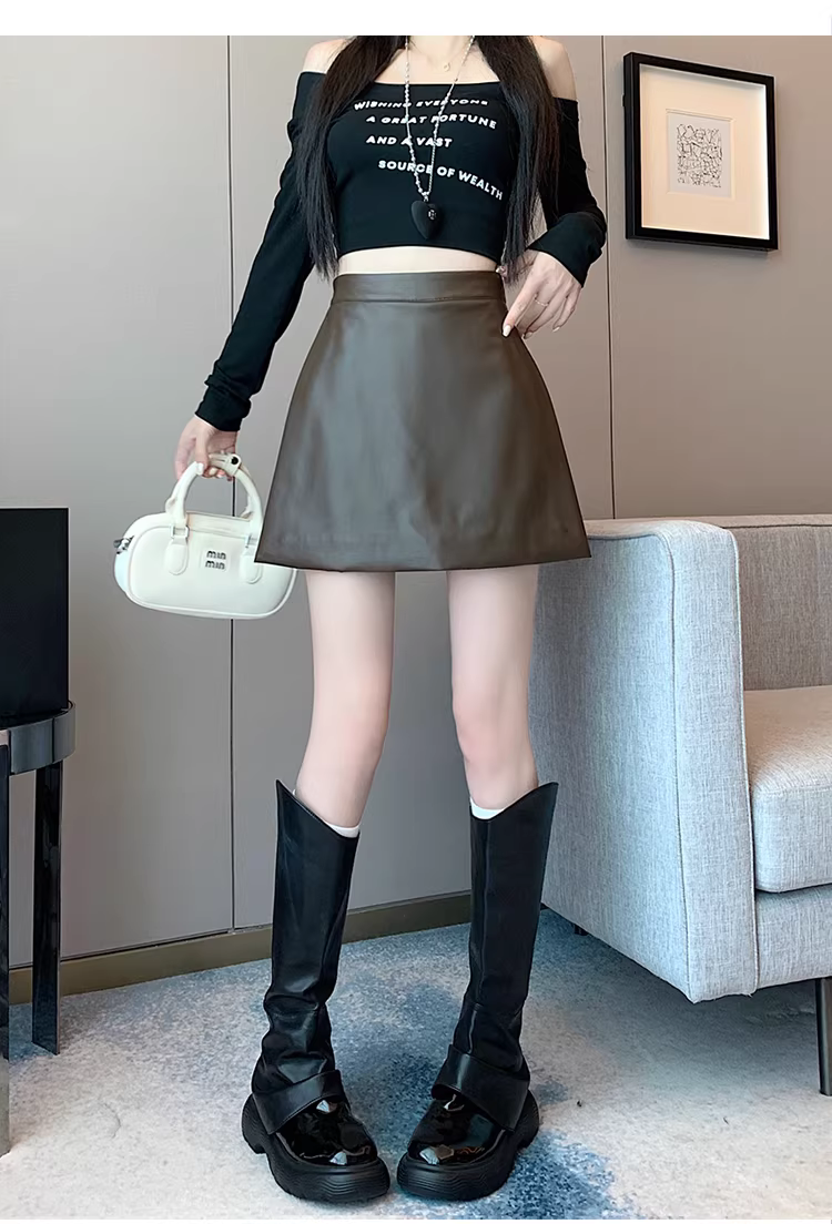- Quần short da nâu dành cho nữ, mùa thu đông, combo quần váy, quần váy giả da PU hai mảnh có xẻ tà, quần bốt Martin cạp cao.