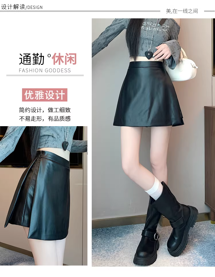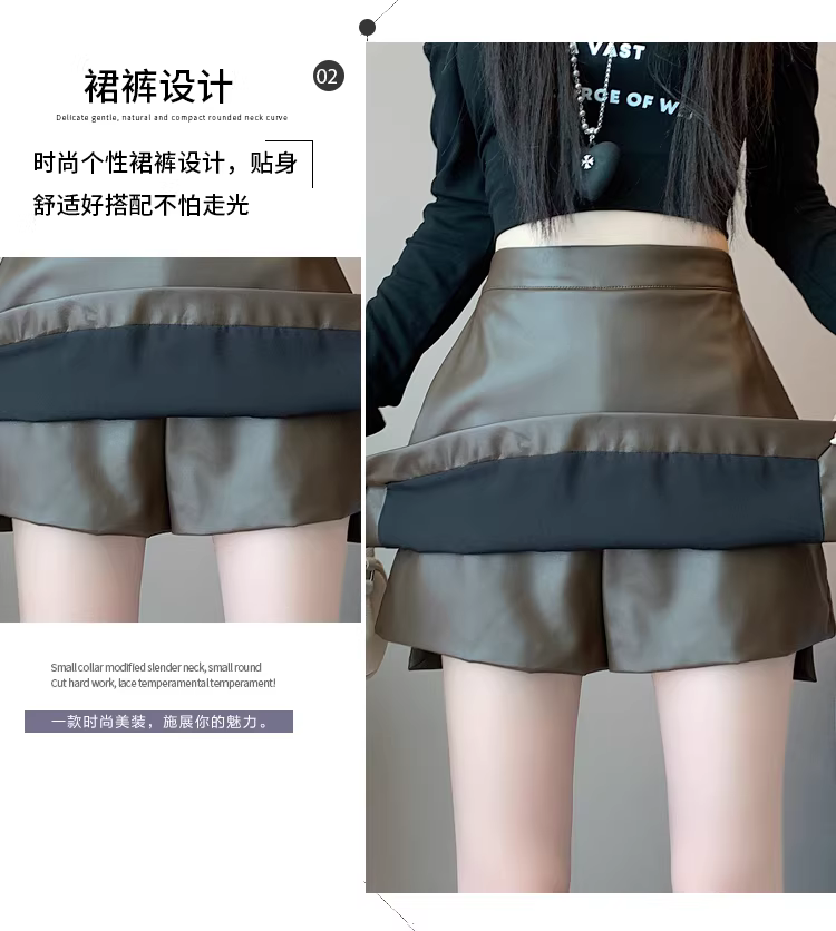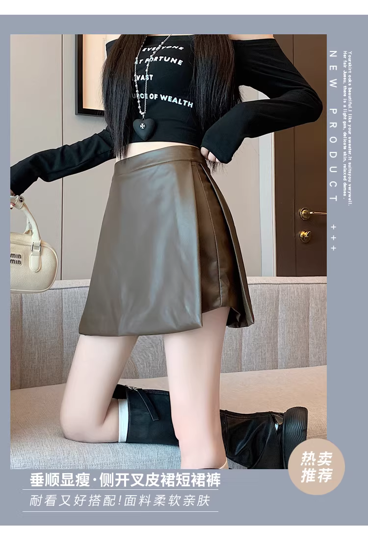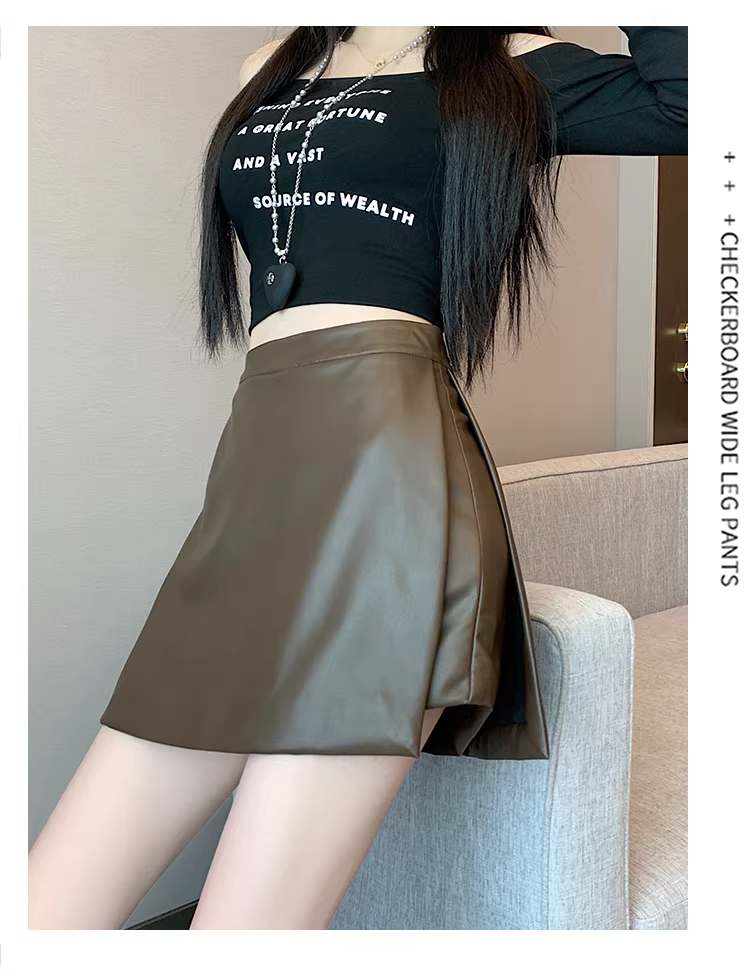 Quần short da nâu dành cho nữ, mùa thu đông, combo quần váy, quần váy giả da PU hai mảnh có xẻ tà, quần bốt Martin cạp cao.