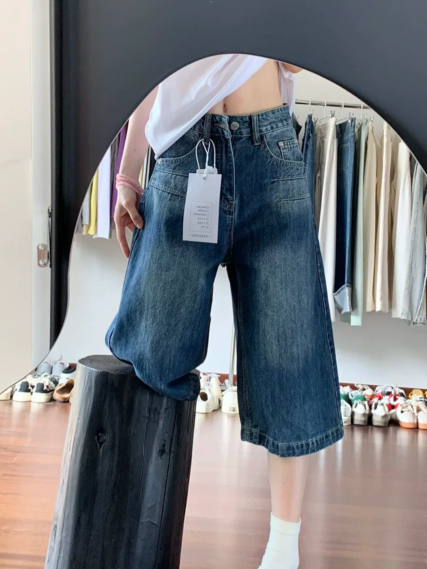 Quần short denim ba phần tư phong cách retro của Mỹ dành cho nữ, cỡ lớn mùa hè, lưng cao, dáng rộng, thon gọn, ống rộng, quần dài vừa phải.