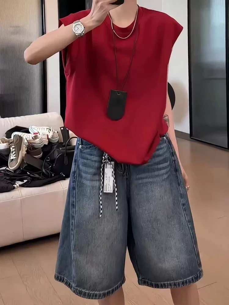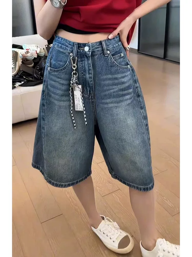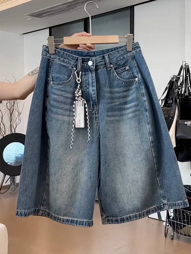 - Quần short denim cổ điển dáng quả lê dành cho nữ, cỡ lớn mùa hè, lưng cao, dáng rộng, che hông, giảm béo, quần ống rộng năm điểm