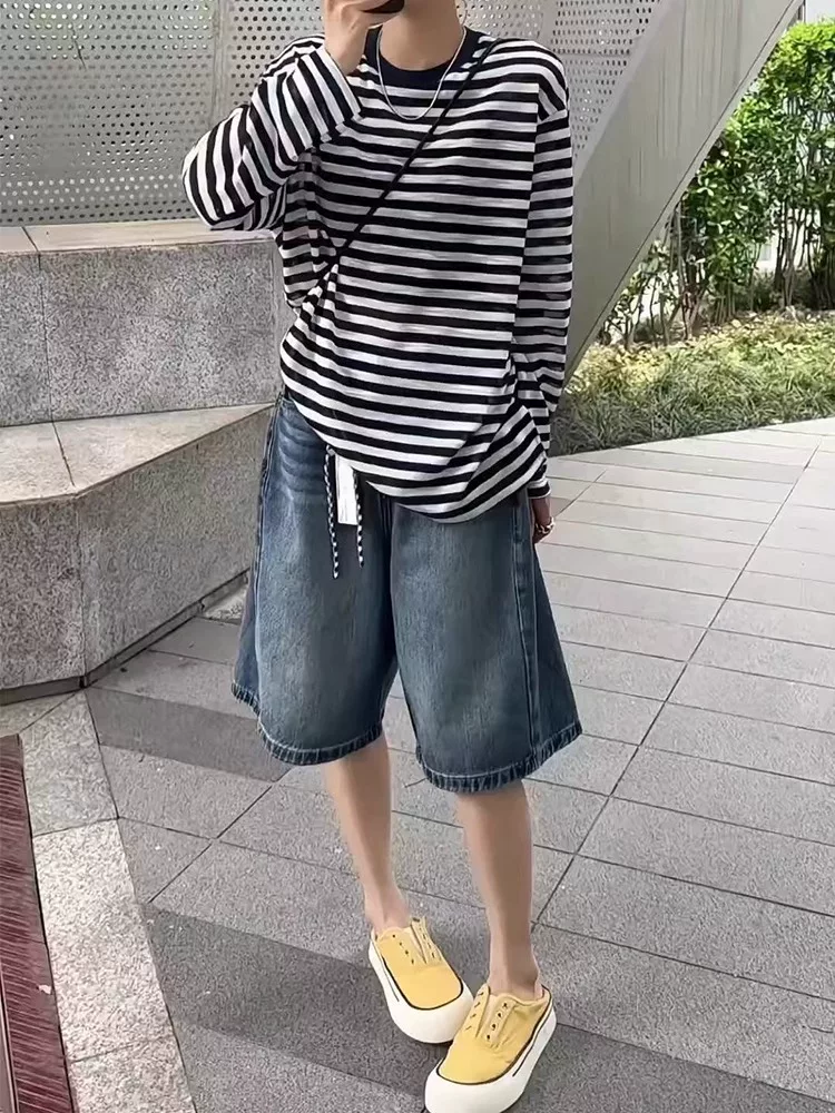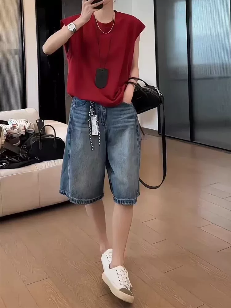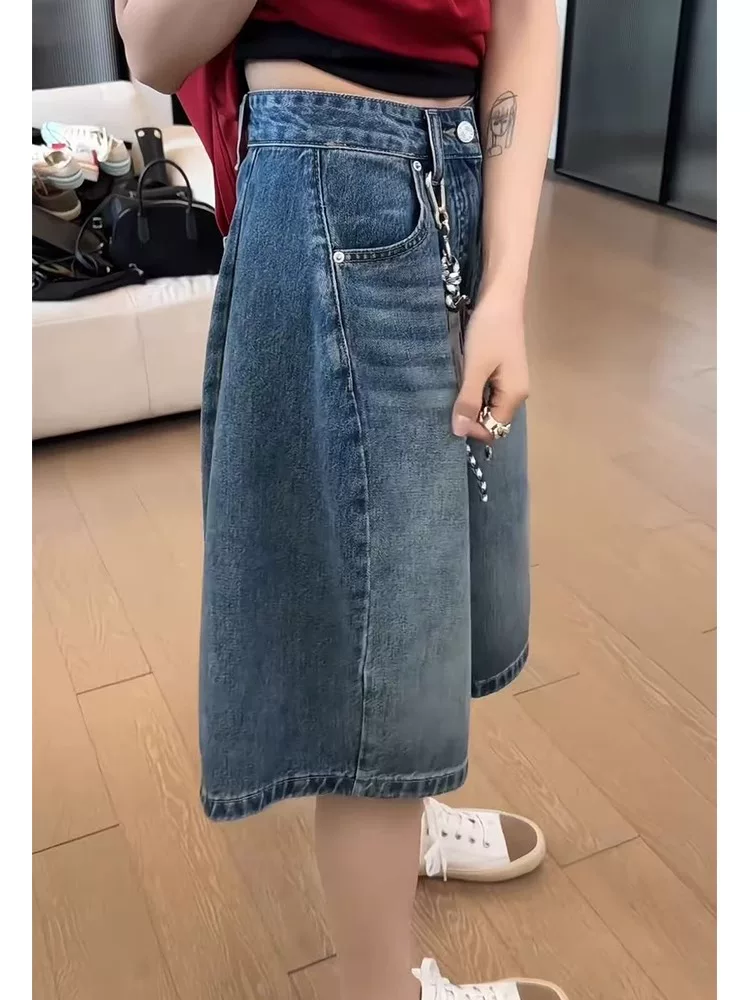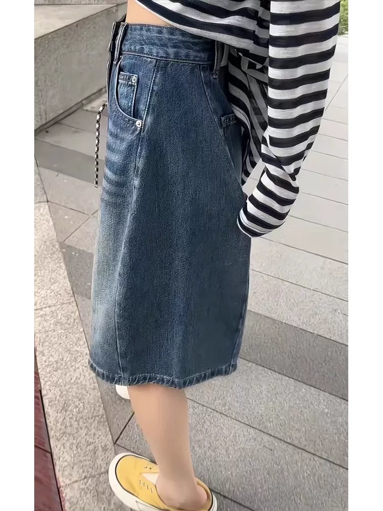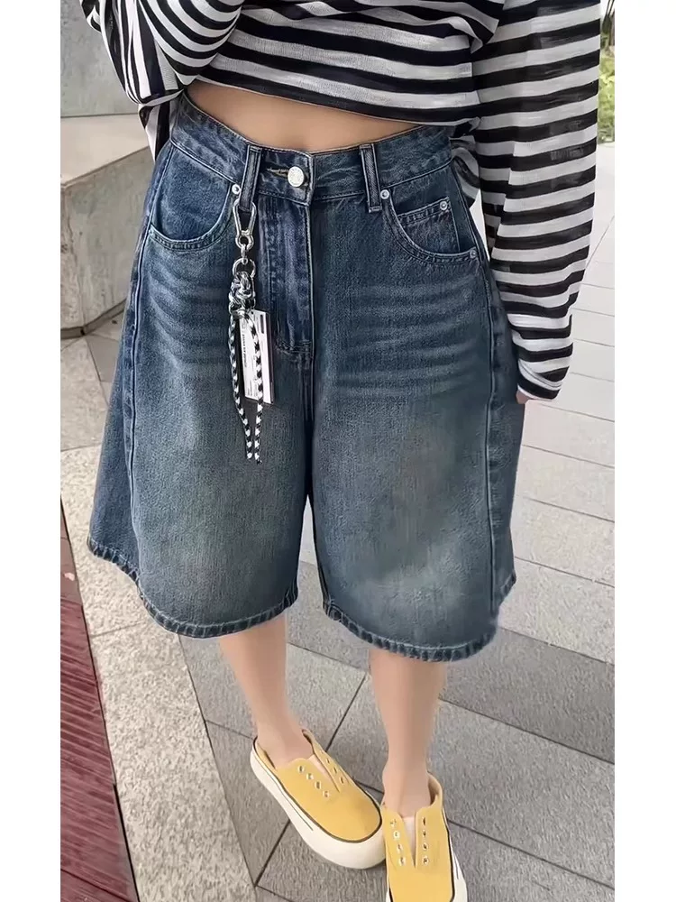 Quần short denim cổ điển dáng quả lê dành cho nữ, cỡ lớn mùa hè, lưng cao, dáng rộng, che hông, giảm béo, quần ống rộng năm điểm