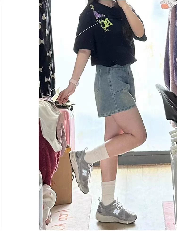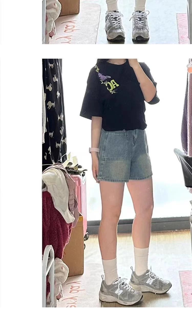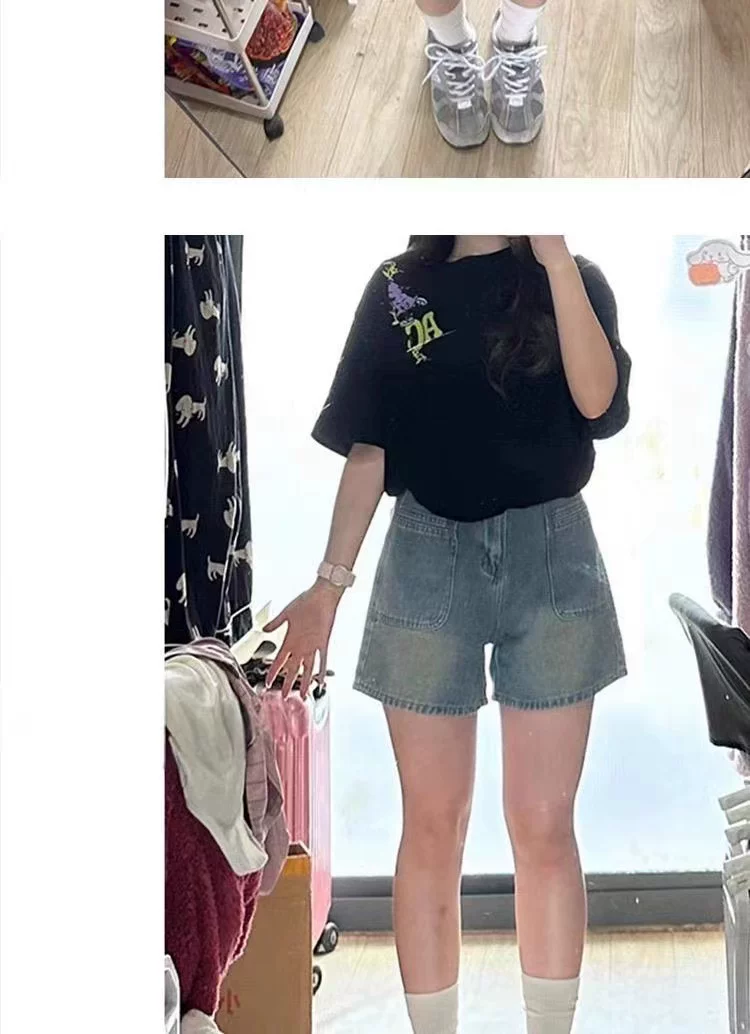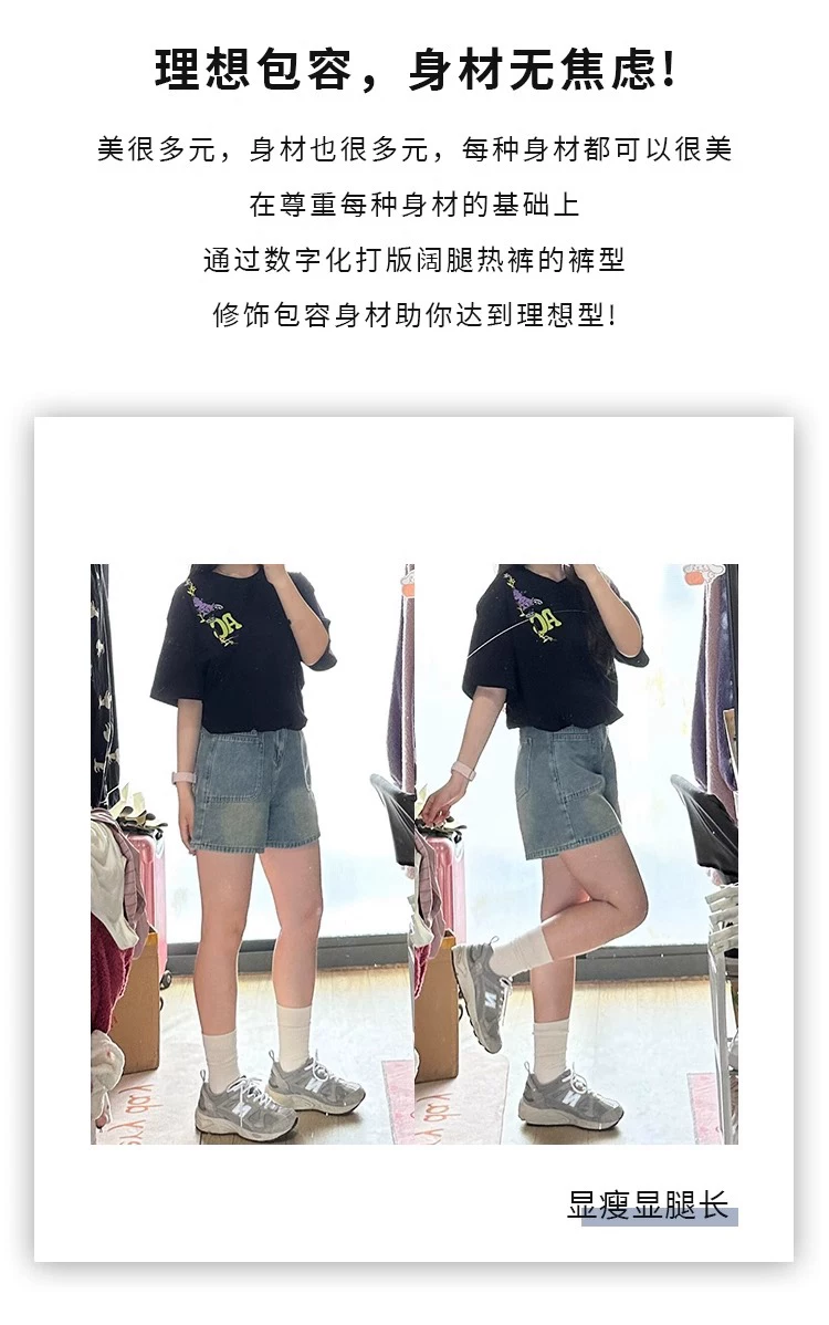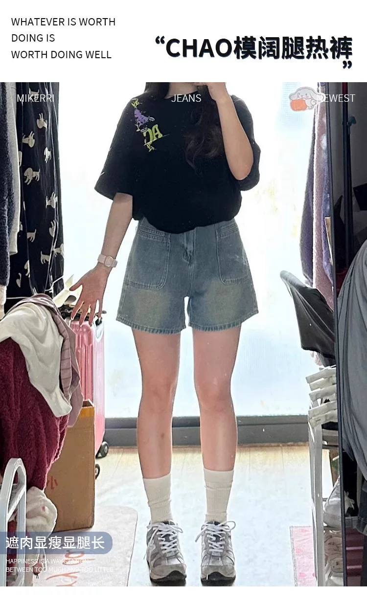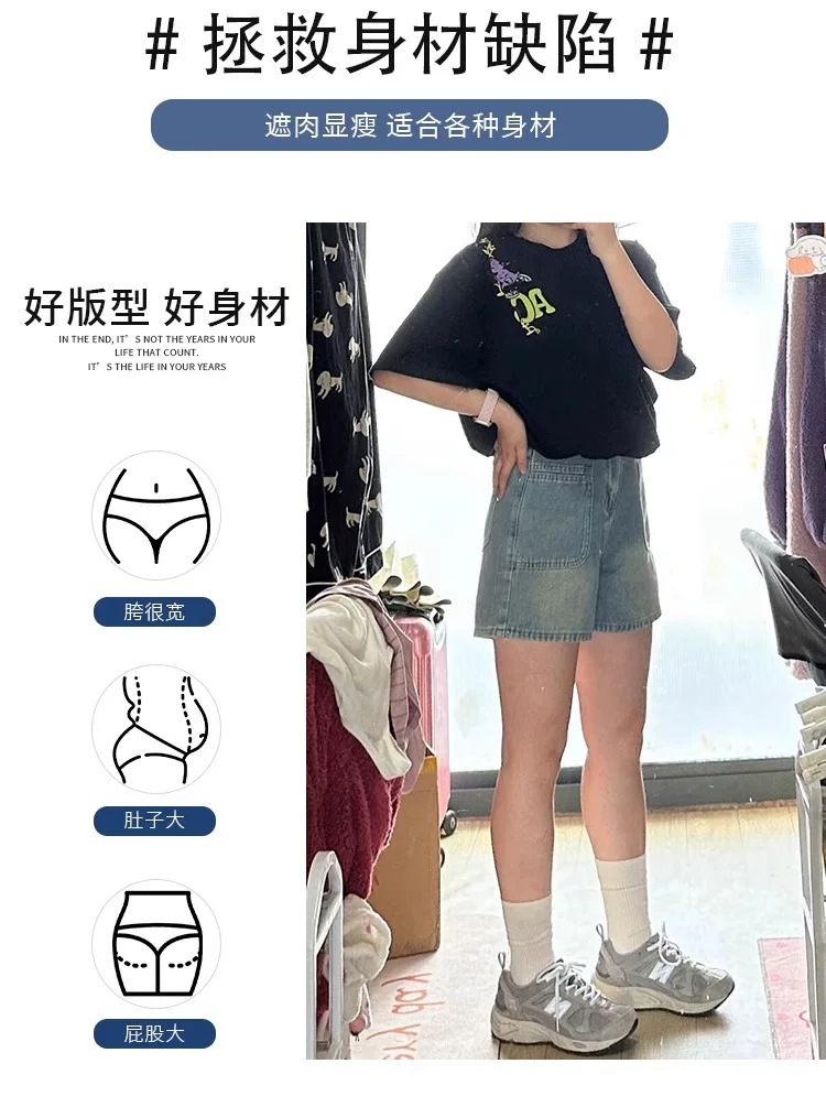 - Quần short denim cổ điển dành cho nữ, kiểu dáng mỏng mùa hè, cỡ lớn, cạp cao, dáng rộng, che hông, quần ống rộng chữ A tôn dáng.