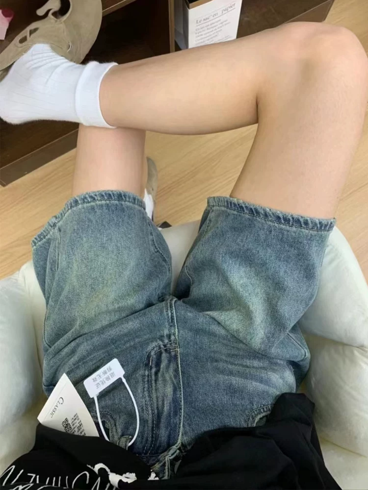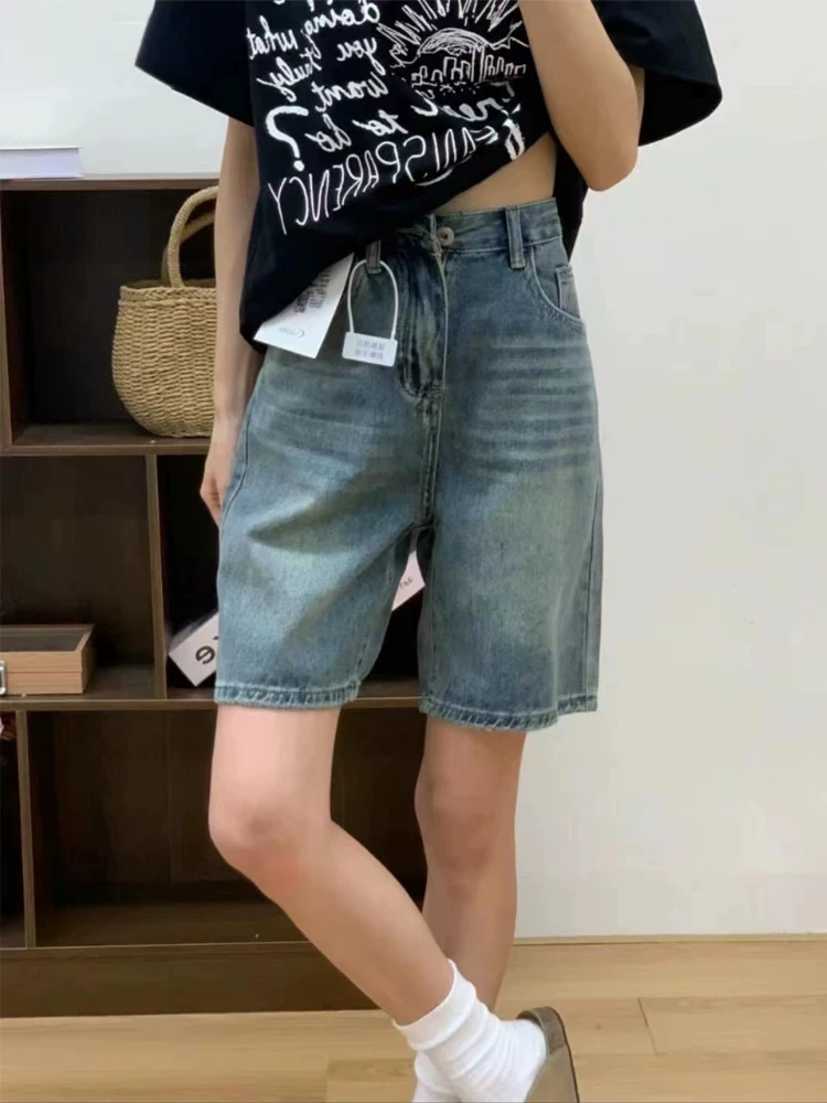 - Quần short denim cổ điển hình quả lê dành cho nữ, cỡ lớn mùa hè, lưng cao, dáng rộng, giảm béo, quần ống rộng, quần short dài vừa phải.