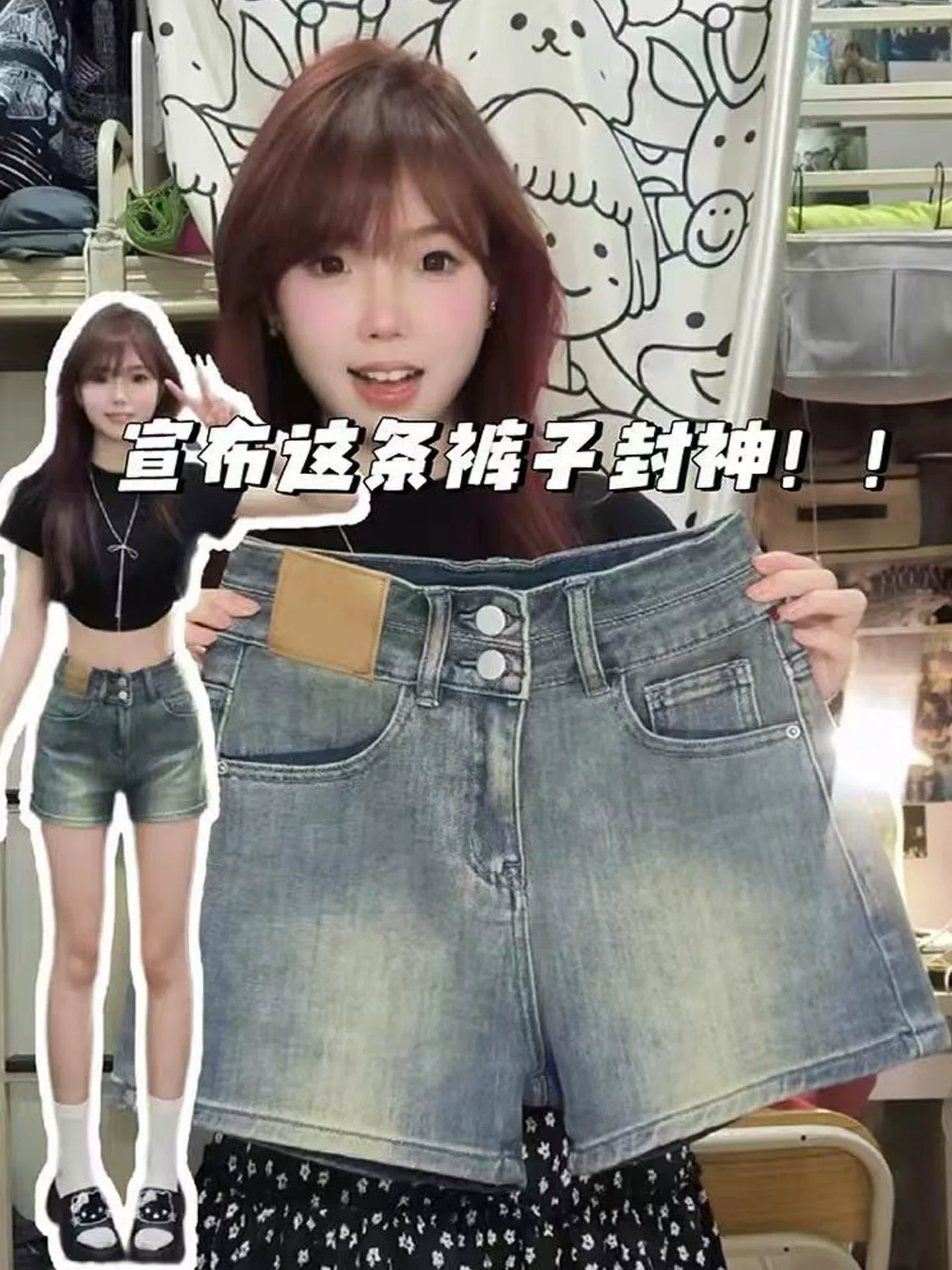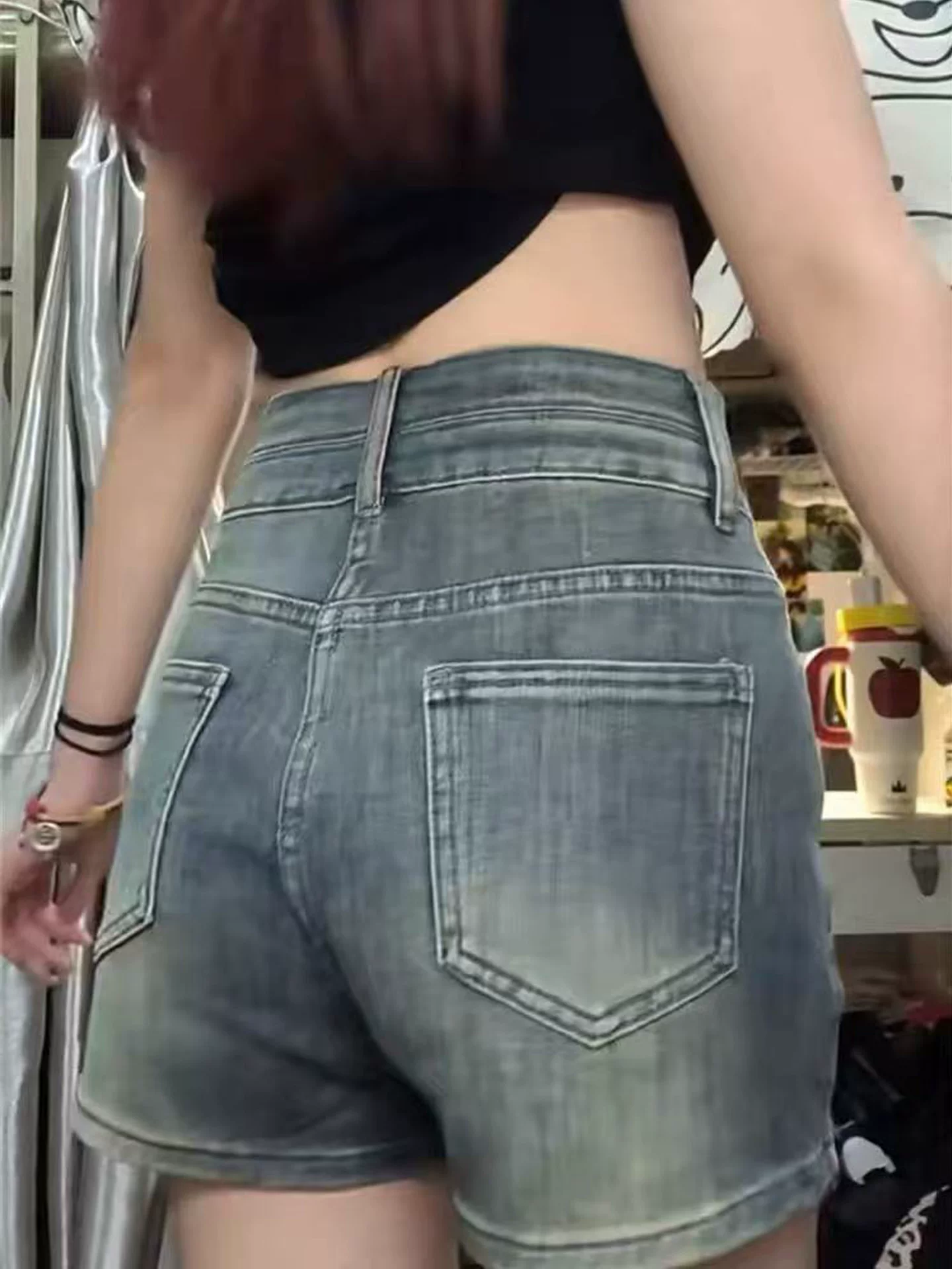- Quần short denim cổ điển kiểu Mỹ dành cho nữ, cỡ lớn mùa hè, cạp cao, co giãn, thon gọn, quần ống rộng dáng chữ A nhỏ nhắn.