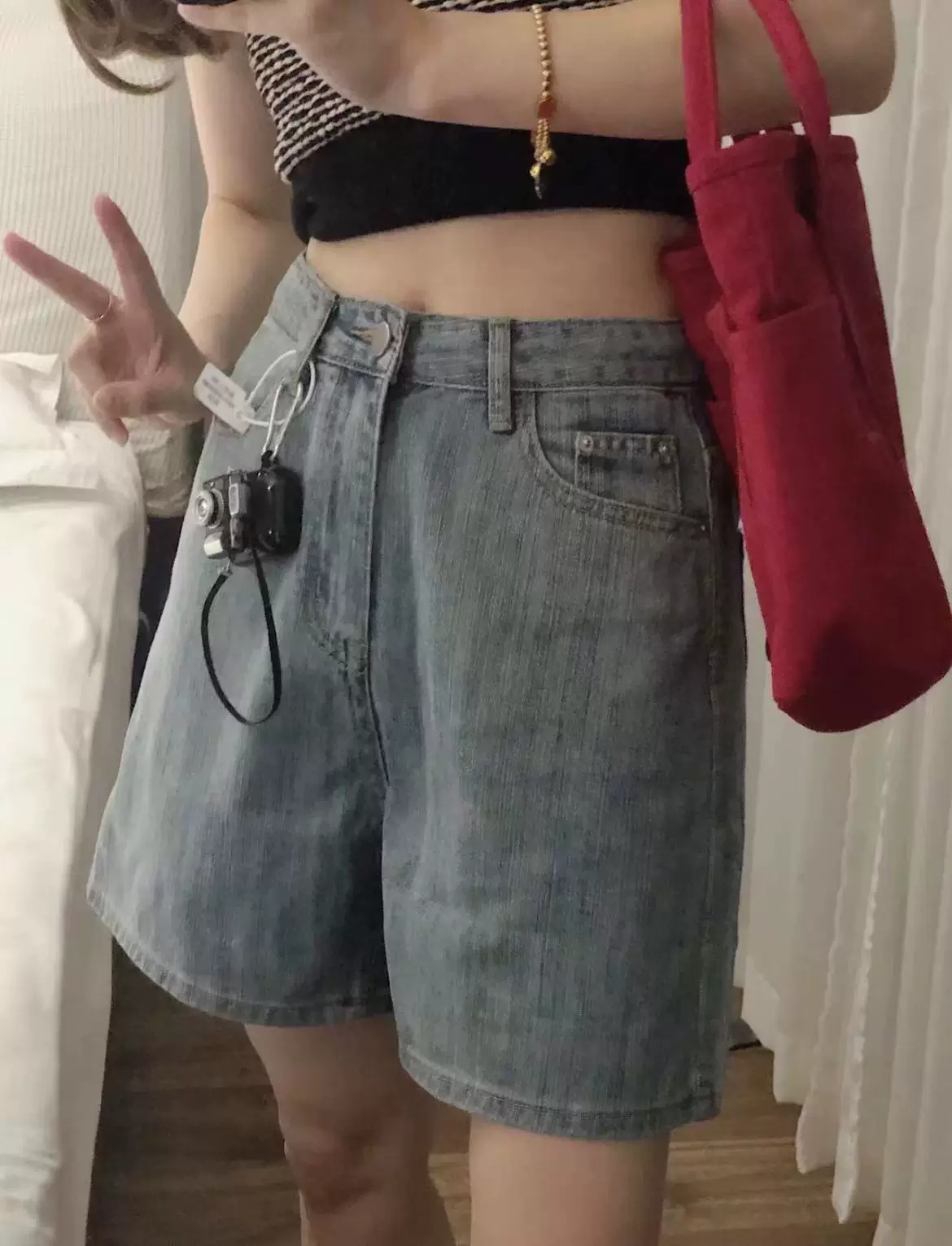 - Quần short denim cỡ lớn dành cho nữ, kiểu dáng mỏng mùa hè, lưng cao, dáng rộng, tôn dáng, quần năm điểm, dáng quả lê, quần ống rộng dài đến giữa bắp chân.