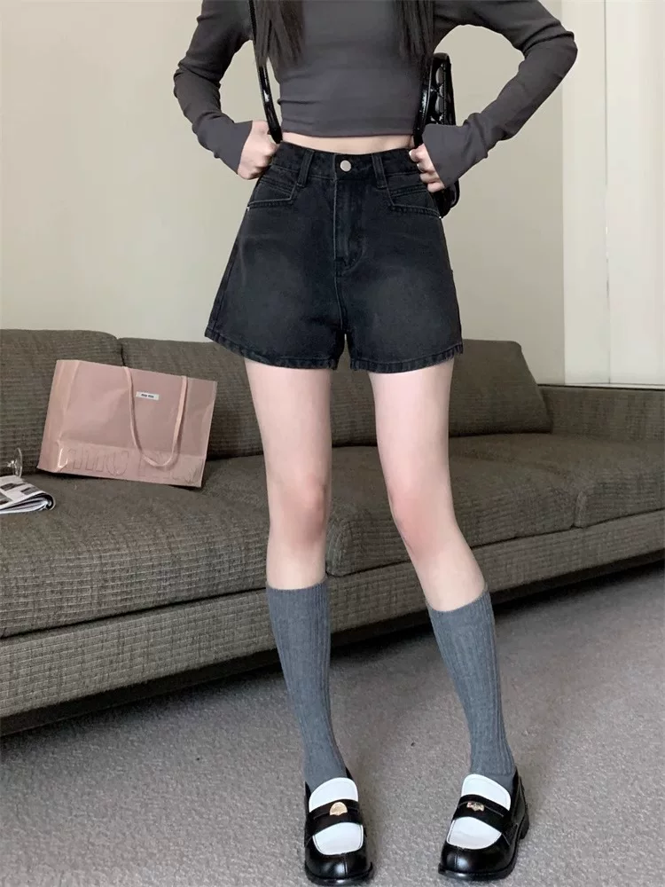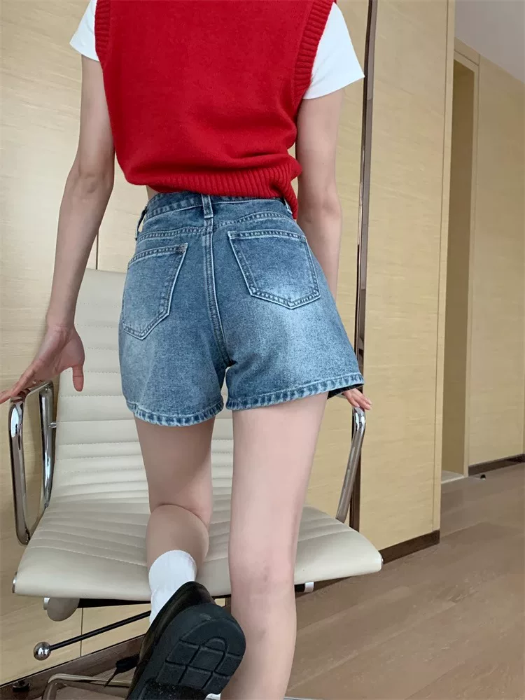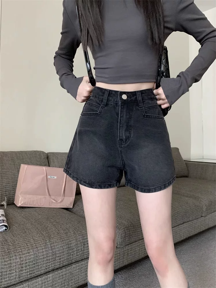Quần short denim dáng lê dành cho nữ, kiểu dáng mỏng mùa hè, cỡ lớn, cạp cao, che hông, quần ống rộng chữ A tôn dáng.