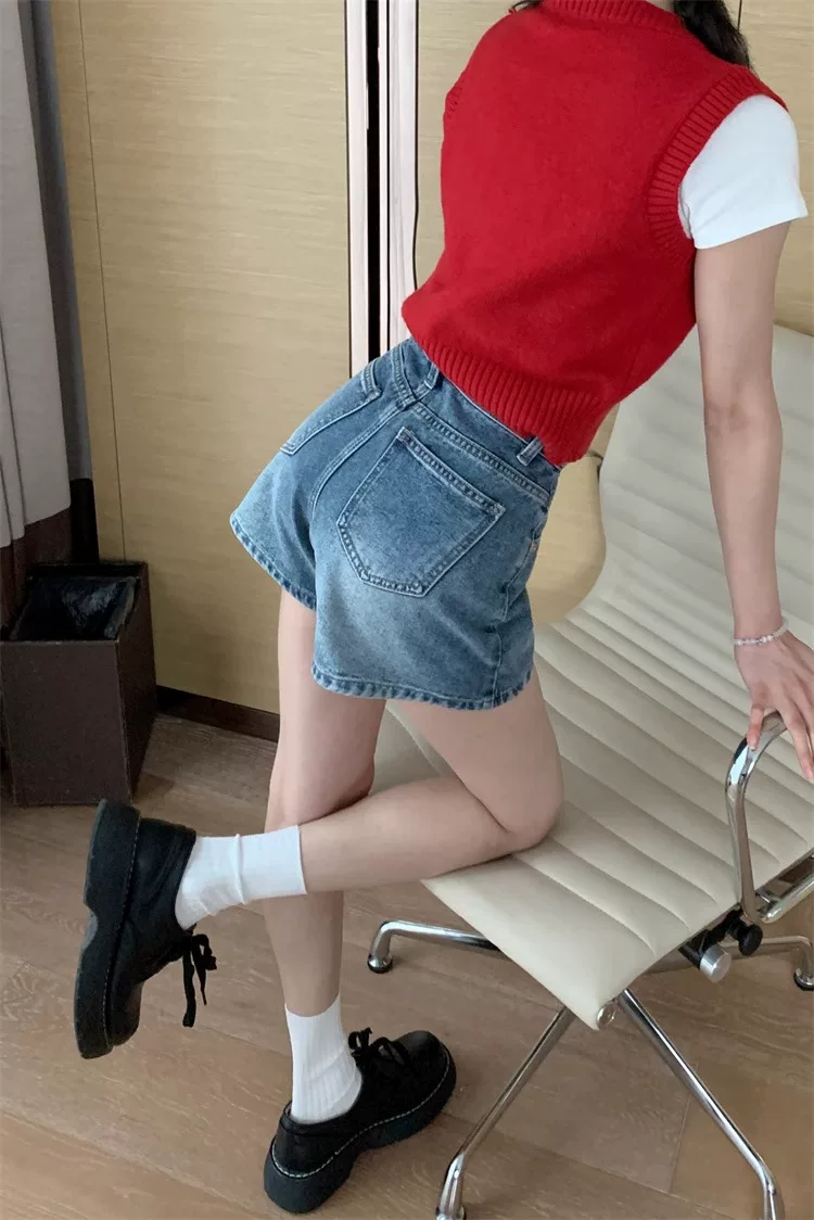 - Quần short denim dáng lê dành cho nữ, kiểu dáng mỏng mùa hè, cỡ lớn, cạp cao, che hông, quần ống rộng chữ A tôn dáng.