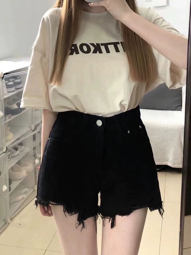 - Quần short denim dáng lê dành cho nữ, size lớn mùa hè, cạp cao, dáng rộng, che hông, tôn dáng, dáng chữ A, rách, quần ống rộng