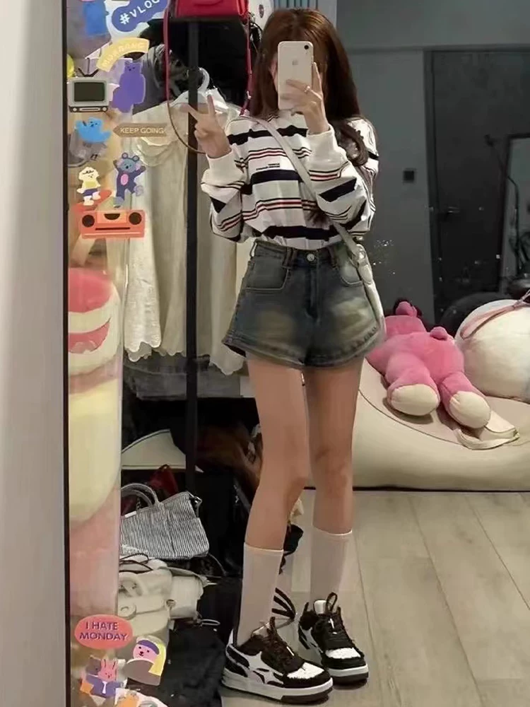 Quần short denim dáng lê dành cho nữ, size lớn mùa hè, kiểu Mỹ cổ điển, cạp cao, co giãn, tôn dáng, dáng chữ A, ống rộng, quần short ngắn