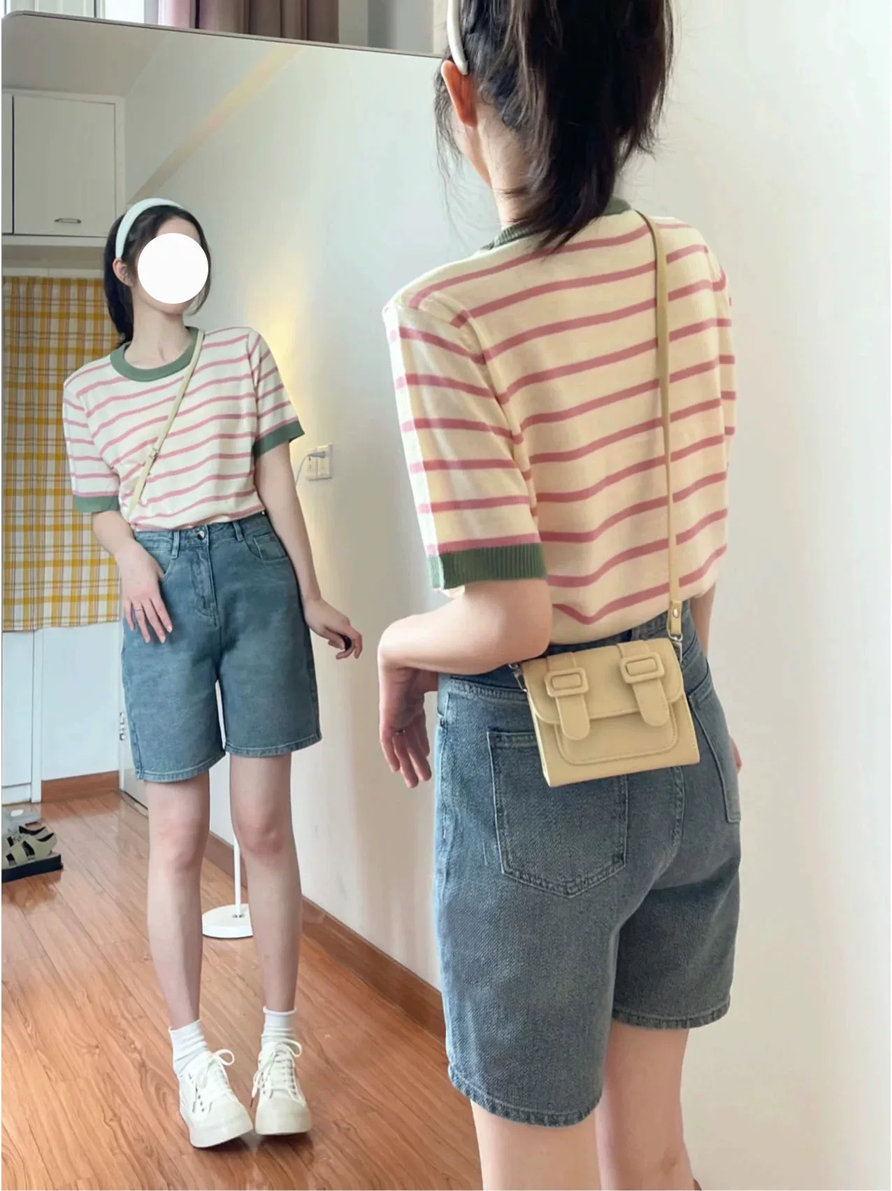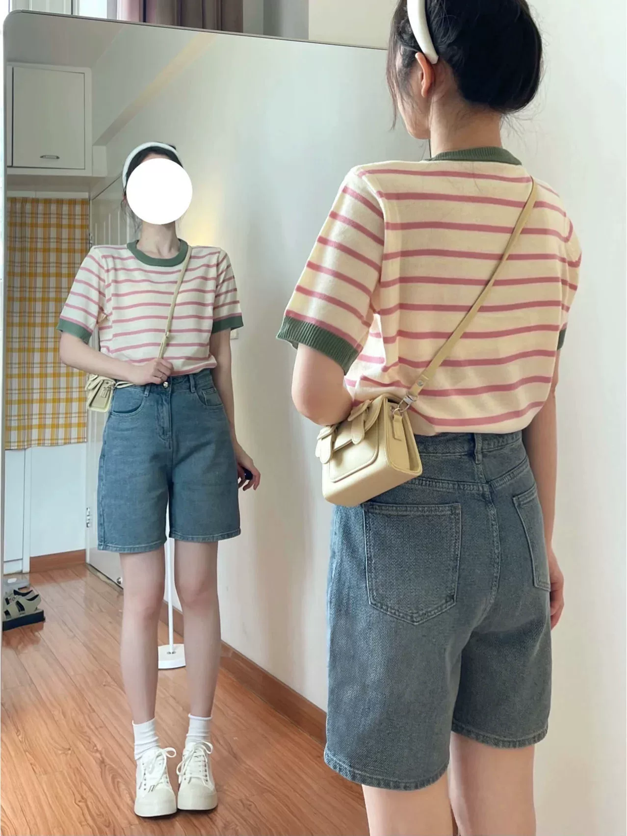 Quần short denim dáng thẳng hình quả lê dành cho nữ, cỡ lớn mùa hè, cạp cao, che hông, quần short dài vừa phải dáng chữ A, dáng rộng, tôn dáng.