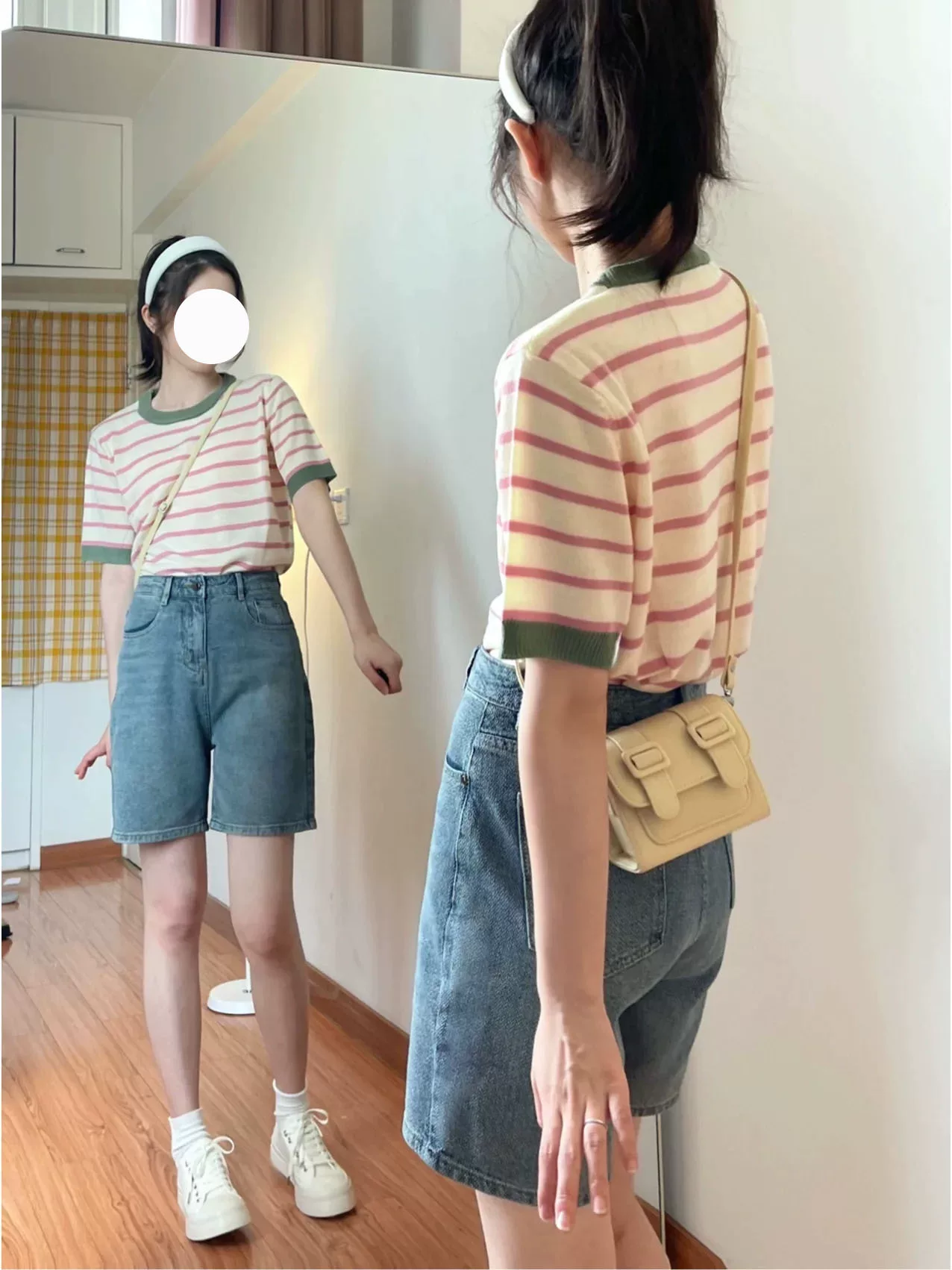 - Quần short denim dáng thẳng hình quả lê dành cho nữ, cỡ lớn mùa hè, cạp cao, che hông, quần short dài vừa phải dáng chữ A, dáng rộng, tôn dáng.