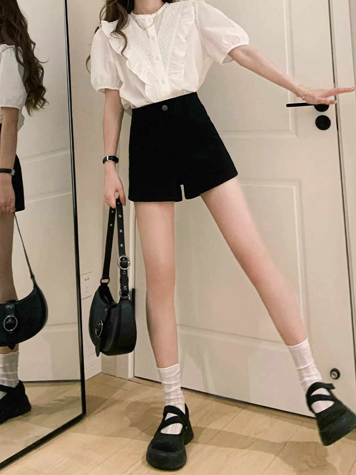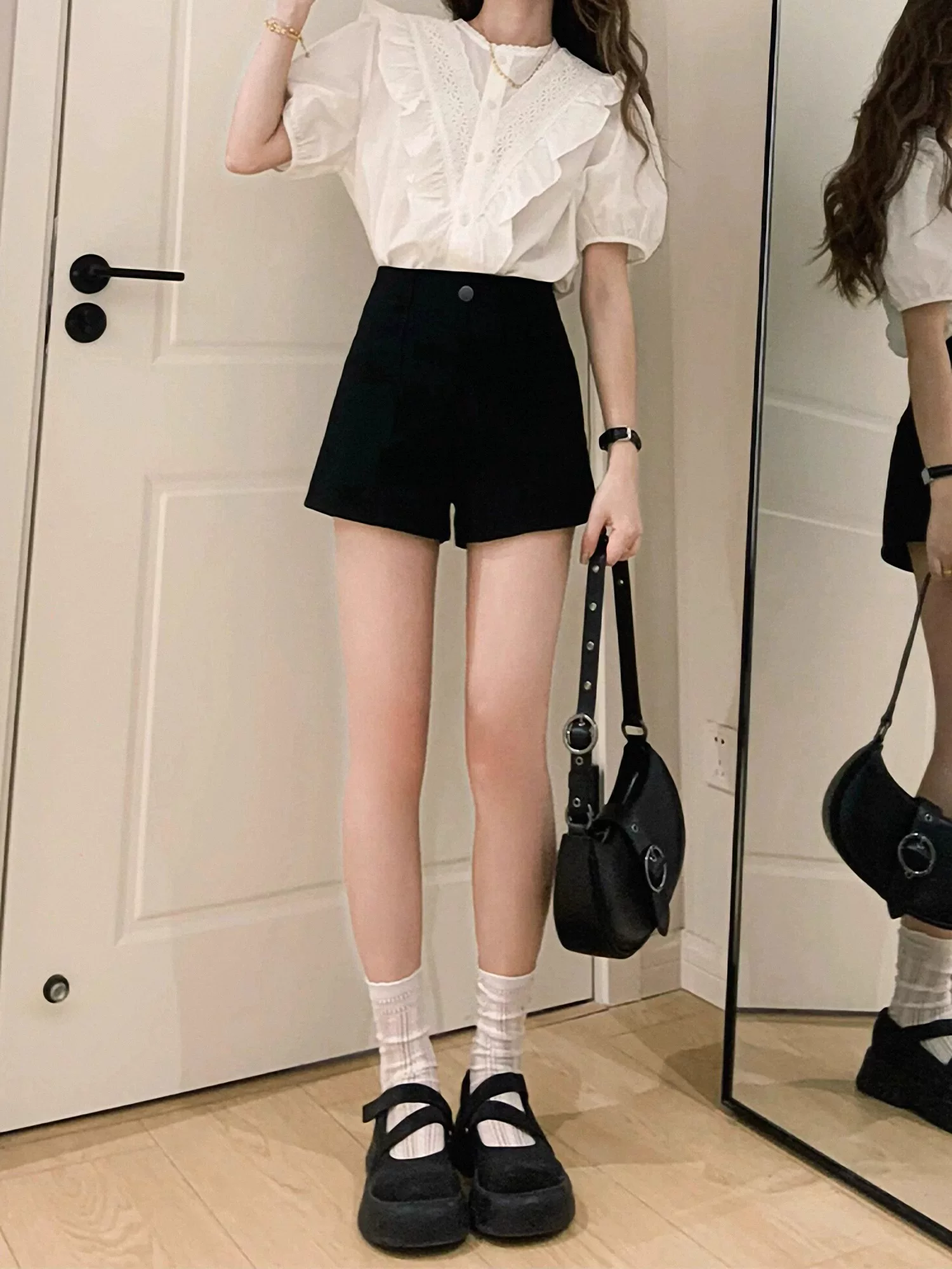 - Quần short denim đen dáng quả lê dành cho nữ, size lớn mùa hè, lưng cao, co giãn, che hông, quần bó sát nâng mông chữ A