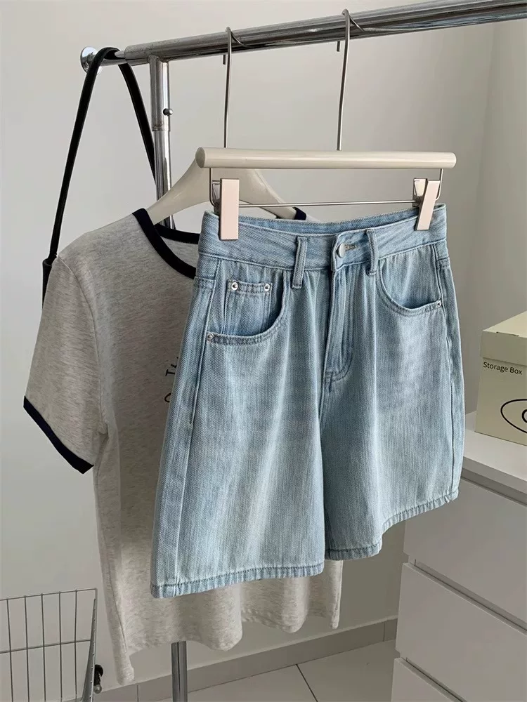 Quần short denim màu sáng dành cho nữ, cỡ lớn mùa hè, kiểu dáng rộng rãi lưng cao hợp thời trang, che hông, quần ống rộng chữ A tôn dáng.