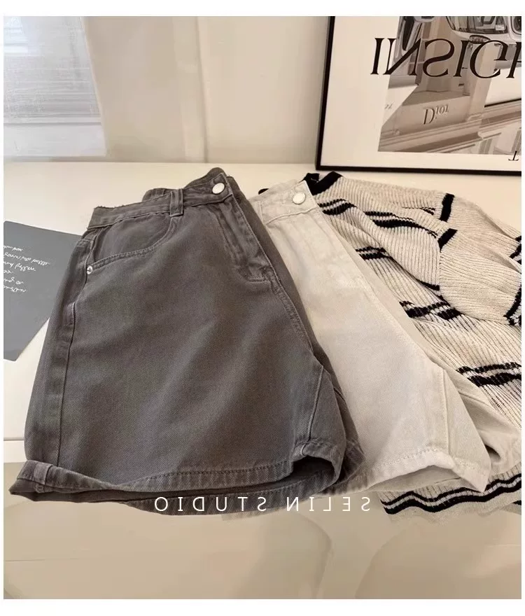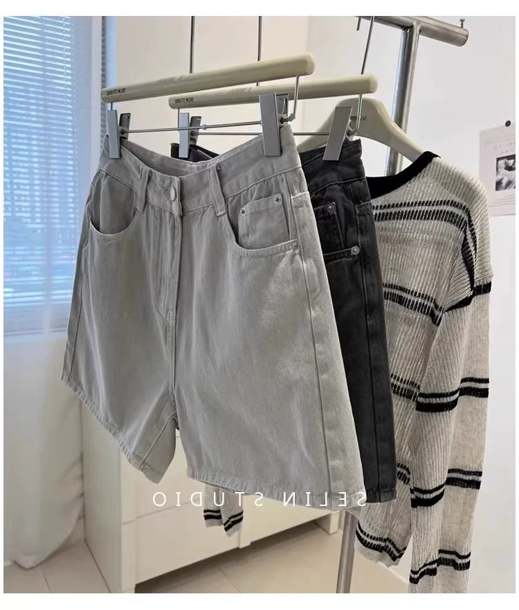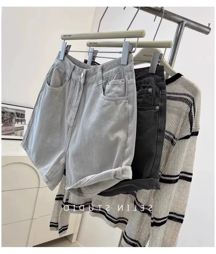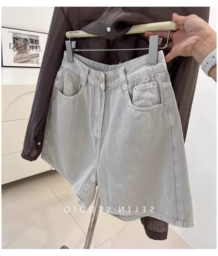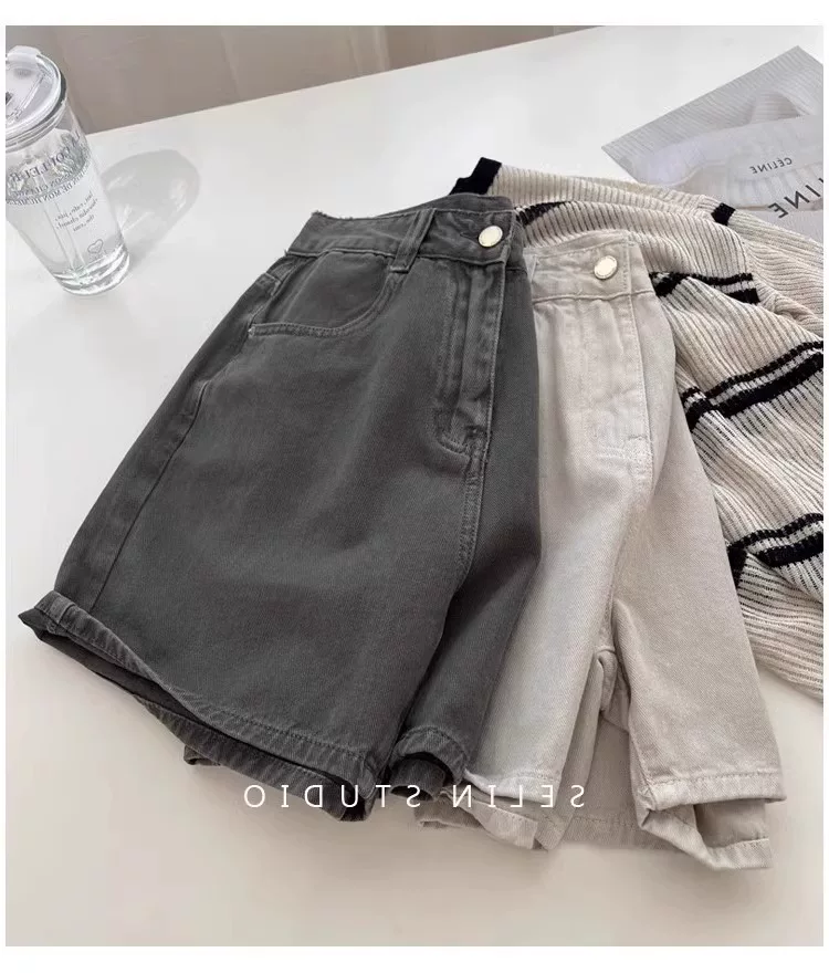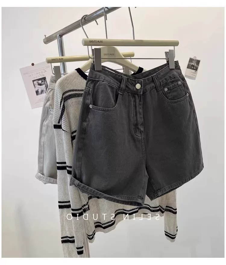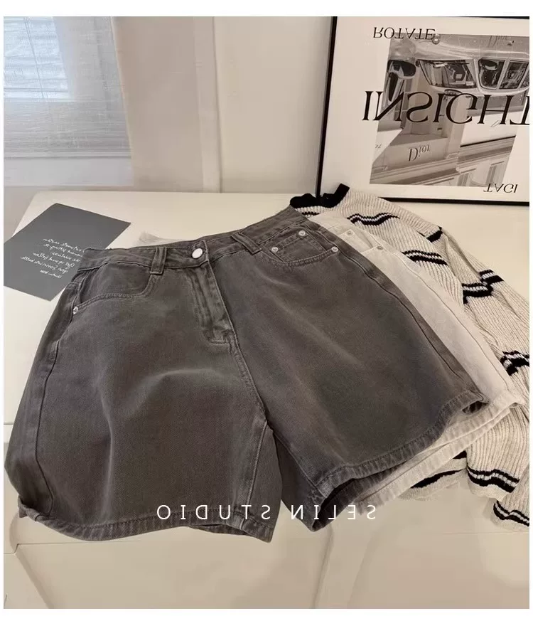 - Quần short denim màu xám đậm dành cho nữ, cỡ lớn mùa hè, lưng cao, dáng rộng, tôn dáng, quần ống rộng chữ A dành cho người có thân hình quả lê.