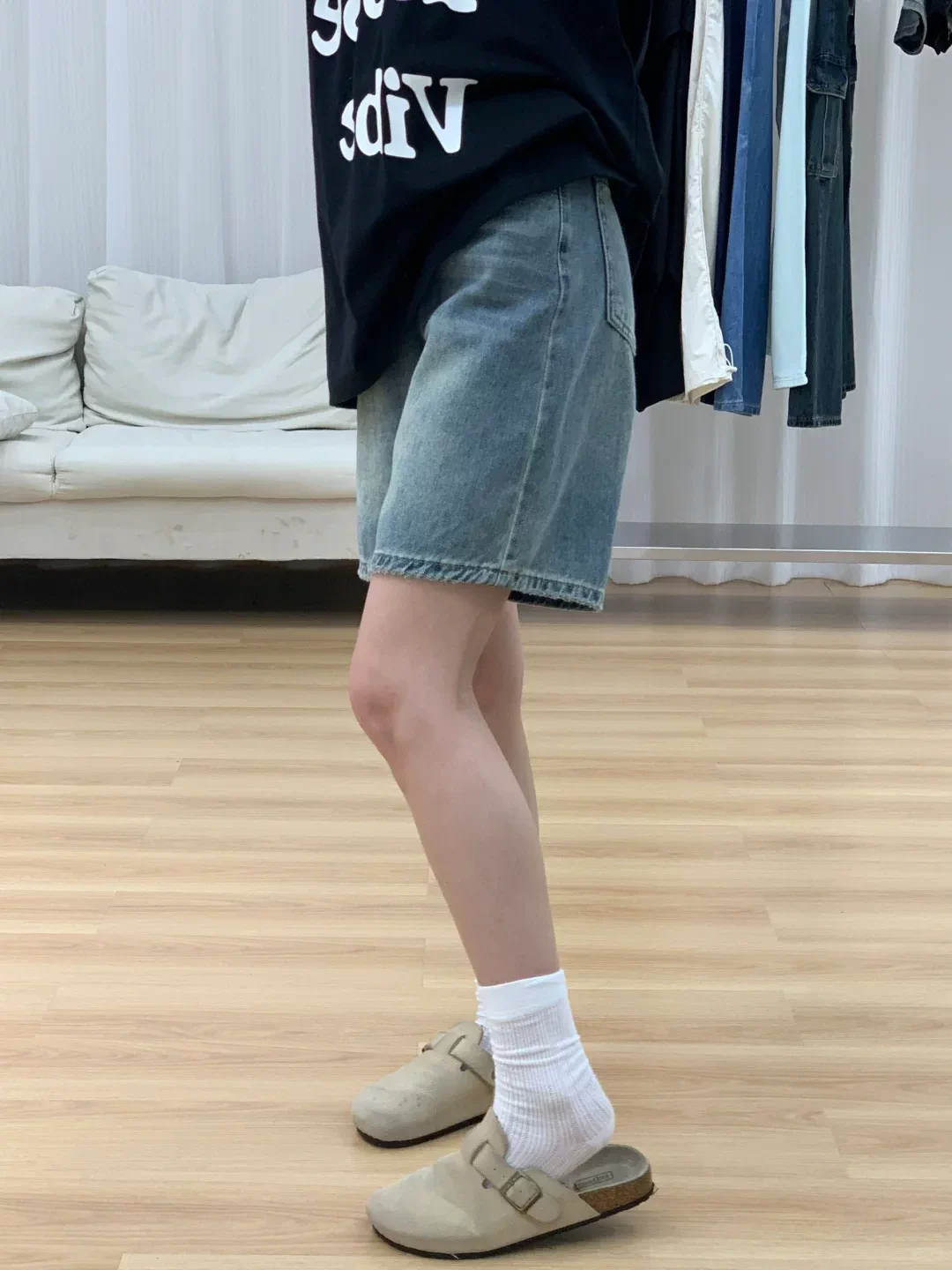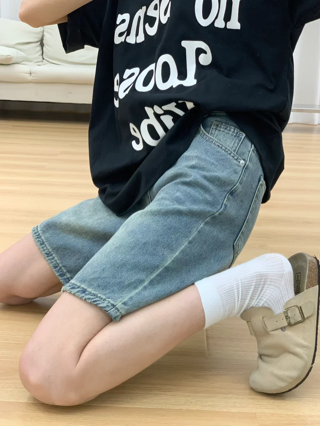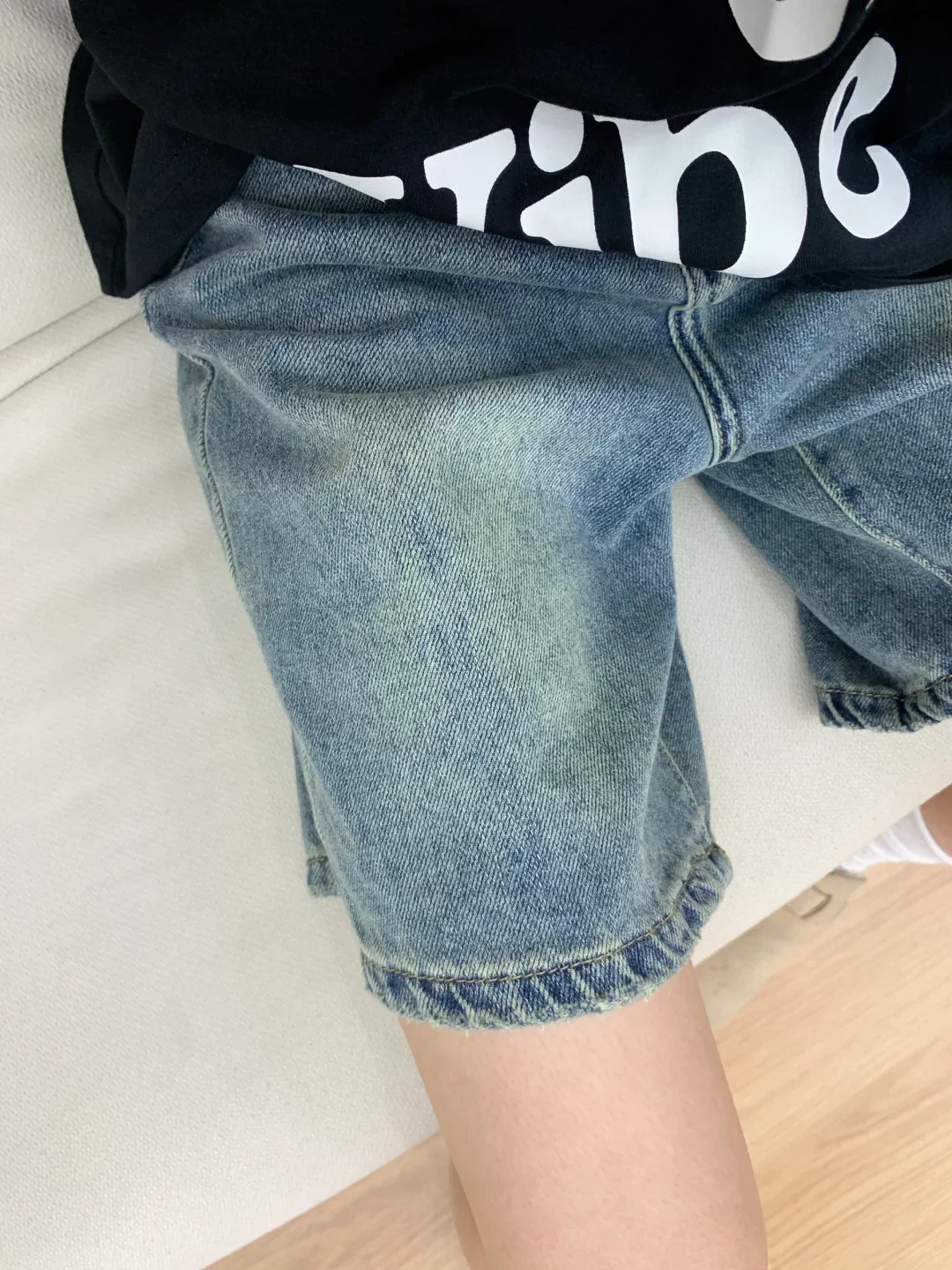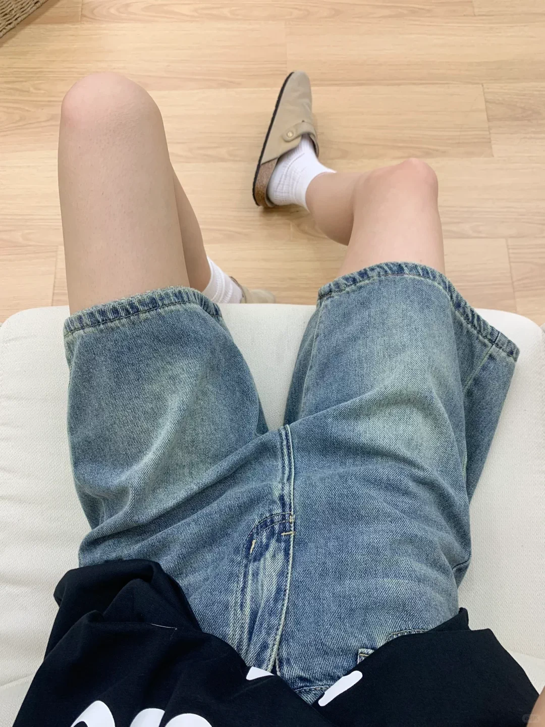 Quần short denim màu xanh cổ điển dành cho nữ, mùa hè 2005, kiểu dáng mỏng, cỡ lớn, lưng cao, che hông, giảm béo, quần short dài vừa phải ống rộng.