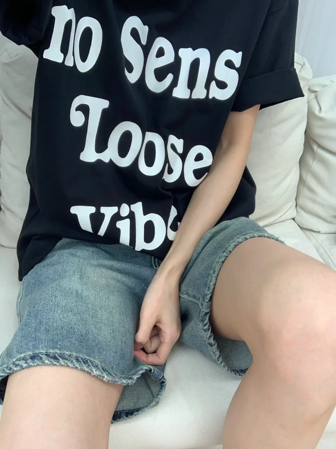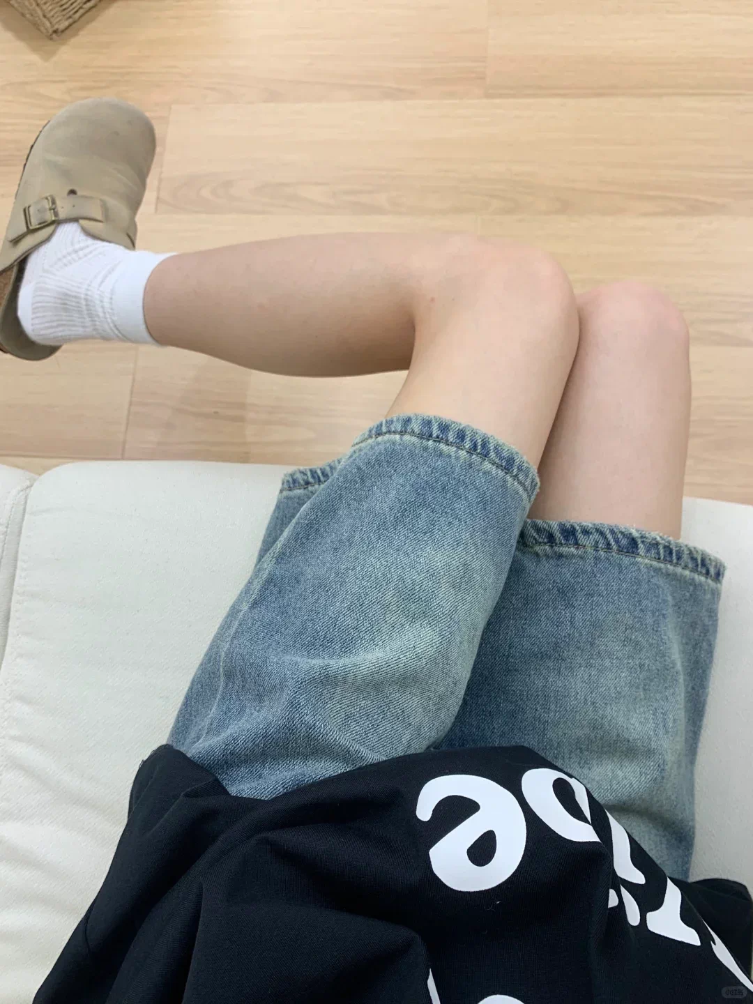 - Quần short denim màu xanh cổ điển dành cho nữ, mùa hè 2005, kiểu dáng mỏng, cỡ lớn, lưng cao, che hông, giảm béo, quần short dài vừa phải ống rộng.