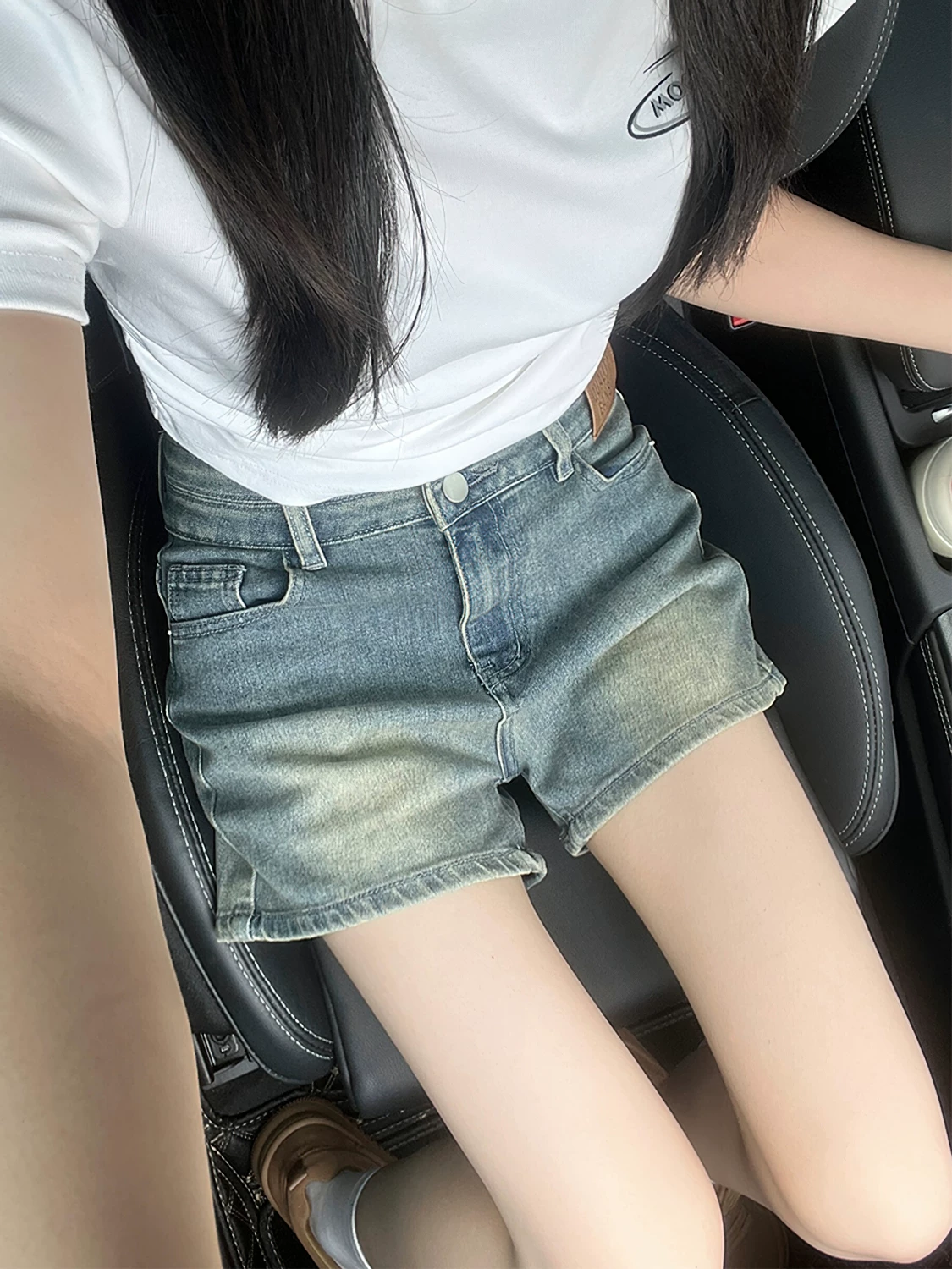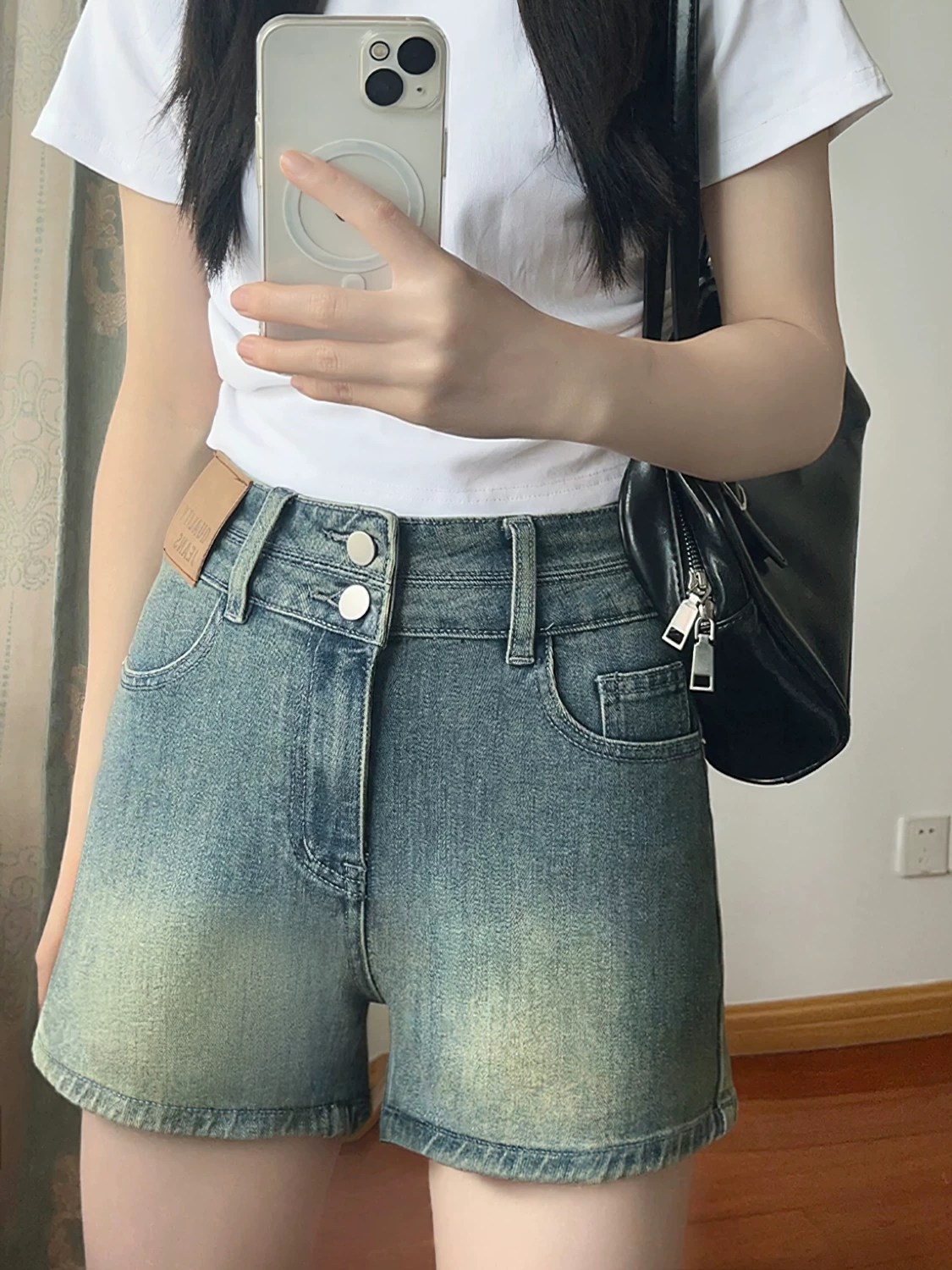 - Quần short denim màu xanh cổ điển hình quả lê dành cho nữ, cỡ lớn mùa hè, lưng cao, co giãn, che hông, quần chữ A giảm béo
