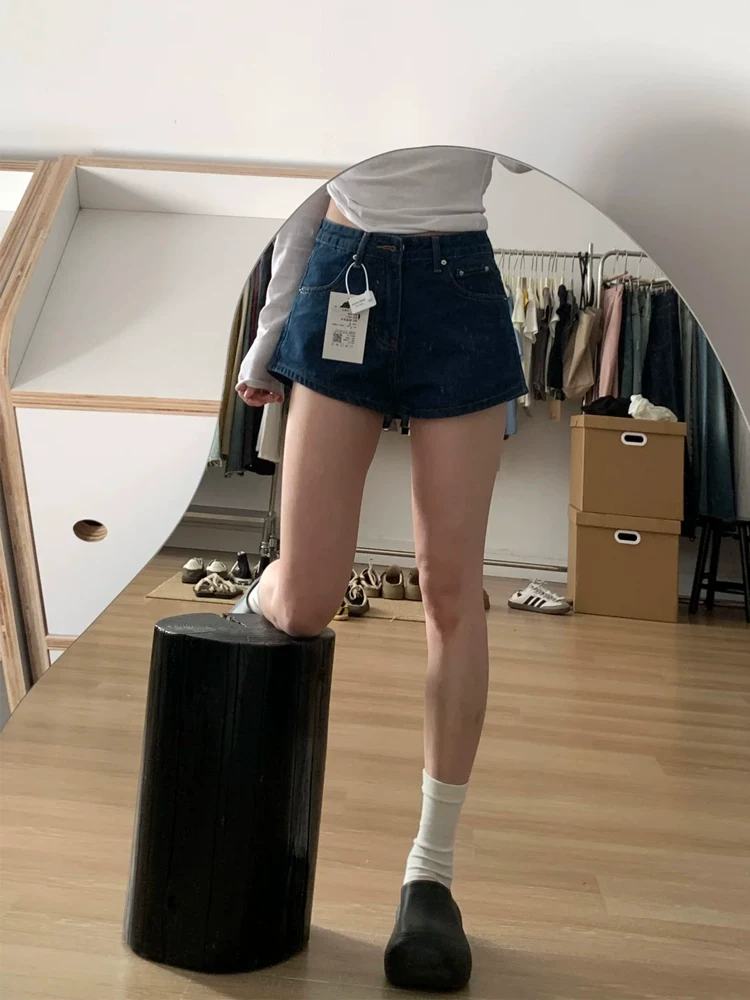 Quần short denim màu xanh đậm dành cho nữ, cỡ lớn mùa hè, lưng cao, che hông, giảm béo, dáng quả lê, quần ống rộng chữ A