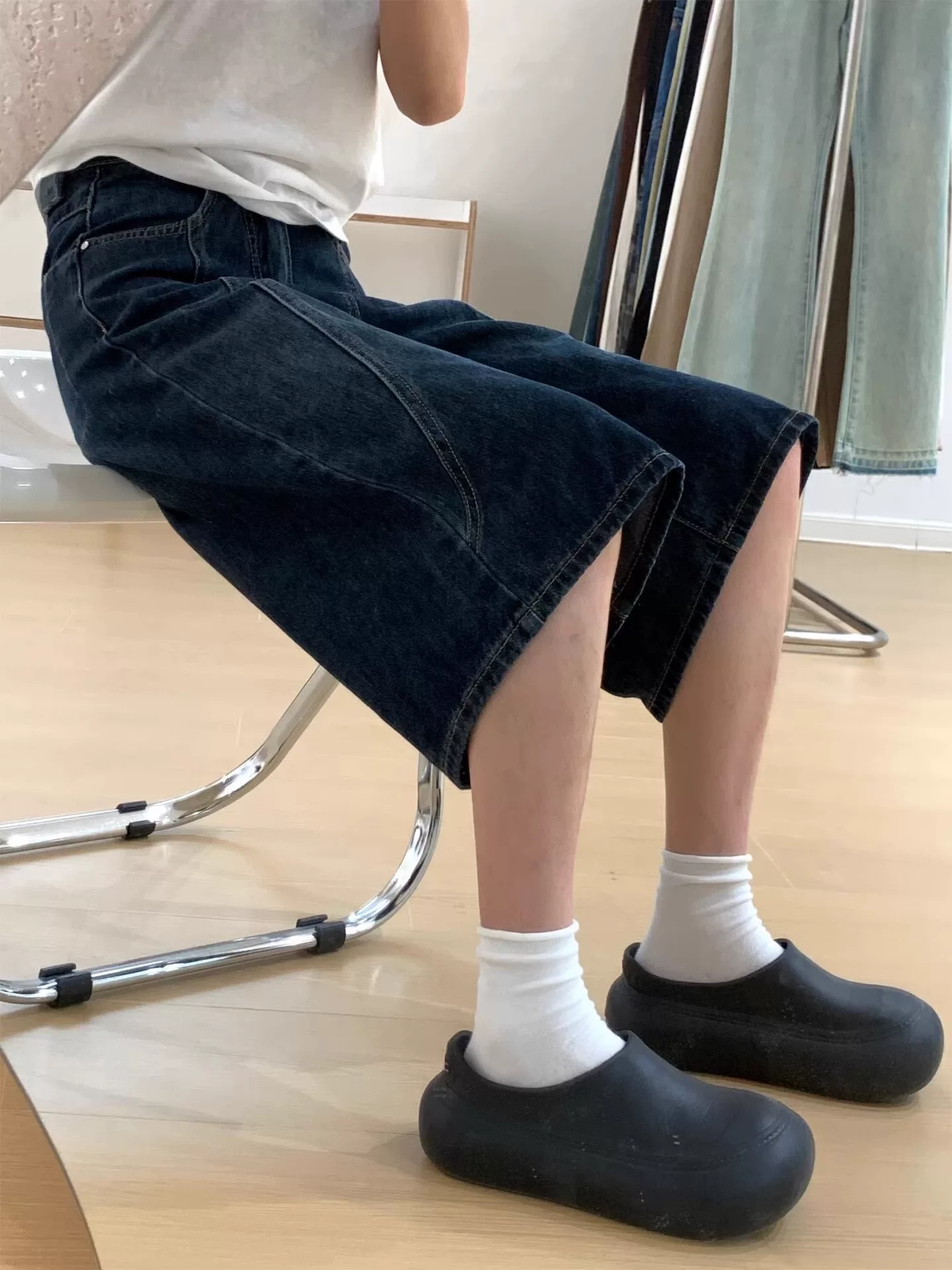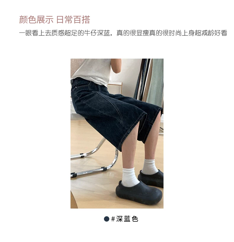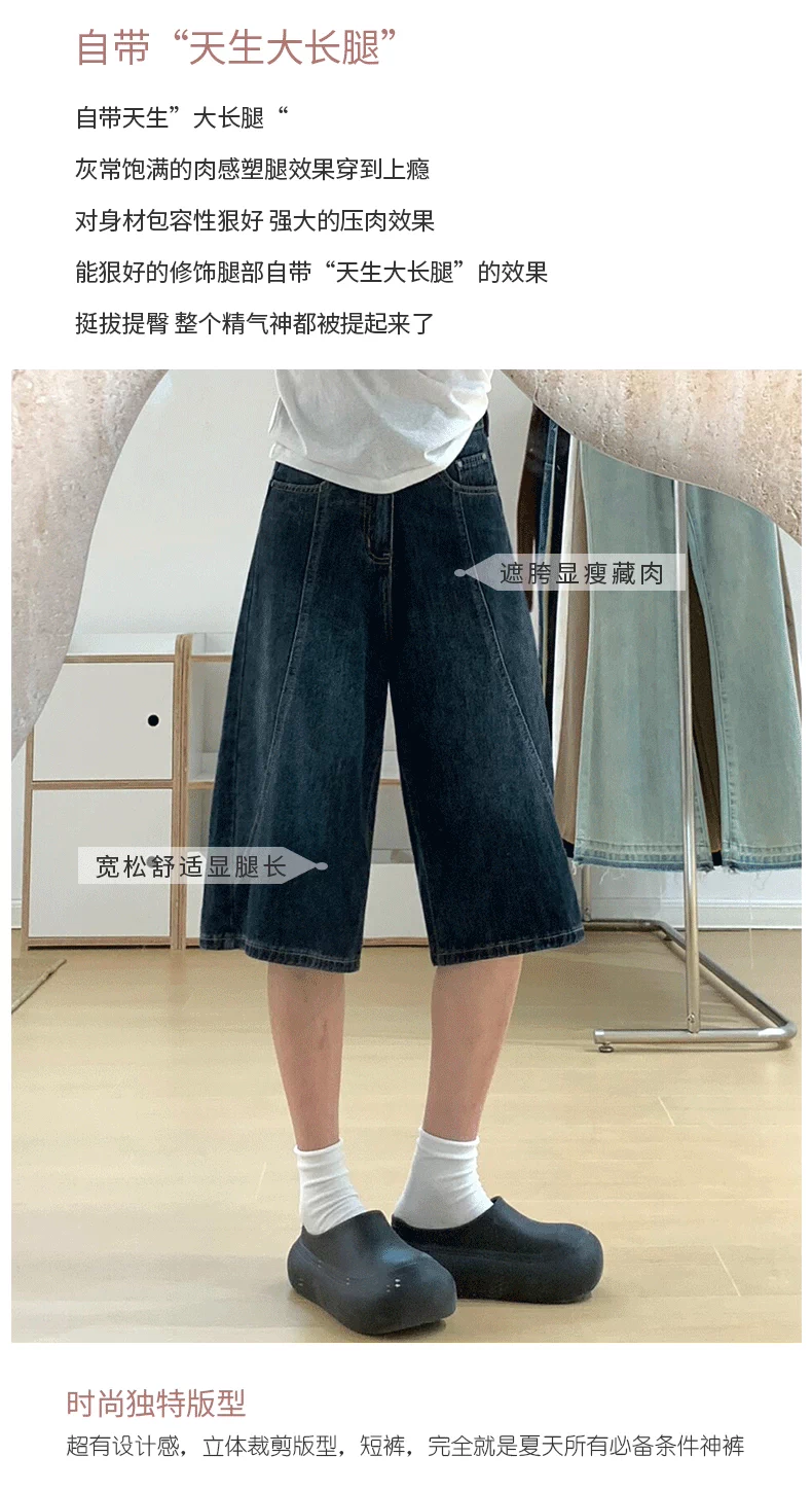 Quần short denim màu xanh đậm dành cho nữ, kiểu dáng mùa hè mới, cỡ lớn, lưng cao, dáng rộng, che hông, giảm béo, quần ống rộng cắt ngắn.