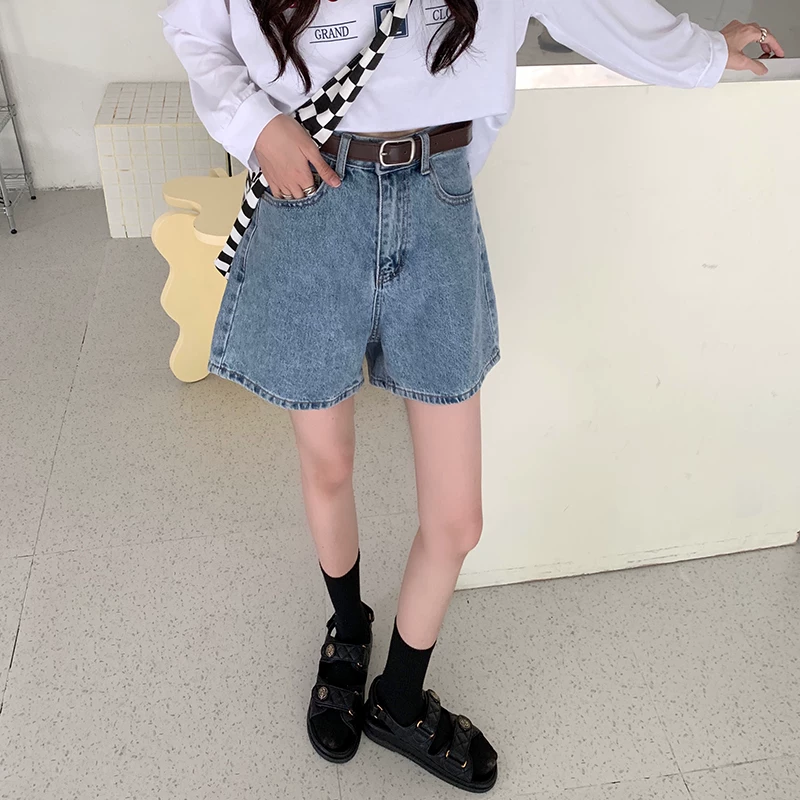 Quần short denim màu xanh nhạt hình quả lê dành cho nữ, quần ống rộng dáng chữ A cạp cao, dáng rộng, tôn dáng, mùa hè, size lớn